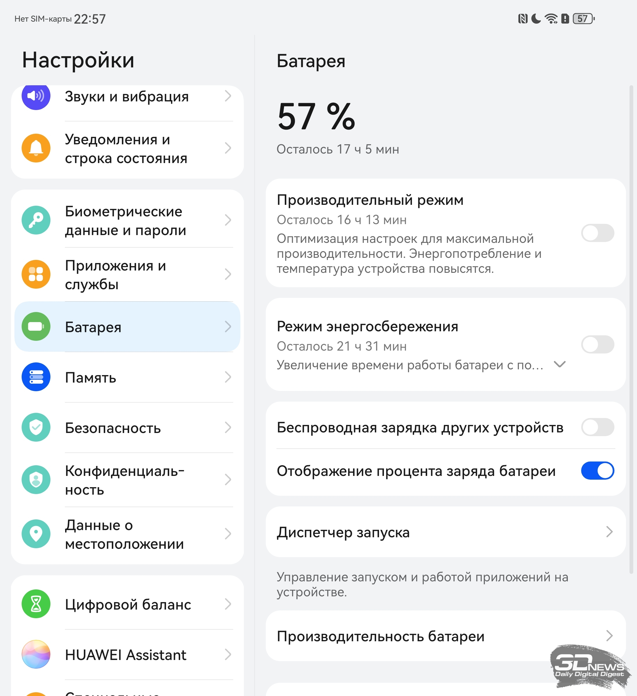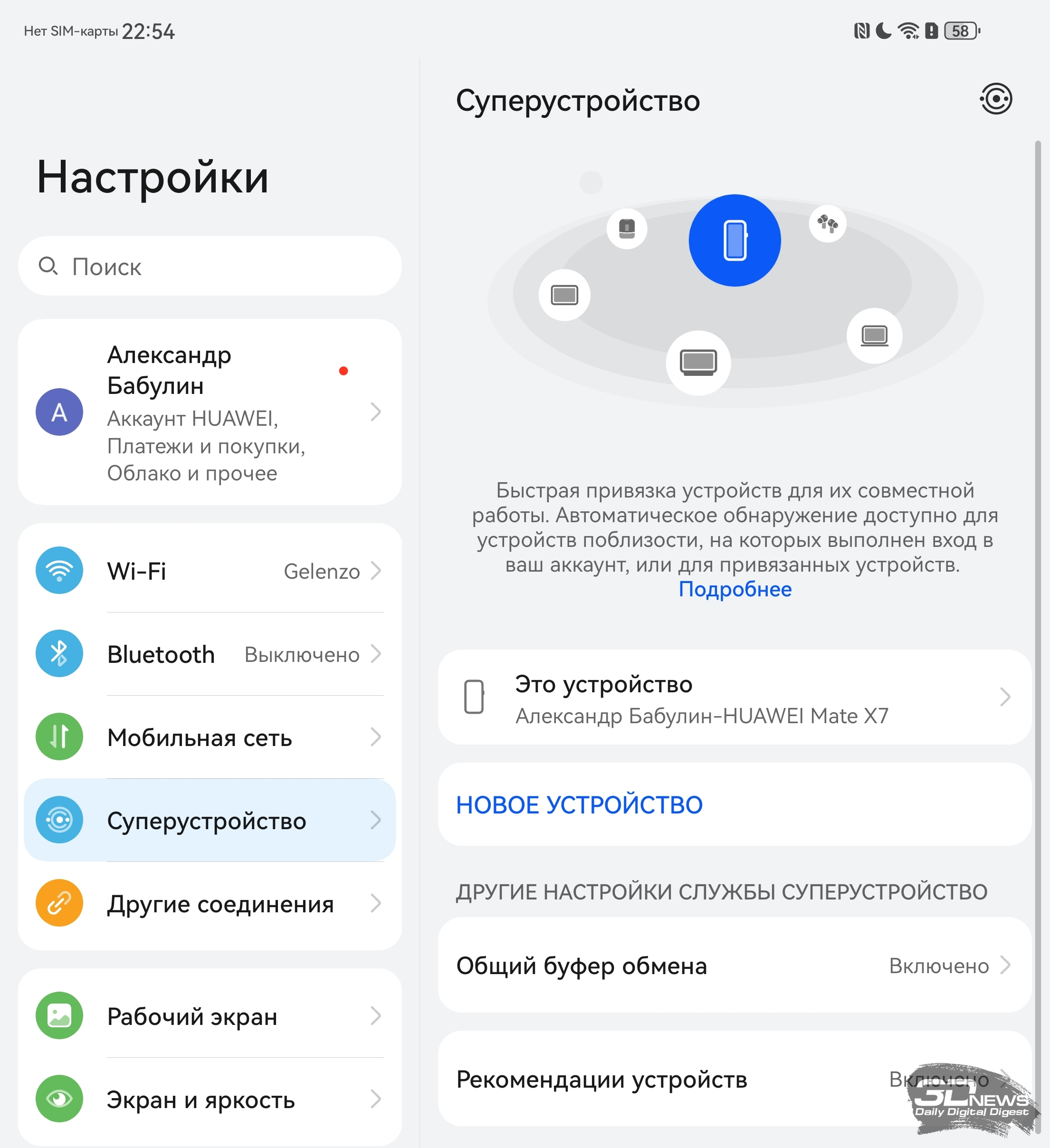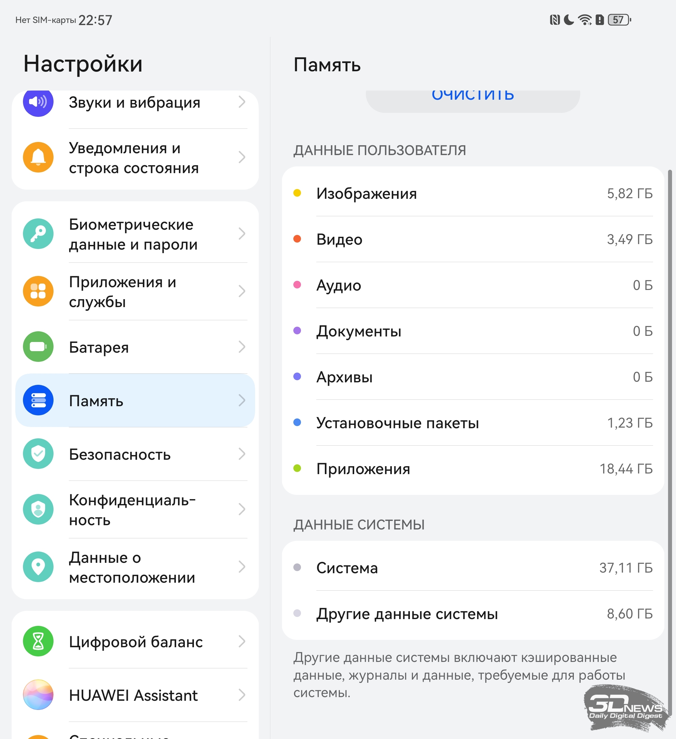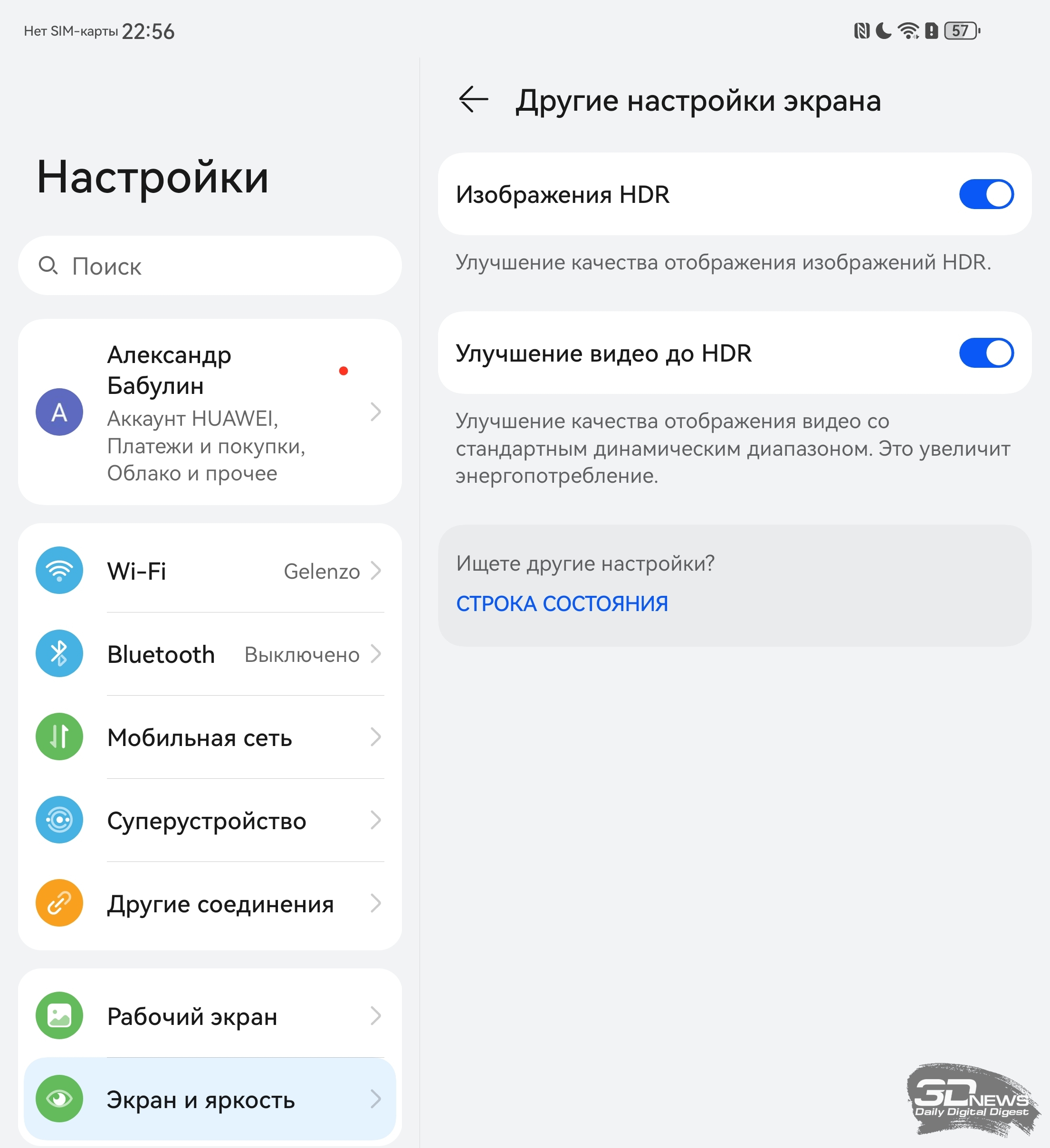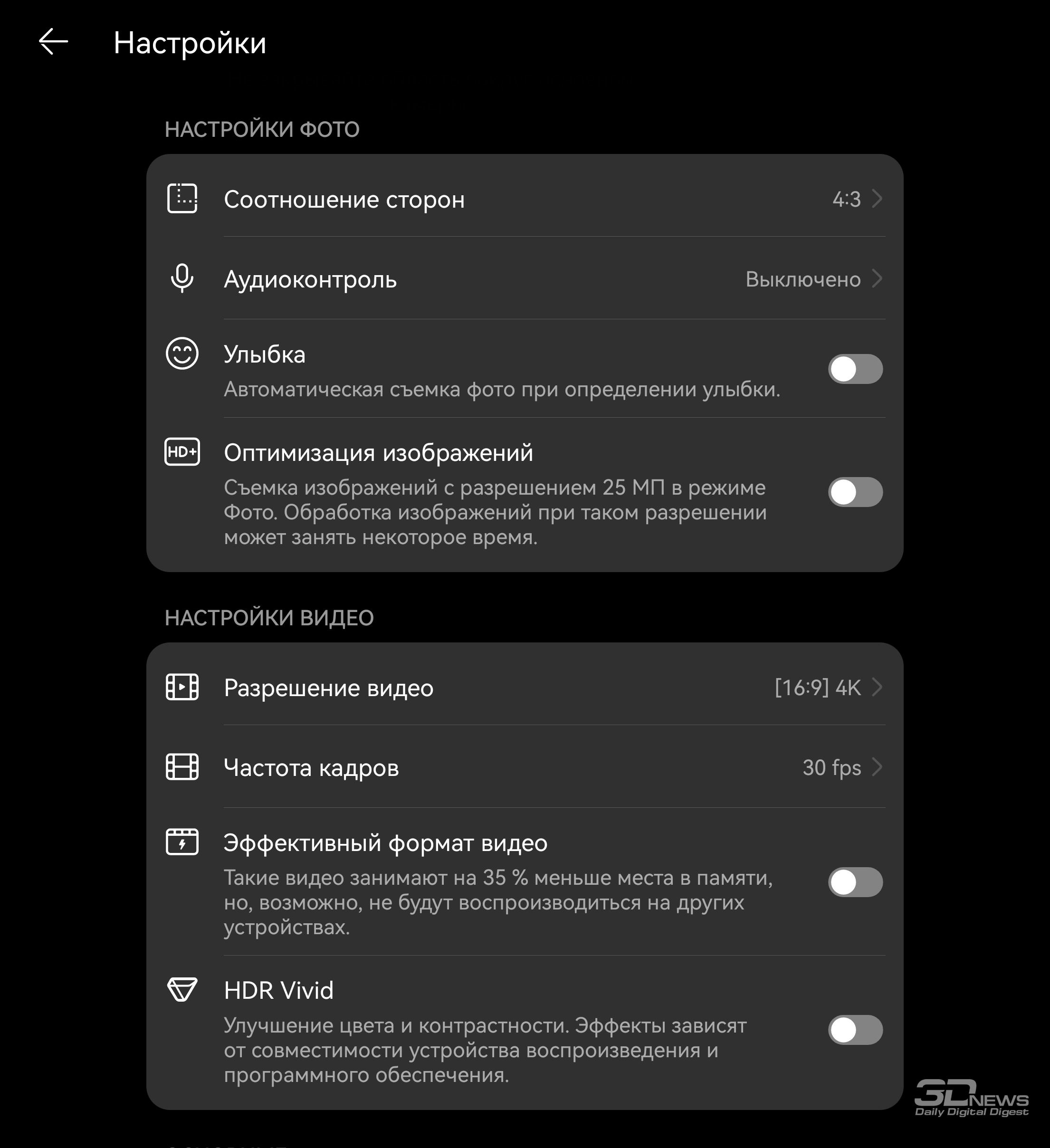 EMUI 15 здесь адаптирована под работу с двумя экранами – смартфон переключается между ними бесшовно, большинство приложений продолжают работу на любом экране и отображаются без рамки. В сложенном состоянии это обычная EMUI, на большом экране, в разложенном состоянии смартфона, оболочка приобретает «планшетный» вид с двумя панелями быстрого доступа, визуально разделенными «складкой»; меню настроек отображается в два столбца, есть режим мультиоконности и режим «картинка в картинке». Также в виде двух столбцов можно выводить часть приложений (режим App Multiplier), но их по-прежнему совсем немного. Есть несколько сценариев работы с «полусогнутым» экраном (на ноутбучный манер) – разделяется приложение камеры (панель управления снизу, окно видоискателя сверху), что помогает делать, к примеру, ночные снимки без штатива, с возможностью разместить смартфон на какой-нибудь поверхности; на экран еще можно вывести погодный виджет или проводить видеовызовы. Также, само собой, есть возможность выводить на «тыльный» экран в сложенном состоянии картинку при работе камеры, тем самым контролируя возможность делать автопортреты. В целом, ничего особенно удивительного в программном обеспечении HUAWEI Mate X7 нет. Кроме одной детали — занимает система в памяти немыслимые 37 Гбайт, и объяснения, почему так много, у меня нет. Сканер отпечатков встроен в клавишу питания. Емкостному сенсору традиционно не хватает площади покрытия, отчего срабатывает он не всегда, но в целом здесь он прямо хорош (для подобного типа сканера) – и по скорости, и по стабильности. Но вот тактильного отклика при срабатывании нет, это не слишком удобно. Идентификация пользователя также доступна и по лицу благодаря фронтальной камере. Напомню, что это значительно менее безопасный способ, но зато работает быстро и почти безотказно. ⇡#Дисплей и звукВнутренний экран HUAWEI Mate X7 получил LTPO OLED-матрицу диагональю 8 дюймов и разрешением 2416 × 2210 точек. Примерный формат — 11:10. Плотность пикселей – 412 ppi, то есть относительно Mate X6 выросла диагональ, но чуть упало разрешение. Впрочем, не критично. Внешний экран тоже получил LTPO OLED-матрицу, но диагональю уже 6,49 дюйма и разрешением 2444 × 1080 точек. Плотность пикселей идентична – 412 ppi. Формат – примерно 23:10. Оба экрана работают с максимальной частотой обновления в 120 Гц, причем они оба – LTPO, то есть умеют менять частоту гибко – в диапазоне от 1 до 120 Гц. Актуальный уровень для флагманского смартфона. Внешний экран выдает статический уровень яркости в 586 кд/м2, внутренний – 575 кд/м2 (напомню, что измерения мы проводим с искусственным светом). Уровень, в целом, не выдающийся, но достаточный, чтобы пользоваться смартфоном без каких-либо проблем при любом освещении, в том числе и в яркий солнечный день. Заявленный уровень пиковой (динамической) яркости для внешнего экрана составляет 3000 кд/м2, для внутреннего – 2500 кд/м2. Эти цифры чуть подросли в сравнении с Mate X6, но измеренный статический уровень примерно тот же — обошлось без прорыва, но он здесь и не требовался. Набор настроек дисплея привычен для устройств с EMUI, но у складного смартфона HUAWEI здесь также можно регулировать параметры, связанные со складным экраном: разделение экрана, формат тех или иных приложений, калибровка приложений. Остальные настройки знакомы: светлый и темный режимы отображения интерфейса, режим за