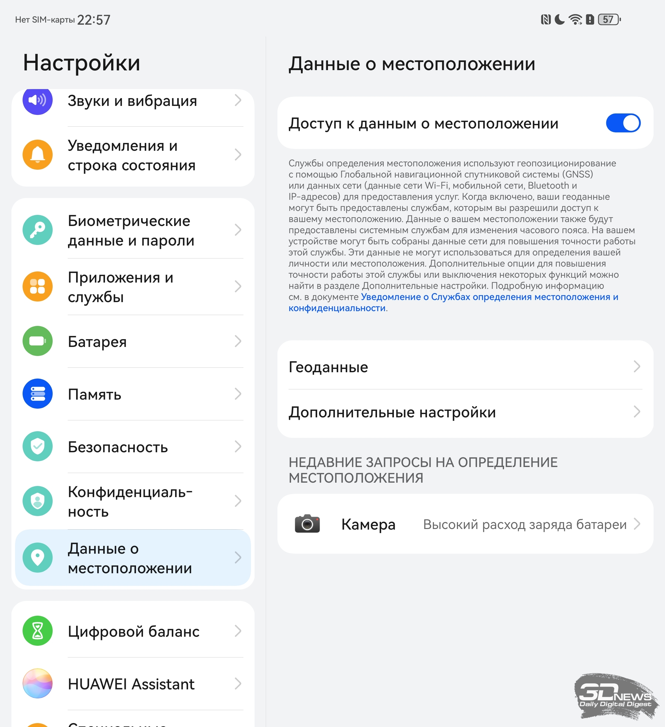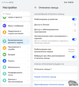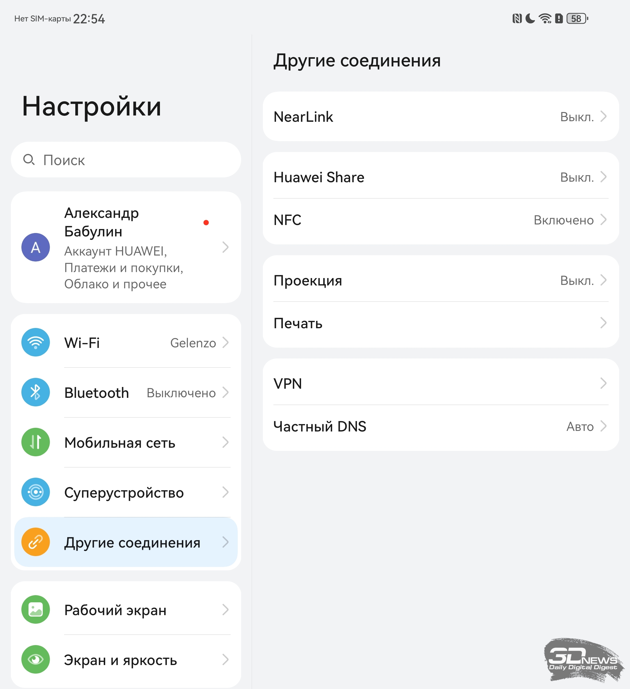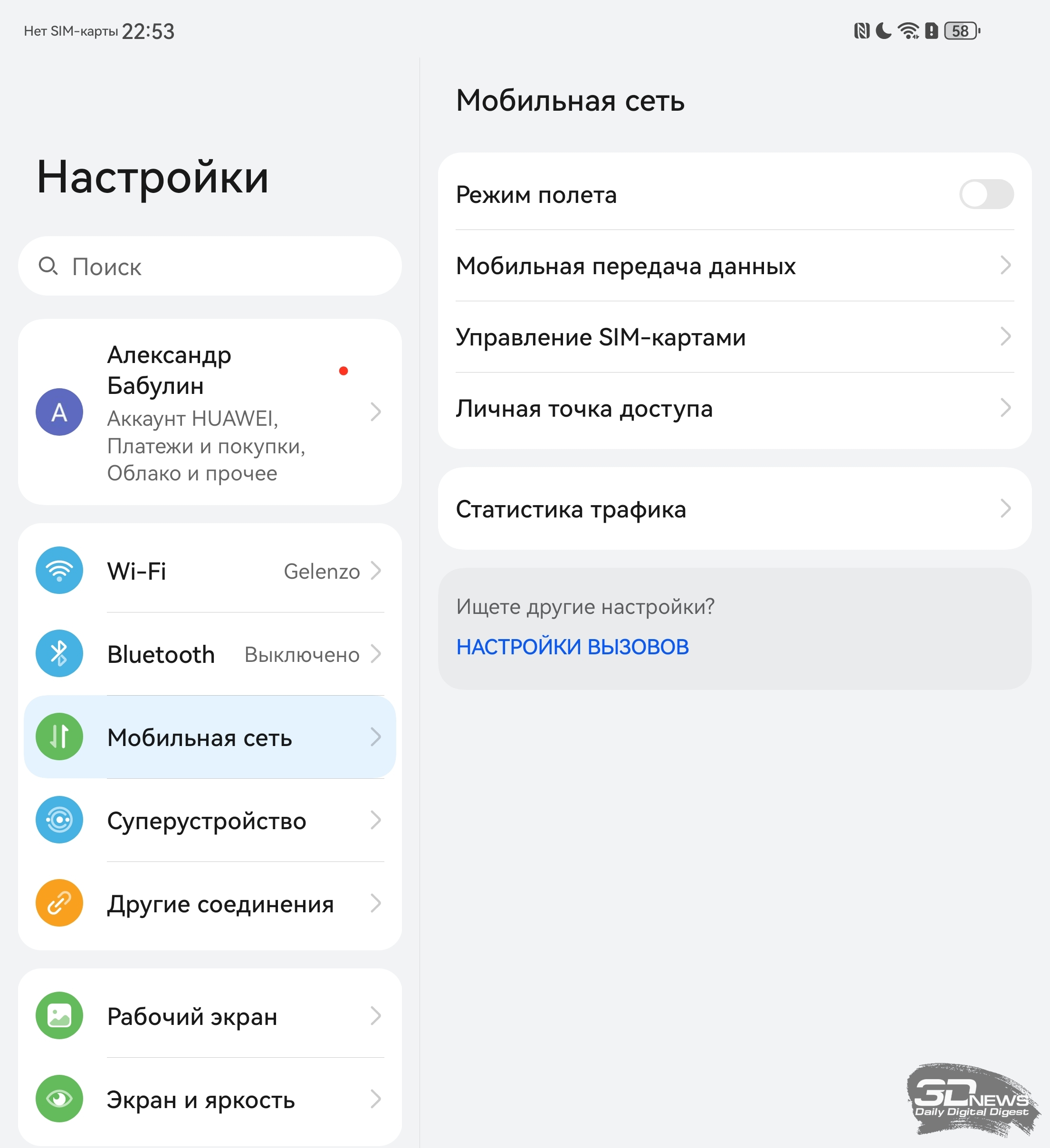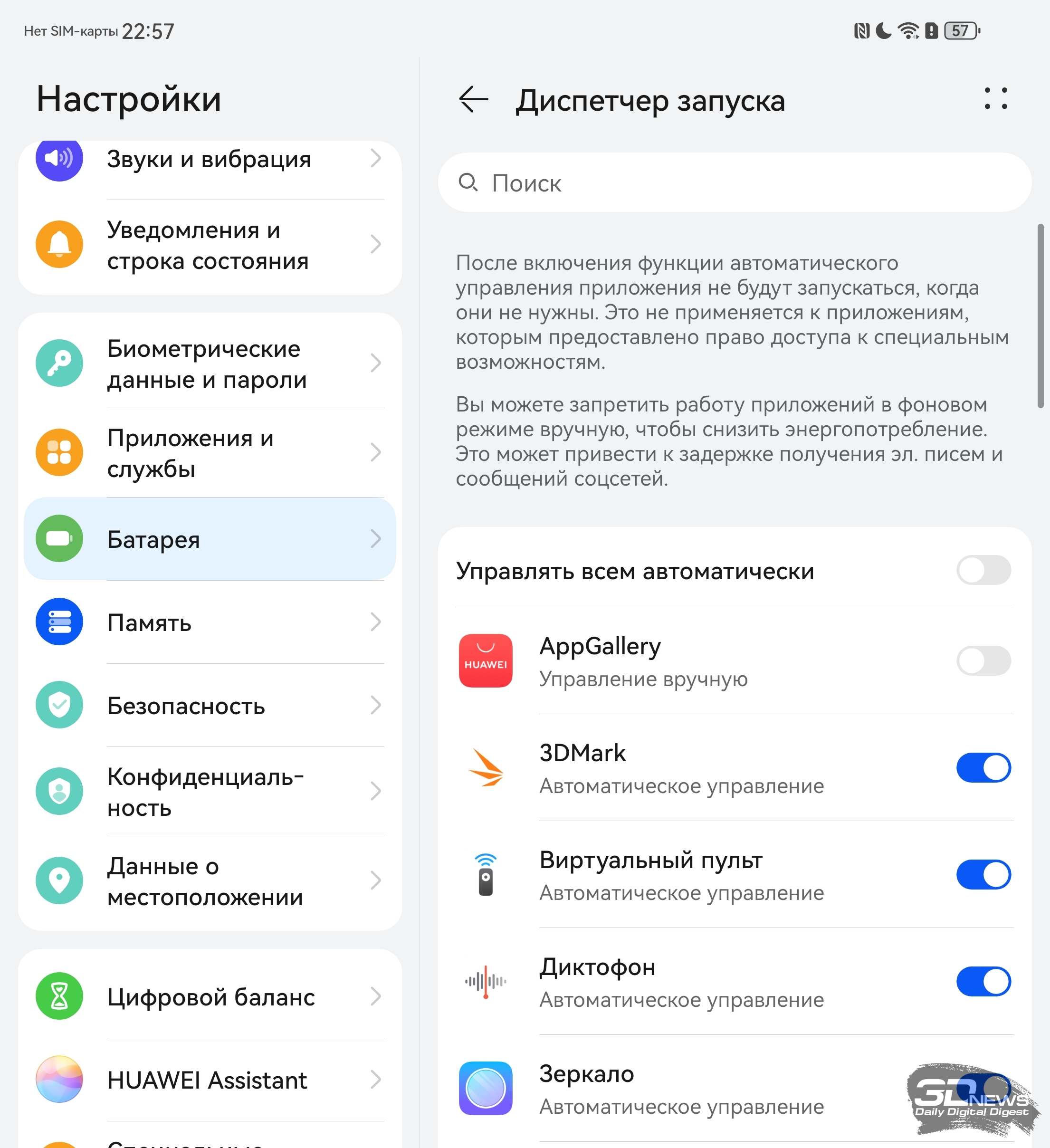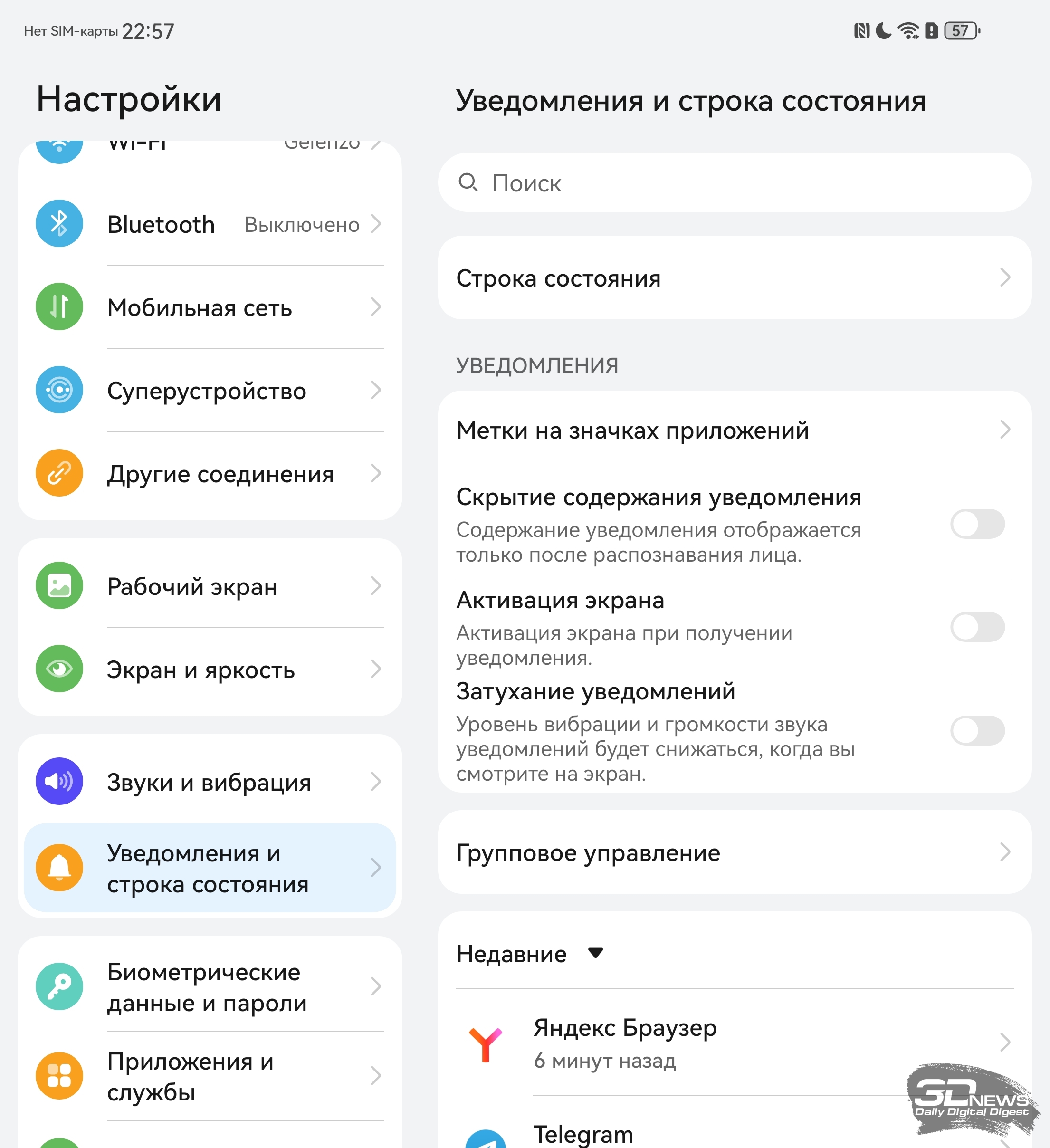 EMUI 15 здесь адаптирована под работу с двумя экранами – смартфон переключается между ними бесшовно, большинство приложений продолжают работу на любом экране и отображаются без рамки. В сложенном состоянии это обычная EMUI, на большом экране, в разложенном состоянии смартфона, оболочка приобретает «планшетный» вид с двумя панелями быстрого доступа, визуально разделенными «складкой»; меню настроек отображается в два столбца, есть режим мультиоконности и режим «картинка в картинке». Также в виде двух столбцов можно выводить часть приложений (режим App Multiplier), но их по-прежнему совсем немного. Есть несколько сценариев работы с «полусогнутым» экраном (на ноутбучный манер) – разделяется приложение камеры (панель управления снизу, окно видоискателя сверху), что помогает делать, к примеру, ночные снимки без штатива, с возможностью разместить смартфон на какой-нибудь поверхности; на экран еще можно вывести погодный виджет или проводить видеовызовы. Также, само собой, есть возможность выводить на «тыльный» экран в сложенном состоянии картинку при работе камеры, тем самым контролируя возможность делать автопортреты. В целом, ничего особенно удивительного в программном обеспечении HUAWEI Mate X7 нет. Кроме одной детали — занимает система в памяти немыслимые 37 Гбайт, и объяснения, почему так много, у меня нет. Сканер отпечатков встроен в клавишу питания. Емкостному сенсору традиционно не хватает площади покрытия, отчего срабатывает он не всегда, но в целом здесь он прямо хорош (для подобного типа сканера) – и по скорости, и по стабильности. Но вот тактильного отклика при срабатывании нет, это не слишком удобно. Идентификация пользователя также доступна и по лицу благодаря фронтальной камере. Напомню, что это значительно менее безопасный способ, но зато работает быстро и почти безотказно. ⇡#Дисплей и звукВнутренний экран HUAWEI Mate X7 получил LTPO OLED-матрицу диагональю 8 дюймов и разрешением 2416 × 2210 точек. Примерный формат — 11:10. Плотность пикселей – 412 ppi, то есть относительно Mate X6 выросла диагональ, но чуть упало разрешение. Впрочем, не критично. Внешний экран тоже получил LTPO OLED-матрицу, но диагональю уже 6,49 дюйма и разрешением 2444 × 1080 точек. Плотность пикселей идентична – 412 ppi. Формат – примерно 23:10. Оба экрана работают с максимальной частотой обновления в 120 Гц, причем они оба – LTPO, то есть умеют менять частоту гибко – в диапазоне от 1 до 120 Гц. Актуальный уровень для флагманского смартфона. Внешний экран выдает статический уровень яркости в 586 кд/м2, внутренний – 575 кд/м2 (напомню, что измерения мы проводим с искусственным светом). Уровень, в целом, не выдающийся, но достаточный, чтобы пользоваться смартфоном без каких-либо проблем при любом освещении, в том числе и в яркий солнечный день. Заявленный уровень пиковой (динамической) яркости для внешнего экрана составляет 3000 кд/м2, для внутреннего – 2500 кд/м2. Эти цифры чуть подросли в сравнении с Mate X6, но измеренный статический уровень примерно тот же — обошлось без прорыва, но он здесь и не требовался. Набор настроек дисплея привычен для устройств с EMUI, но у складного смартфона HUAWEI здесь также можно регулировать параметры, связанные со складным экраном: разделение экрана, формат тех или иных приложений, калибровка приложений. Остальные настройки знакомы: светлый и темный режимы отображения интерфейса, режим за