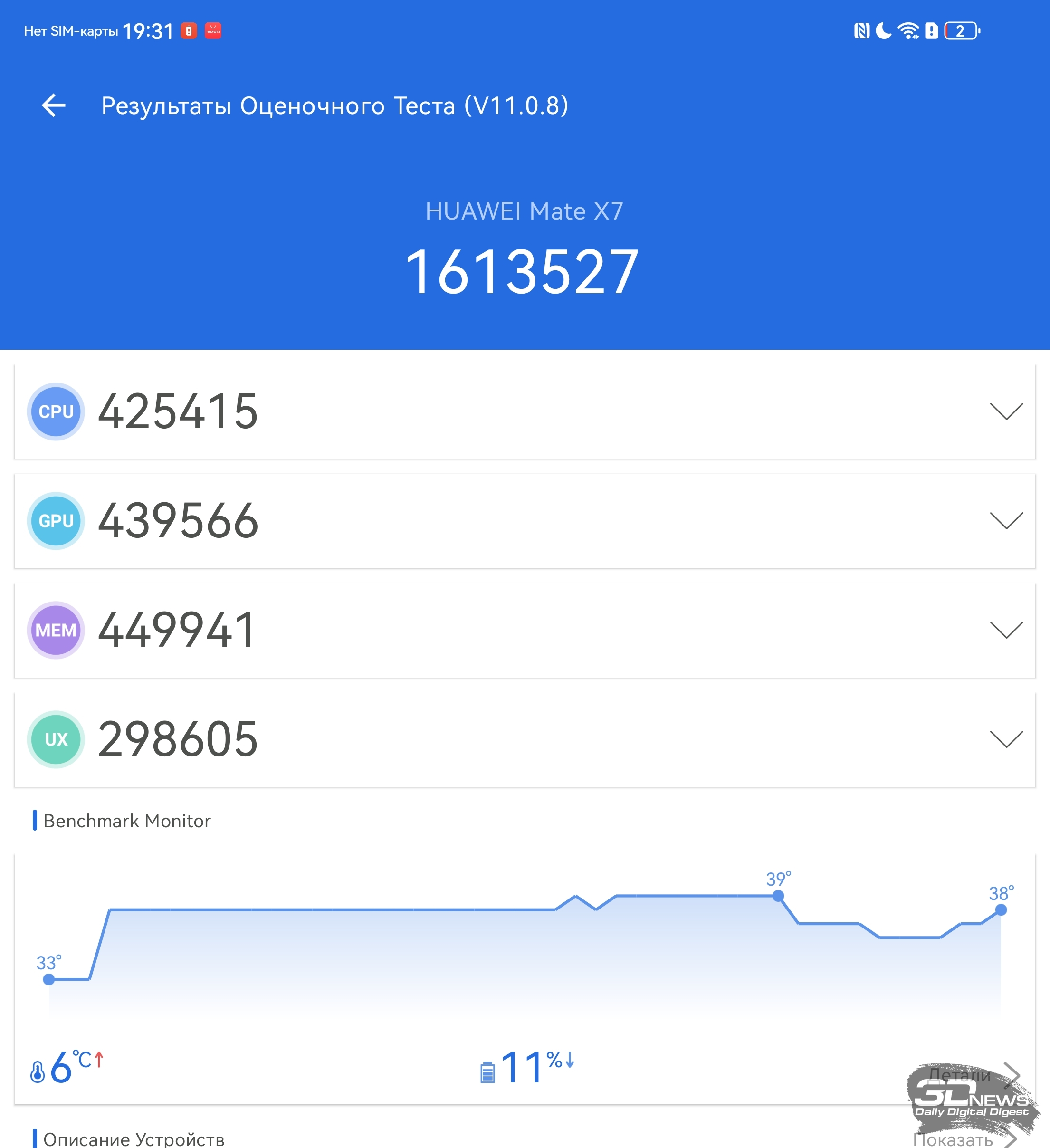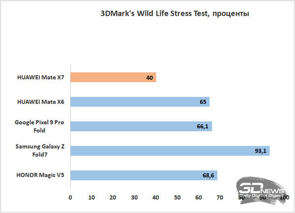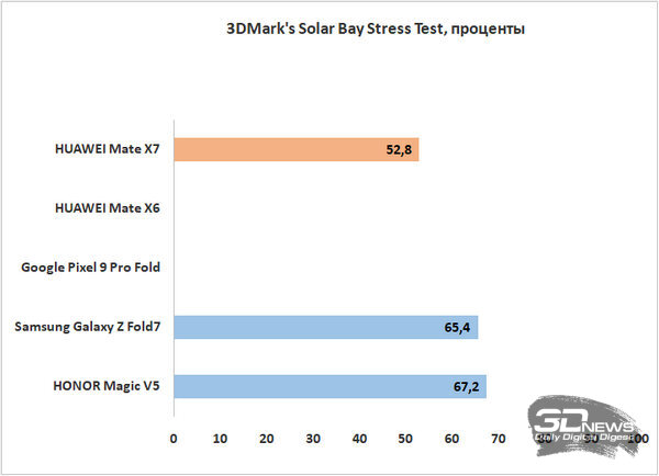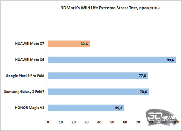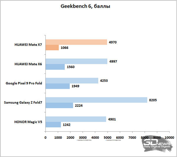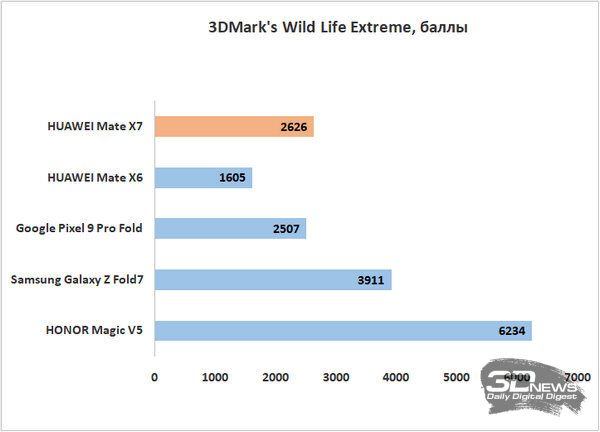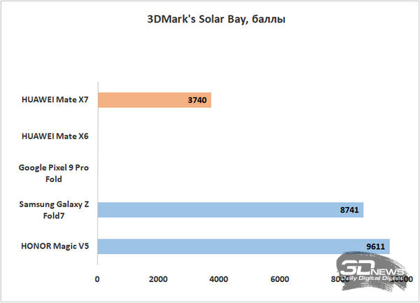 HUAWEI Mate X7, внутренний экран, яркий режим, цветовой охват. Серый треугольник – охват DCI-P3, белый треугольник – охват HUAWEI Mate X7 А вот в ярком режиме поведение внутреннего экрана слегка отличается. Цветовой охват оказывается еще шире, превышая «треугольник» DCI-P3 уже очень заметно. Гамма ближе к норме — 2,25. График температуры более ровный, и он держится на более близком к норме уровне (около 7 500 К). Среднее отклонение DeltaE по палитре Color Checker составляет при этом 4,26, чуть дальше от нормы. Но общий уровень настройки экранов, как всегда у Huawei, хорош. Звуковые возможности нормальные – мини-джека нет, но с беспроводной передачей данных дело обстоит хорошо: Bluetooth 6.0 (да-да, Huawei теперь может устанавливать модуль Bluetooth последней версии на свои смартфоны) с поддержкой профилей AAC, L2HC, LDAC, SBC (без aptX, конечно, – ограничения платформы). Динамики стереофонические, выделенные, громкие и с неплохим качеством звука; расположены грамотно, обеспечивая нормальную сцену и в сложенном, и в разложенном состоянии гаджета. ⇡#«Железо» и производительностьHUAWEI Mate X7 оснащен свежей фирменной платформой Kirin 9030 Pro. Фактически, как и должно быть у Huawei, дебютировало новое аппаратное решение на «классическом» флагмане HUAWEI Mate 80 Pro, но и складной флагман лишать его не стали. И он стал как раз первым смартфоном со старшим «кирином» поколения 2026 года, который, теоретически, должен сократить разрыв между смартфонами HUAWEI и конкурентами на платформах Qualcomm, Apple, Samsung и MediaTek. Здесь надо сразу сделать поправку — вся информация об аппаратной платформе сугубо неофициальная, Huawei продолжает скрывать информацию о своих чипсетах, иногда даже не раскрывая модель. Но, конечно, утаить это шило в мешке интернета невозможно, информация очень быстро становится доступной. Итак, что нам удалось выяснить из доступной в Сети информации, подкрепив эти знания данными, полученными с помощью специального софта. Kirin 9030 Pro получила 9 ядер, из которых пять — многопоточные, отчего в том самом софте центральный процессор распознается как 14-ядерный. По факту он состоит из одного старшего ядра тактовой частотой 2,75 ГГц, четырех «средних» ядер частотой 2,27 ГГц и четырех «младших» ядер частотой 1,72 ГГц. Используется архитектура ARMv8, техпроцесс — N+3 компании SMIC, что фактически соответствует 6 нанометрам. Графика – Maleoon 935 частотой примерно 933 МГц. Как видим, заметного прорыва на фоне массового применения 3 нанометров конкурентами нет, у SMIC нет доступа к EUV-литографии, и ухищрения в виде многократного наложения масок помогают только отчасти. Тем не менее, подвижки относительно процессоров прошлого поколения (Kirin 9100) имеются, и весьма заметные. В первую очередь, мы видим поддержку аппаратного ускорения трассировки лучей, что не было доступно раньше: Mate X7 – первый смартфон бренда, на котором мне удалось запуститься тест 3DMark Solar Bay. Также подросла «гладкая» производительность системы. Да, до флагманских платформ конкурентов как было далеко, так и осталось, но разрыв хотя бы не растет — черепаха не приближается к Ахиллесу, но и не отстает с каждым поколением все больше. Да, цифры «в вакууме» не впечатляют, но напомню, что производители складных смартфонов искусственно снижают пиковые частоты (не в рамках спланированного троттлинга под нагрузкой), так что отрыв действительно вполне приемлемый. По производительности HUAWEI Mate X7 скорее 