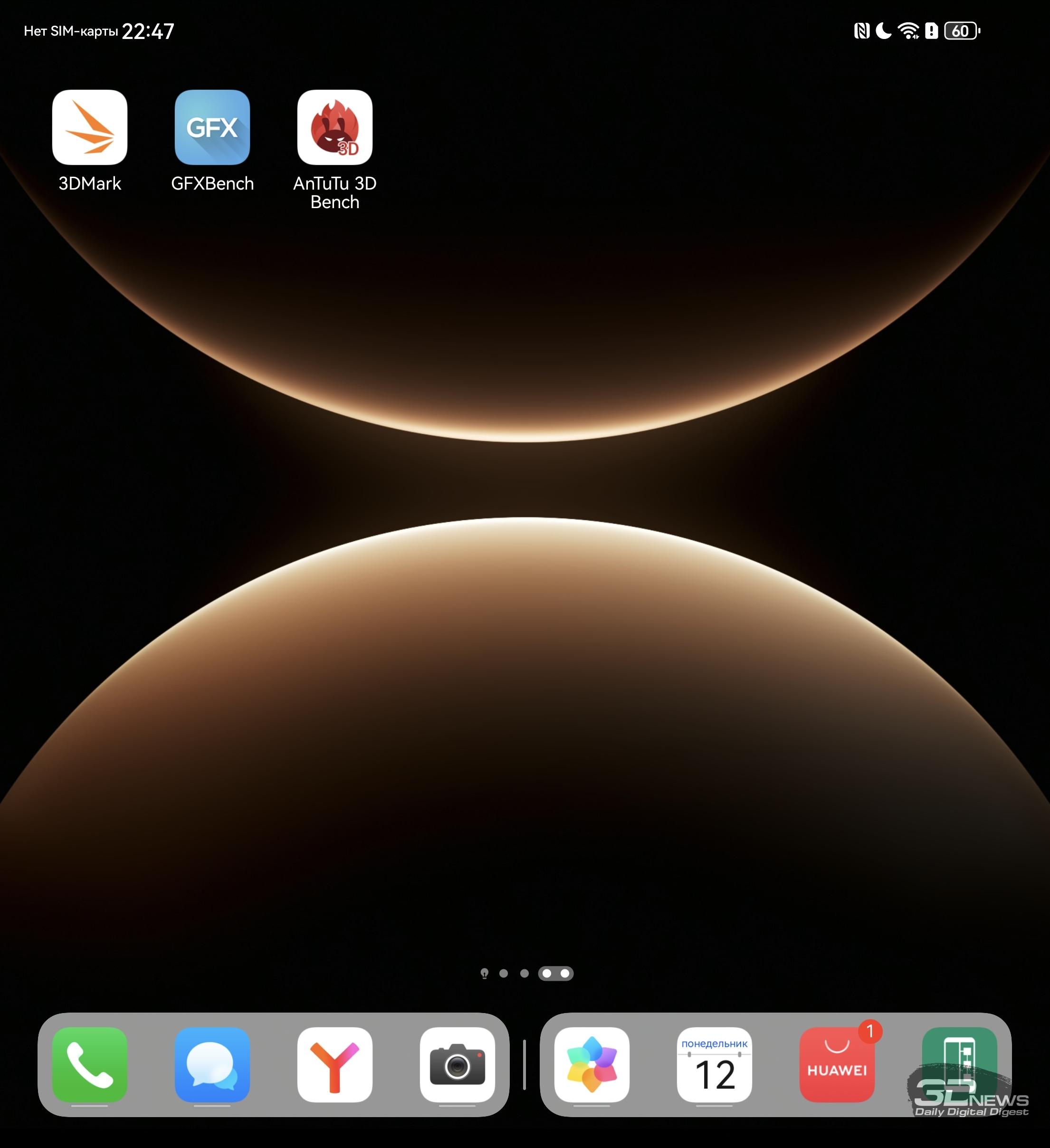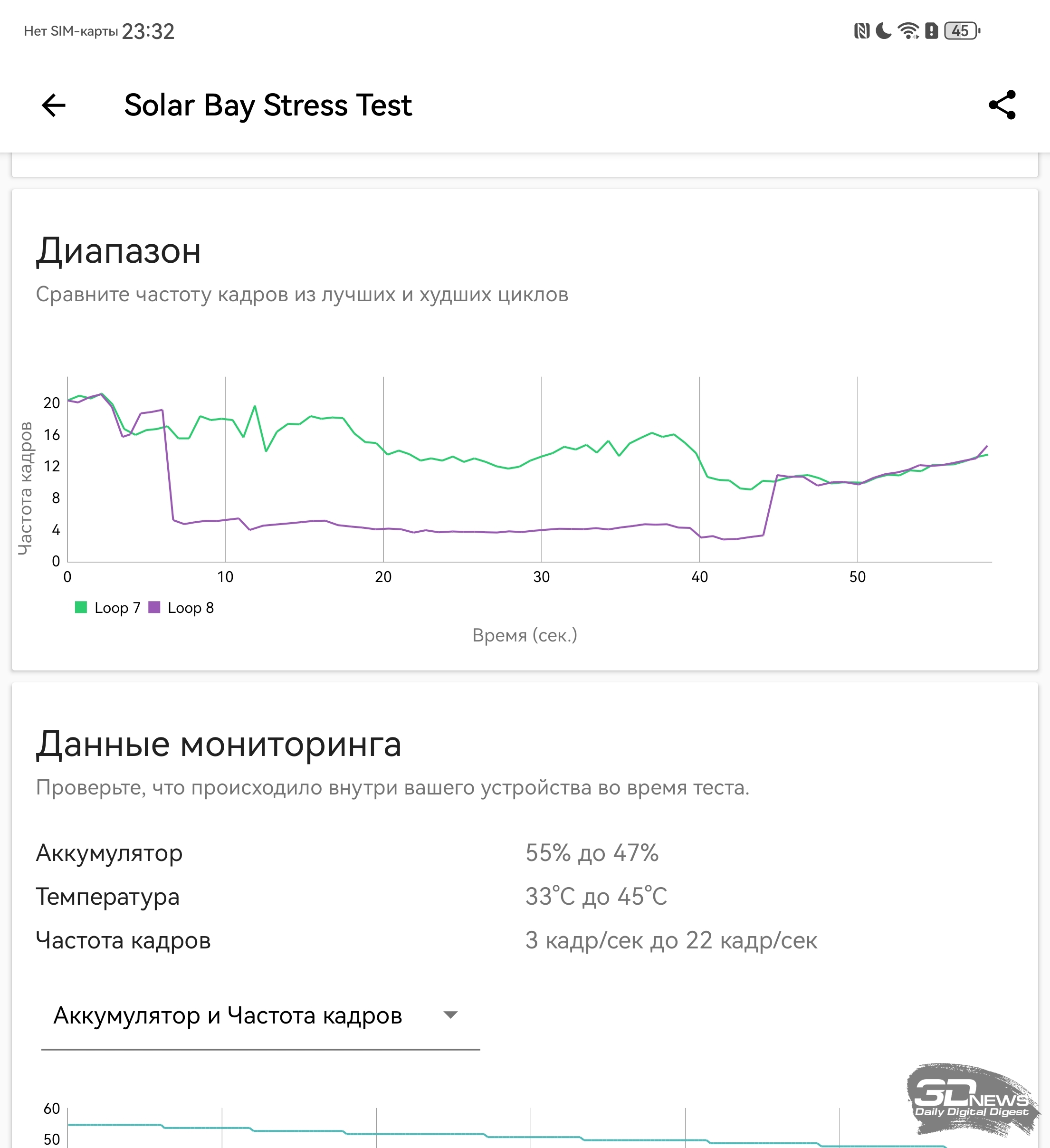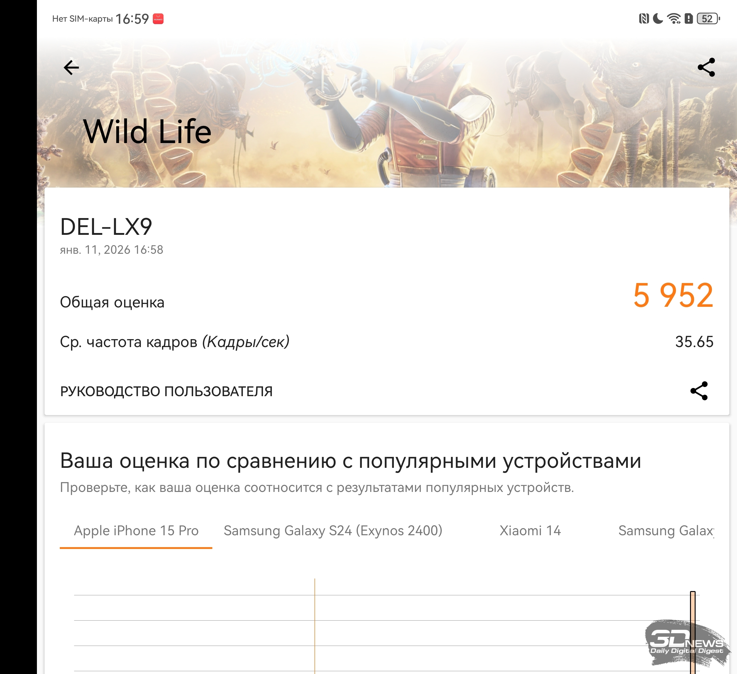 HUAWEI Mate X7, внутренний экран, яркий режим, цветовой охват. Серый треугольник – охват DCI-P3, белый треугольник – охват HUAWEI Mate X7 А вот в ярком режиме поведение внутреннего экрана слегка отличается. Цветовой охват оказывается еще шире, превышая «треугольник» DCI-P3 уже очень заметно. Гамма ближе к норме — 2,25. График температуры более ровный, и он держится на более близком к норме уровне (около 7 500 К). Среднее отклонение DeltaE по палитре Color Checker составляет при этом 4,26, чуть дальше от нормы. Но общий уровень настройки экранов, как всегда у Huawei, хорош. Звуковые возможности нормальные – мини-джека нет, но с беспроводной передачей данных дело обстоит хорошо: Bluetooth 6.0 (да-да, Huawei теперь может устанавливать модуль Bluetooth последней версии на свои смартфоны) с поддержкой профилей AAC, L2HC, LDAC, SBC (без aptX, конечно, – ограничения платформы). Динамики стереофонические, выделенные, громкие и с неплохим качеством звука; расположены грамотно, обеспечивая нормальную сцену и в сложенном, и в разложенном состоянии гаджета. ⇡#«Железо» и производительностьHUAWEI Mate X7 оснащен свежей фирменной платформой Kirin 9030 Pro. Фактически, как и должно быть у Huawei, дебютировало новое аппаратное решение на «классическом» флагмане HUAWEI Mate 80 Pro, но и складной флагман лишать его не стали. И он стал как раз первым смартфоном со старшим «кирином» поколения 2026 года, который, теоретически, должен сократить разрыв между смартфонами HUAWEI и конкурентами на платформах Qualcomm, Apple, Samsung и MediaTek. Здесь надо сразу сделать поправку — вся информация об аппаратной платформе сугубо неофициальная, Huawei продолжает скрывать информацию о своих чипсетах, иногда даже не раскрывая модель. Но, конечно, утаить это шило в мешке интернета невозможно, информация очень быстро становится доступной. Итак, что нам удалось выяснить из доступной в Сети информации, подкрепив эти знания данными, полученными с помощью специального софта. Kirin 9030 Pro получила 9 ядер, из которых пять — многопоточные, отчего в том самом софте центральный процессор распознается как 14-ядерный. По факту он состоит из одного старшего ядра тактовой частотой 2,75 ГГц, четырех «средних» ядер частотой 2,27 ГГц и четырех «младших» ядер частотой 1,72 ГГц. Используется архитектура ARMv8, техпроцесс — N+3 компании SMIC, что фактически соответствует 6 нанометрам. Графика – Maleoon 935 частотой примерно 933 МГц. Как видим, заметного прорыва на фоне массового применения 3 нанометров конкурентами нет, у SMIC нет доступа к EUV-литографии, и ухищрения в виде многократного наложения масок помогают только отчасти. Тем не менее, подвижки относительно процессоров прошлого поколения (Kirin 9100) имеются, и весьма заметные. В первую очередь, мы видим поддержку аппаратного ускорения трассировки лучей, что не было доступно раньше: Mate X7 – первый смартфон бренда, на котором мне удалось запуститься тест 3DMark Solar Bay. Также подросла «гладкая» производительность системы. Да, до флагманских платформ конкурентов как было далеко, так и осталось, но разрыв хотя бы не растет — черепаха не приближается к Ахиллесу, но и не отстает с каждым поколением все больше. Да, цифры «в вакууме» не впечатляют, но напомню, что производители складных смартфонов искусственно снижают пиковые частоты (не в рамках спланированного троттлинга под нагрузкой), так что отрыв действительно вполне приемлемый. По производительности HUAWEI Mate X7 скорее 