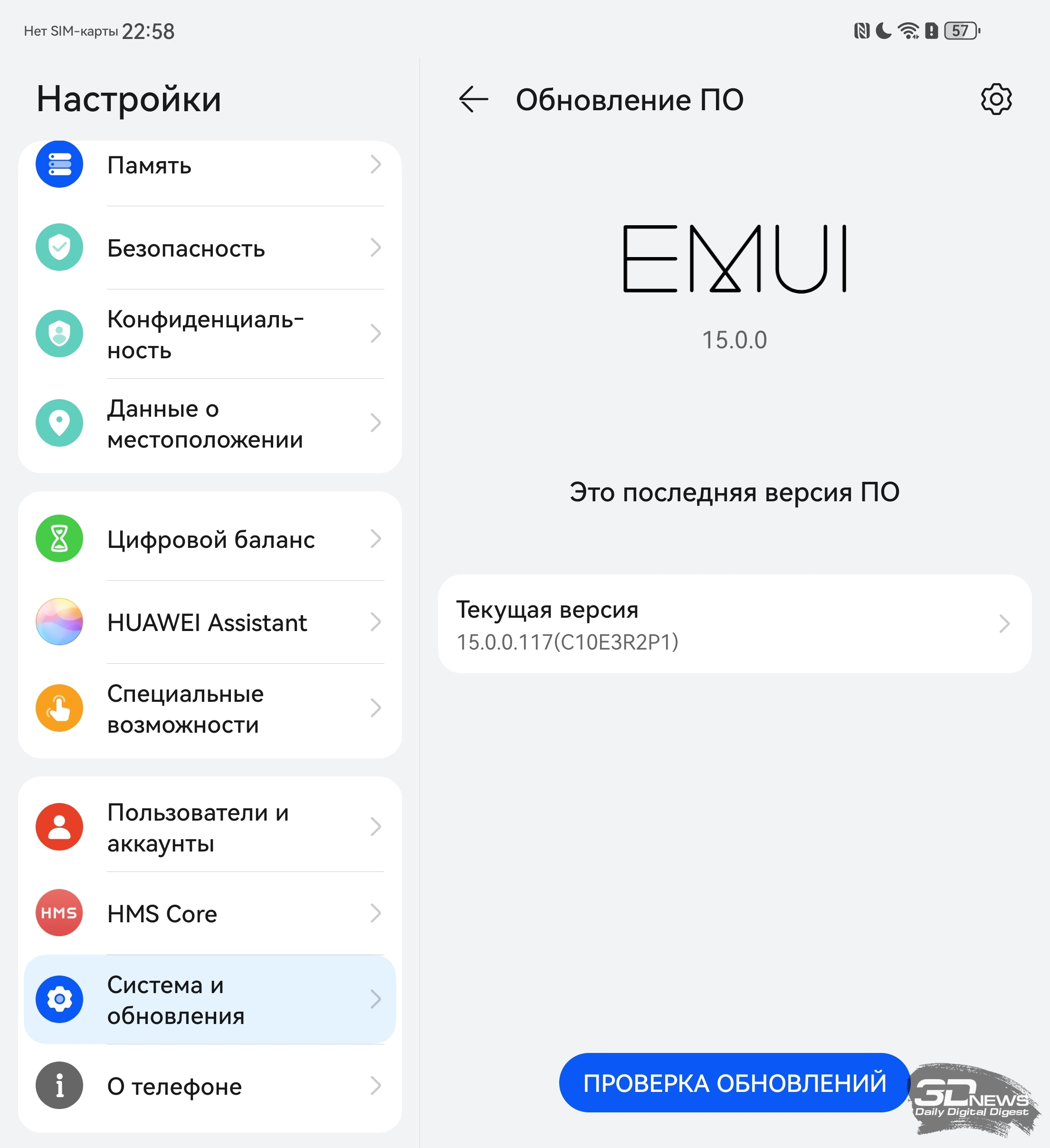 HUAWEI Mate X7 в сложенном состоянии, нижняя грань: порт USB Type-C, слот для двух SIM-карт, динамик и два микрофона Также обновлен и шарнир — это сказалось и на том, что теперь гаджет складывается более плотно, но также шарнир менее подвержен износу и лучше выдерживает механические нагрузки. И да, тактильно HUAWEI Mate X7 ощущается иначе — процесс складывания более плавный. Складка на месте сгиба есть, но не так бросается в глаза, как у предшественника. Ну а внешний экран прикрыт закаленным стеклом Kunlun Glass 2, тут ничего нового — это база для всех старших смартфонов Huawei. Более того, корпус защищен не только от влаги, но и от пыли, пусть и частично — заявлен стандарт IP58/IP59. Цветовых вариаций пять: красная, черная (с покрытием из искусственной кожи), белая, фиолетовая и синяя (со спинкой из нейлонового волокна). В Россию приедут красная, черная и белая. Функциональные элементы обычные: без мини-джека, но с ИК-портом, с выделенными стереодинамиками. Аппаратные клавиши (тут их две) – на правой грани. В комплекте есть чехол-крышка для задней панели, сделанная из пластика с напылением, подражающим фактуре спинки смартфона (в нашем случае — искусственной коже). ⇡#Программное обеспечениеHUAWEI Mate X7 работает на базе операционной системы EMUI 15 — тут никаких новостей, эта программная среда используется на всех смартфонах бренда, выпущенных еще с начала прошлого года. Кроме, разве что, самых недорогих, получивших EMUI 14 (вроде HUAWEI nova 14i). EMUI 15 на внешнем экране HUAWEI Mate X7