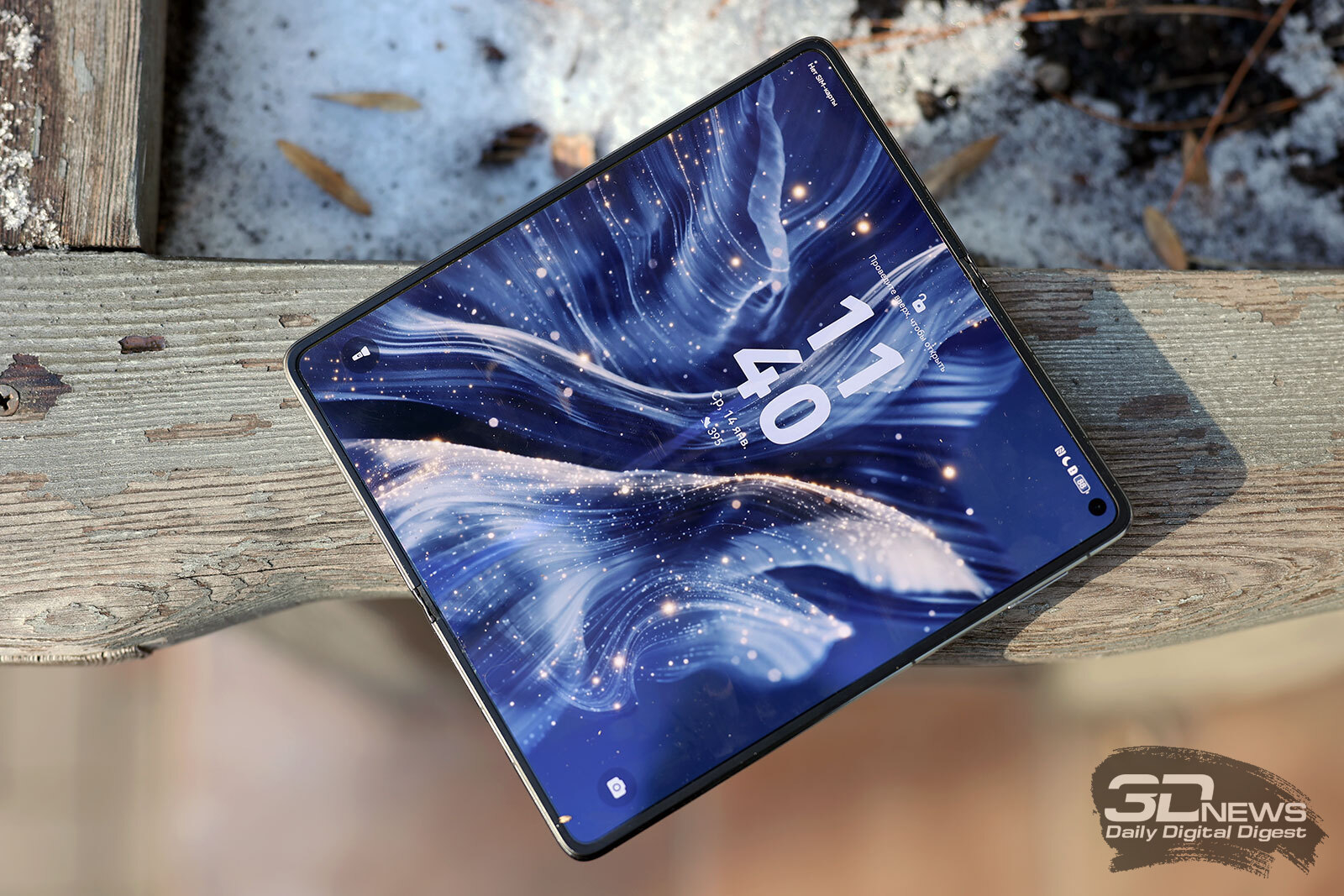 HUAWEI Mate X7 в разложенном состоянии, внутренний экран: в правом верхнем углу – фронтальная камера в индивидуальном отверстии Впрочем, камеры «мешаются» только визуально или когда кладешь смартфон на стол — в руках держать HUAWEI Mate X7 удобно. Да, в сложенном состоянии он все равно ощущается более крупным смартфоном, чем традиционный флагман (тот же Samsung Galaxy Z Fold7 уже почти сравнялся с «классиками»), но весит он, к примеру, даже чуть меньше, чем HUAWEI Pura 80 Ultra. Да, 236 граммов — это, в любом случае, очень много, но подобные цифры уже не вызывают оторопь, как раньше.