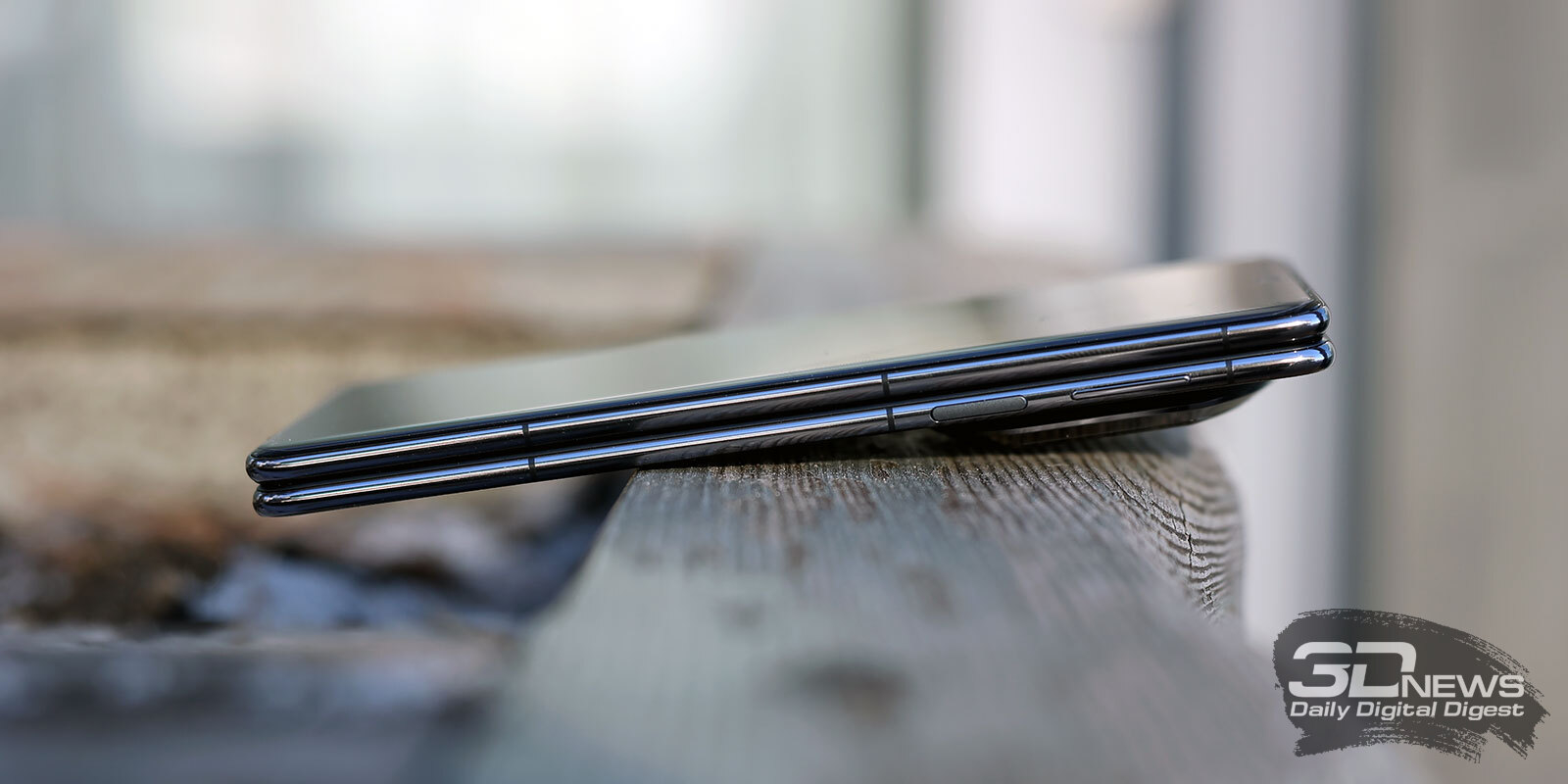 HUAWEI Mate X7 в сложенном состоянии, правая грань: клавиша питания со встроенным сканером отпечатков, клавиша регулировки громкости/спуска затвора Все основные изменения спрятаны, так сказать, «внутри», в самой конструкции гаджета. В первую очередь это внутренний экран — самое слабое место любого складного смартфона. Здесь он получил особый защитный слой на базе неньютоновской жидкости, слой из гибкого стекла и слой из углеродного волокна. Производитель заявляет, что смартфон на 20 % более устойчив к механическим воздействиям, чем раньше, и в два раза более износоустойчив при сгибании. Раньше времени экран «постареть» не должен.