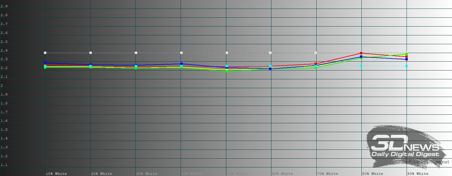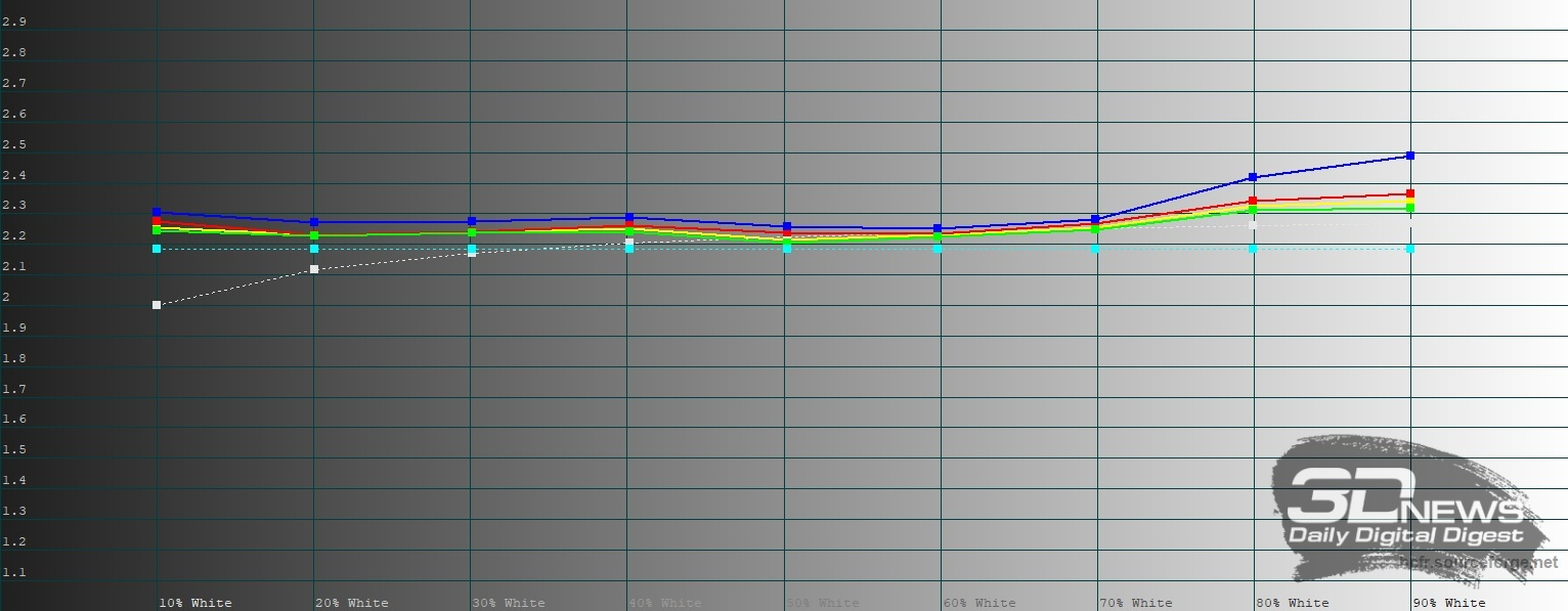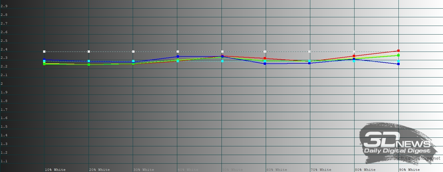 HUAWEI Mate X7, внешний экран, яркий режим, цветовой охват. Серый треугольник — охват DCI-P3, белый треугольник — охват HUAWEI Mate X7 В ярком режиме цветовое пространство внешнего экрана расширяется до стандарта DCI-P3, даже слегка превышая его по факту. Гамма тоже повышается, уже оказываясь выше нормы — 2,29 (кривые при этом ведут себя спокойно). Цветовая температура сильно повышается — график колеблется от 7 000 до 8 000 К. Среднее отклонение DeltaE по расширенной палитре Color Checker уже превышает норму — 3,55.