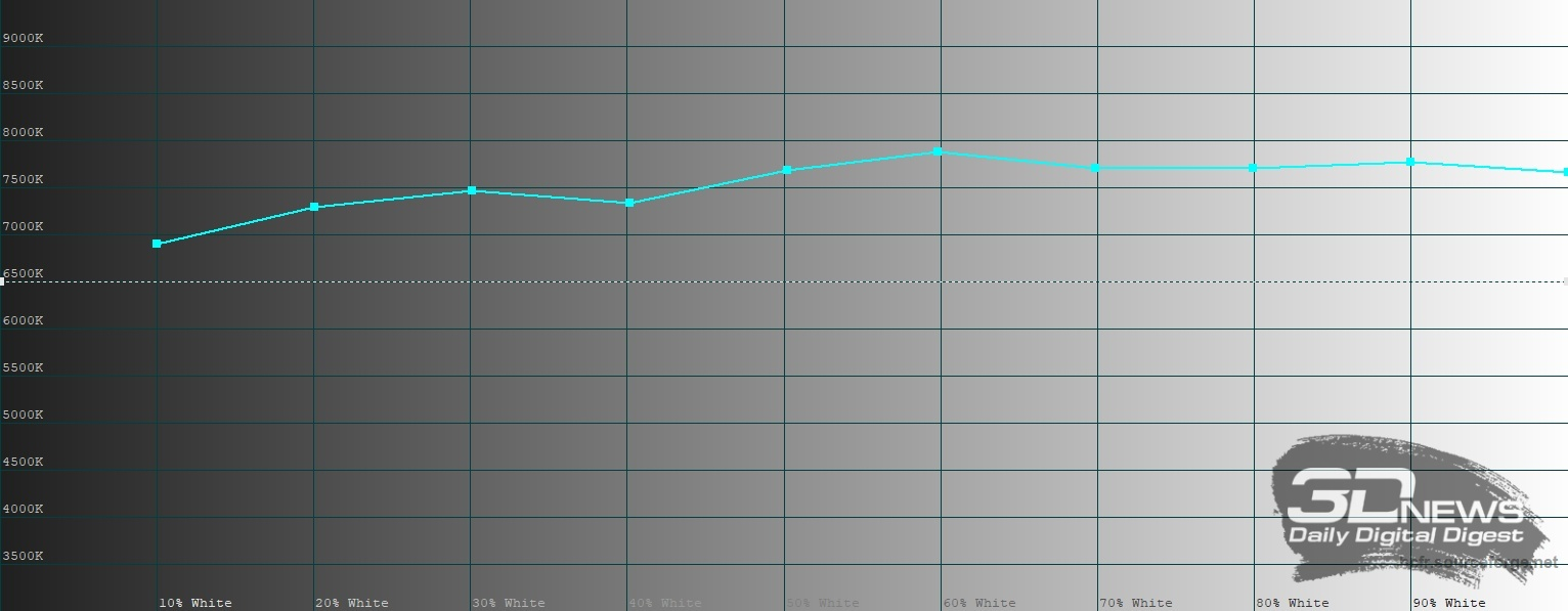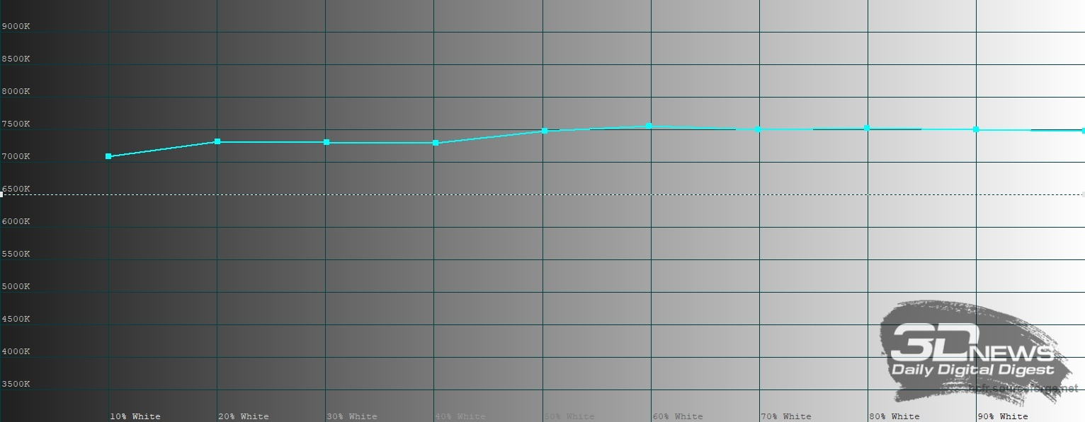 HUAWEI Mate X7, внешний экран, яркий режим, цветовая температура. Голубая линия — показатели HUAWEI Mate X7, пунктирная – эталонная температура