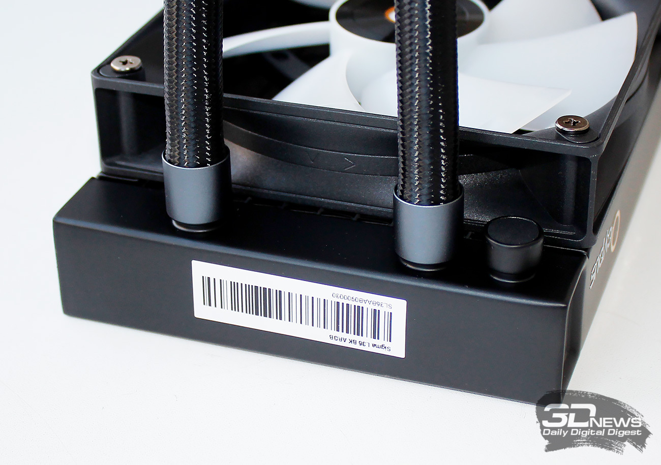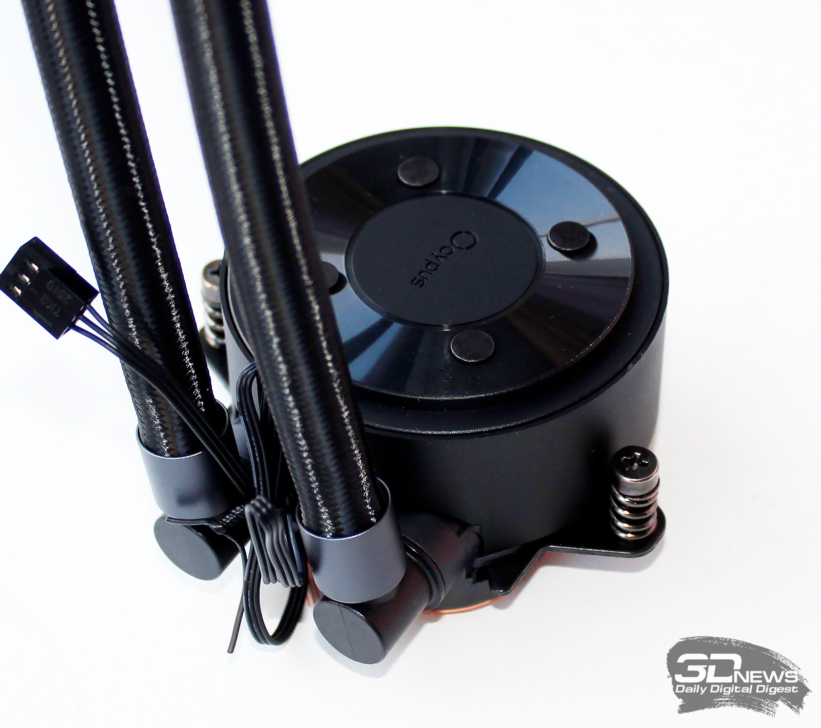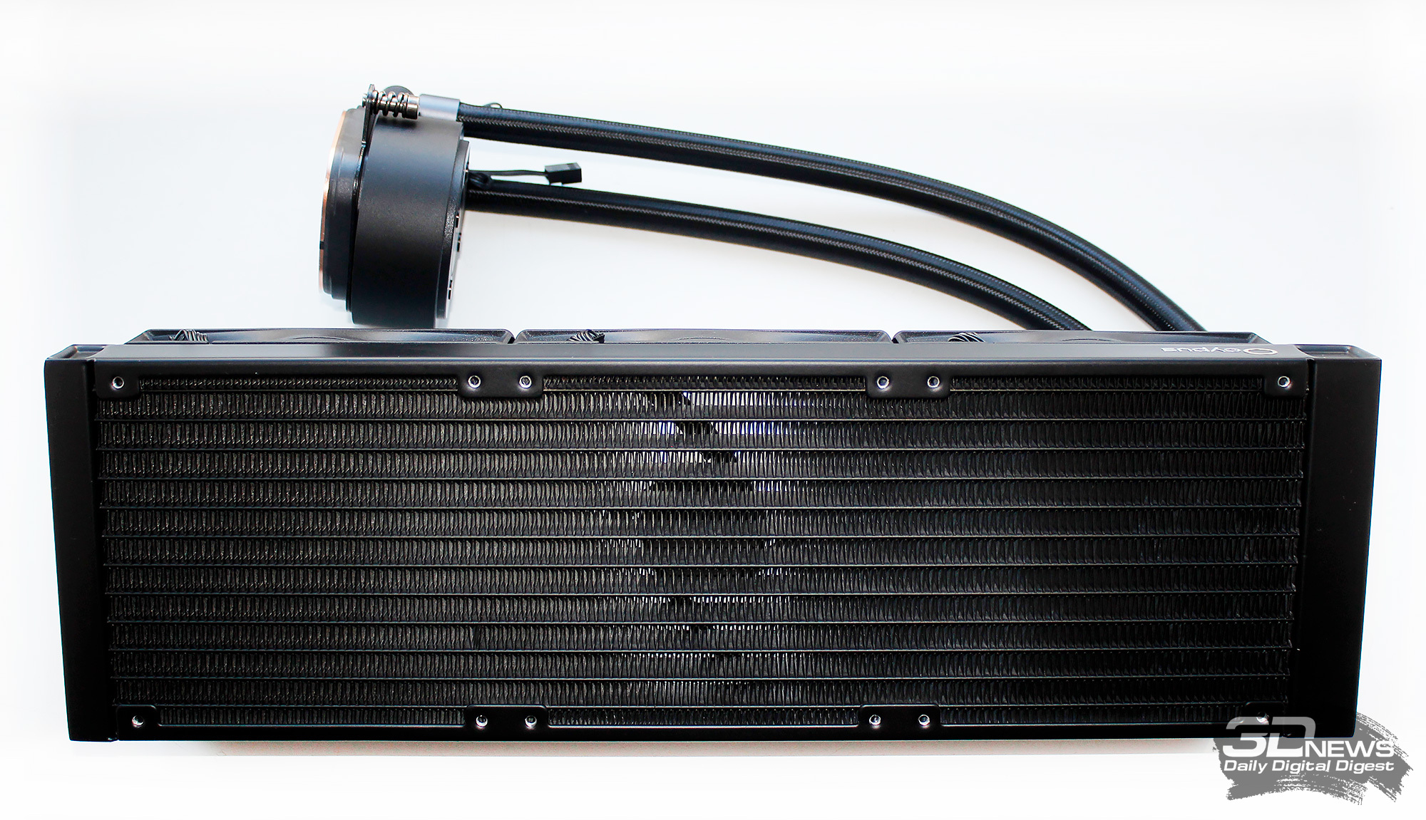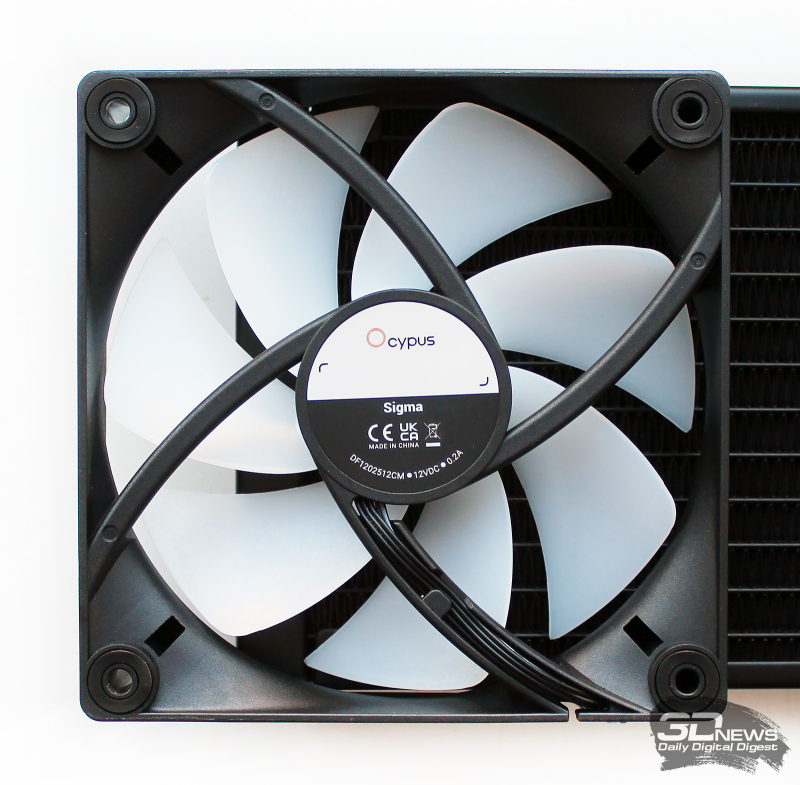 Упаковка и комплектация Система жидкостного охлаждения Ocypus Sigma L36 BK ARGB запечатана в большую коробку с изображением самой системы на лицевой стороне и её подробными техническими характеристиками на обратной. В основную коробку вставлена корзина из пористого картона с отсеками под компоненты системы жидкостного охлаждения, где они и зафиксированы. Причем радиатор с вентиляторами и экран помпы дополнительно защищены картонными коробками. Сбоку размещена небольшая коробочка с комплектующими. В ней находятся усилительная пластина для процессоров Intel, две пары монтажных пластин, комплекты винтов и гаек, кабель для вентиляторов, термопаста, стяжки-липучки и инструкция по установке. Произведённая в Китае Ocypus Sigma L36 BK ARGB продаётся в России за 8699 рублей, а гарантийный срок, предоставляемый на эту модель, равен пяти годам, что очень неплохо для AiO СЖО. ⇡#Особенности конструкцииНужно ли говорить, что Ocypus Sigma L36 BK ARGB представляет собой классическую систему жидкостного охлаждения необслуживаемого типа, уже заправленную и готовую к эксплуатации? Думаем, вы это и так прекрасно видите на приведённых далее фотографиях. А вот дизайн у системы довольно интересный. Он простой и лаконичный, но при этом совершенно нескучный из-за изящных вентиляторов с красивой белой крыльчаткой и золотыми кольцами на статорах. Масса СЖО равна 1560 граммам, что примерно на 10% меньше, чем у других систем этого форм-фактора (360 мм). Стандартный радиатор Ocypus Sigma L36 BK ARGB выполнен из алюминия и имеет размеры 397 × 120 × 27 мм. Он состоит из двенадцати плоских каналов, по которым прокачивается теплоноситель, и перфорированной гофроленты, приклеенной между этими каналами. Толщина рёбер равна 20,5 мм. Плотность рёбер радиатора равна 20-21 FPI, что является стандартным значением для AiO СЖО. На увеличенном торце радиатора размещены два статичных фитинга с опрессованными на них шлангами, а рядом можно заметить заглушенное заливное отверстие. Для соединения радиатора с помпой используются два резиновых шланга в нейлоновой оплётке внешним диаметром 12 мм и длиной 375 мм. Для них в комплекте с СЖО предусмотрены нейлоновые стяжки. Помпа Ocypus Sigma L36 BK ARGB очень компактна: внешне и размерами она напоминает хоккейную шайбу. Сверху на её корпусе видны четыре круглые точки – это магнитные крепления экрана мониторинга. В подшипнике ротора помпы используется керамическая втулка, обеспечивающая ей долговечность и бесшумность в работе. Правда, заявленный ресурс помпы составляет 30 тысяч часов, что довольно скромно по современным меркам. Скорость ротора заявлена на отметке 3100 об/мин (3030 об/мин, по данным мониторинга). При этом уровень шума насоса не должен превышать 27 дБА, а энергопотребление – 3,6 Вт (3,0 Вт, по данным мониторинга). Сверху на помпу устанавливается экран мониторинга в хромированном кольце. Его можно поворачивать на 90, 180, 270 и 360 градусов, ориентируя экран в четырёх положениях. Тип экрана – IPS, диагональ – 2,4 дюйма, разрешение – 320 × 240 пикселей. Его возможности мы продемонстрируем в разделе с установкой системы. Медный водоблок, привёрнутый восемью винтами к основанию помпы, имеет внутреннюю микроканальную структуру с расстоянием 0,1 мм между рёбрами. Размеры контактной поверхности водоблока равны 55,5 × 55,5 мм, а качество её обработки очень высокое. Поскольку ровность основания водоблока идеальн