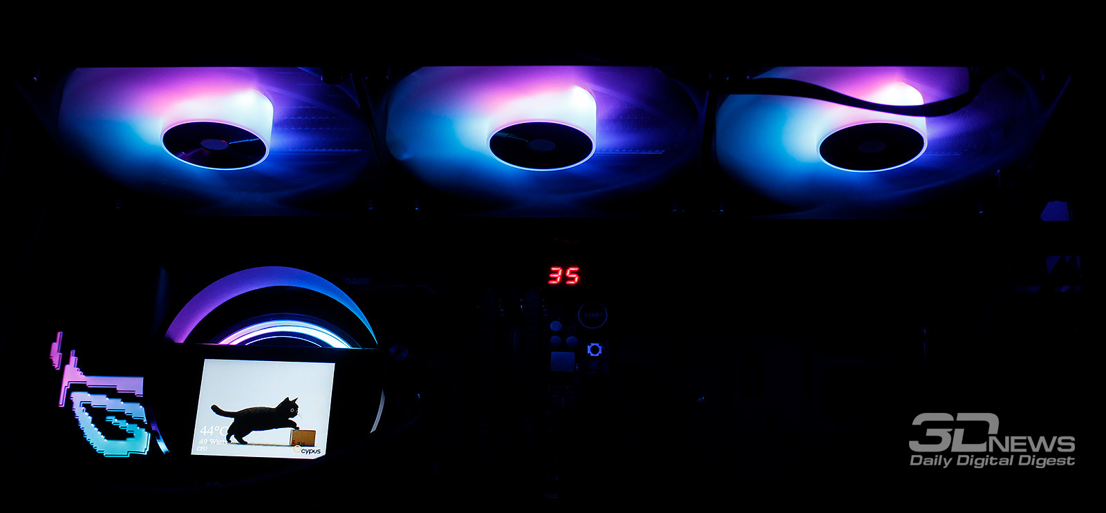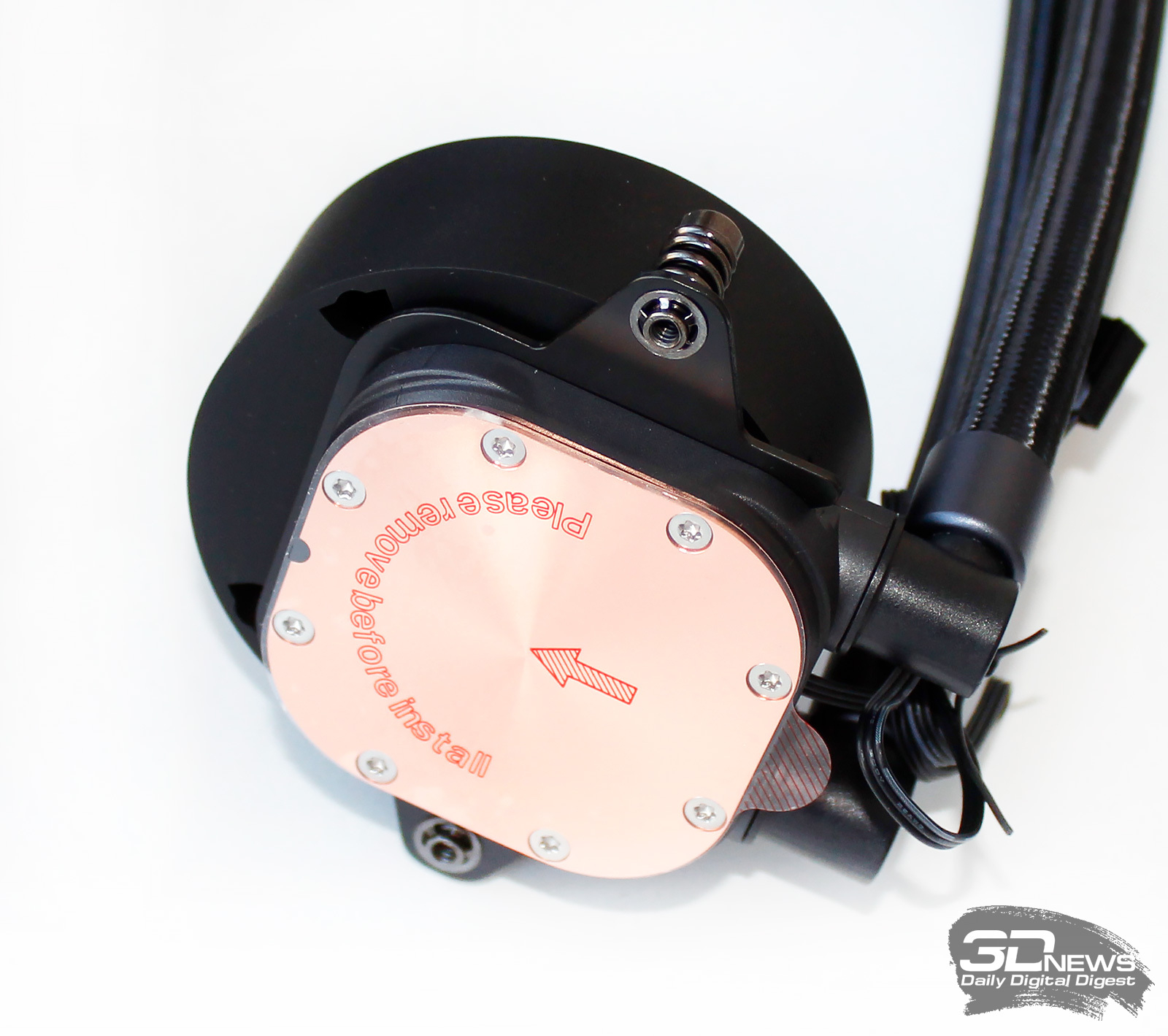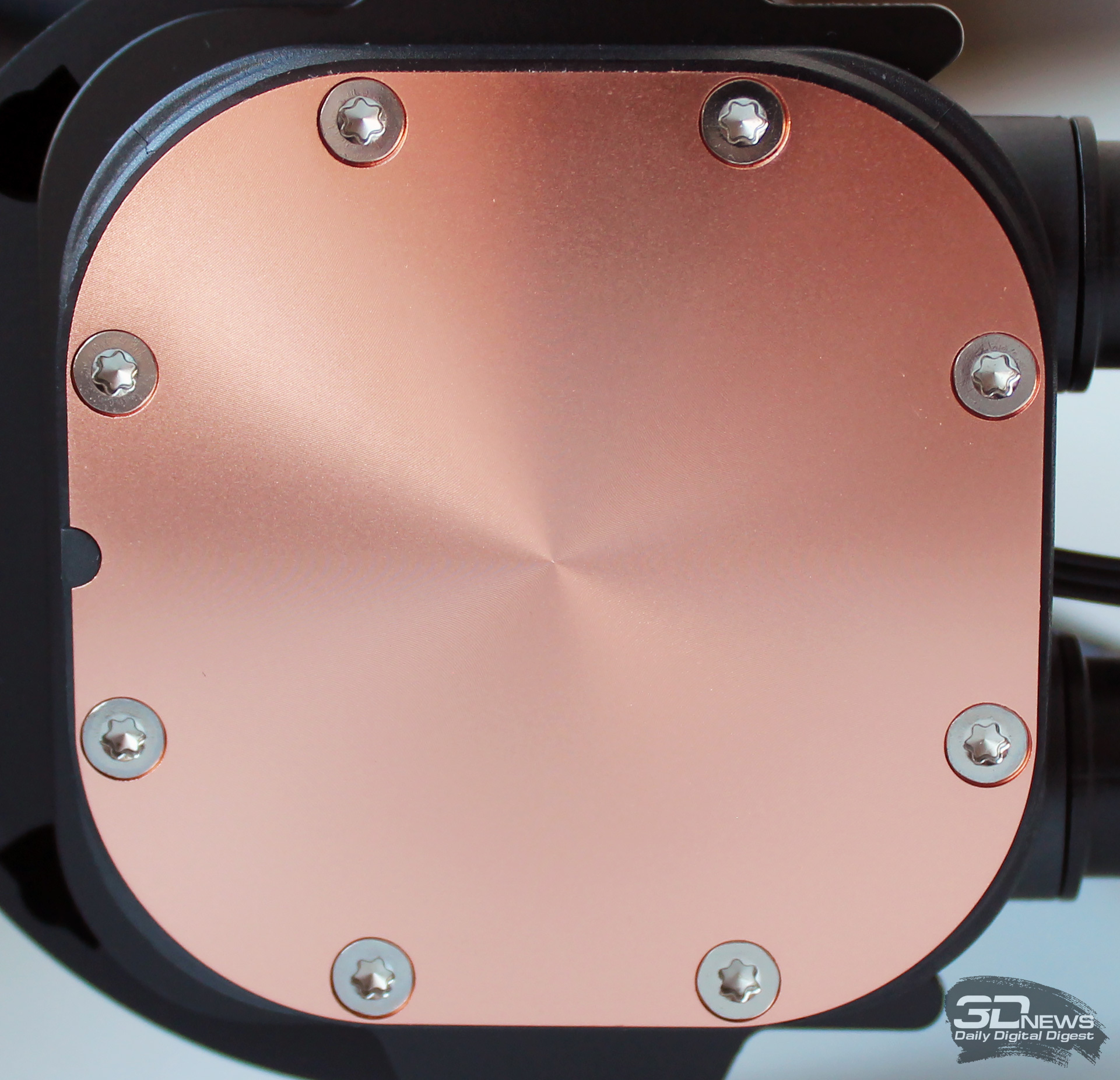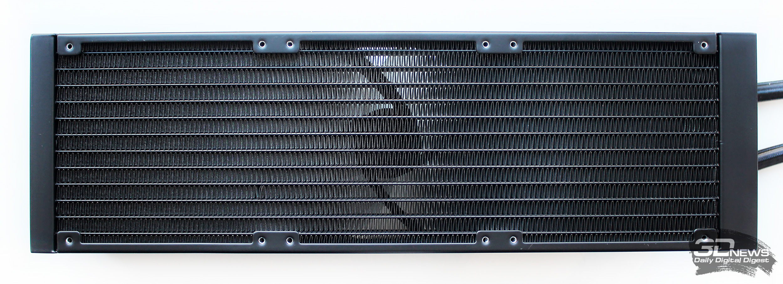 Упаковка и комплектация Система жидкостного охлаждения Ocypus Sigma L36 BK ARGB запечатана в большую коробку с изображением самой системы на лицевой стороне и её подробными техническими характеристиками на обратной. В основную коробку вставлена корзина из пористого картона с отсеками под компоненты системы жидкостного охлаждения, где они и зафиксированы. Причем радиатор с вентиляторами и экран помпы дополнительно защищены картонными коробками. Сбоку размещена небольшая коробочка с комплектующими. В ней находятся усилительная пластина для процессоров Intel, две пары монтажных пластин, комплекты винтов и гаек, кабель для вентиляторов, термопаста, стяжки-липучки и инструкция по установке. Произведённая в Китае Ocypus Sigma L36 BK ARGB продаётся в России за 8699 рублей, а гарантийный срок, предоставляемый на эту модель, равен пяти годам, что очень неплохо для AiO СЖО. ⇡#Особенности конструкцииНужно ли говорить, что Ocypus Sigma L36 BK ARGB представляет собой классическую систему жидкостного охлаждения необслуживаемого типа, уже заправленную и готовую к эксплуатации? Думаем, вы это и так прекрасно видите на приведённых далее фотографиях. А вот дизайн у системы довольно интересный. Он простой и лаконичный, но при этом совершенно нескучный из-за изящных вентиляторов с красивой белой крыльчаткой и золотыми кольцами на статорах. Масса СЖО равна 1560 граммам, что примерно на 10% меньше, чем у других систем этого форм-фактора (360 мм). Стандартный радиатор Ocypus Sigma L36 BK ARGB выполнен из алюминия и имеет размеры 397 × 120 × 27 мм. Он состоит из двенадцати плоских каналов, по которым прокачивается теплоноситель, и перфорированной гофроленты, приклеенной между этими каналами. Толщина рёбер равна 20,5 мм. Плотность рёбер радиатора равна 20-21 FPI, что является стандартным значением для AiO СЖО. На увеличенном торце радиатора размещены два статичных фитинга с опрессованными на них шлангами, а рядом можно заметить заглушенное заливное отверстие. Для соединения радиатора с помпой используются два резиновых шланга в нейлоновой оплётке внешним диаметром 12 мм и длиной 375 мм. Для них в комплекте с СЖО предусмотрены нейлоновые стяжки. Помпа Ocypus Sigma L36 BK ARGB очень компактна: внешне и размерами она напоминает хоккейную шайбу. Сверху на её корпусе видны четыре круглые точки – это магнитные крепления экрана мониторинга. В подшипнике ротора помпы используется керамическая втулка, обеспечивающая ей долговечность и бесшумность в работе. Правда, заявленный ресурс помпы составляет 30 тысяч часов, что довольно скромно по современным меркам. Скорость ротора заявлена на отметке 3100 об/мин (3030 об/мин, по данным мониторинга). При этом уровень шума насоса не должен превышать 27 дБА, а энергопотребление – 3,6 Вт (3,0 Вт, по данным мониторинга). Сверху на помпу устанавливается экран мониторинга в хромированном кольце. Его можно поворачивать на 90, 180, 270 и 360 градусов, ориентируя экран в четырёх положениях. Тип экрана – IPS, диагональ – 2,4 дюйма, разрешение – 320 × 240 пикселей. Его возможности мы продемонстрируем в разделе с установкой системы. Медный водоблок, привёрнутый восемью винтами к основанию помпы, имеет внутреннюю микроканальную структуру с расстоянием 0,1 мм между рёбрами. Размеры контактной поверхности водоблока равны 55,5 × 55,5 мм, а качество её обработки очень высокое. Поскольку ровность основания водоблока идеальн