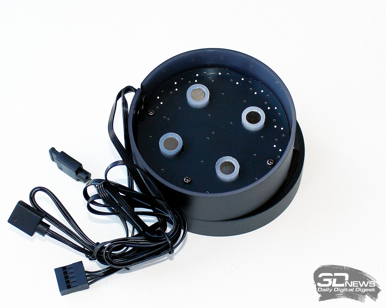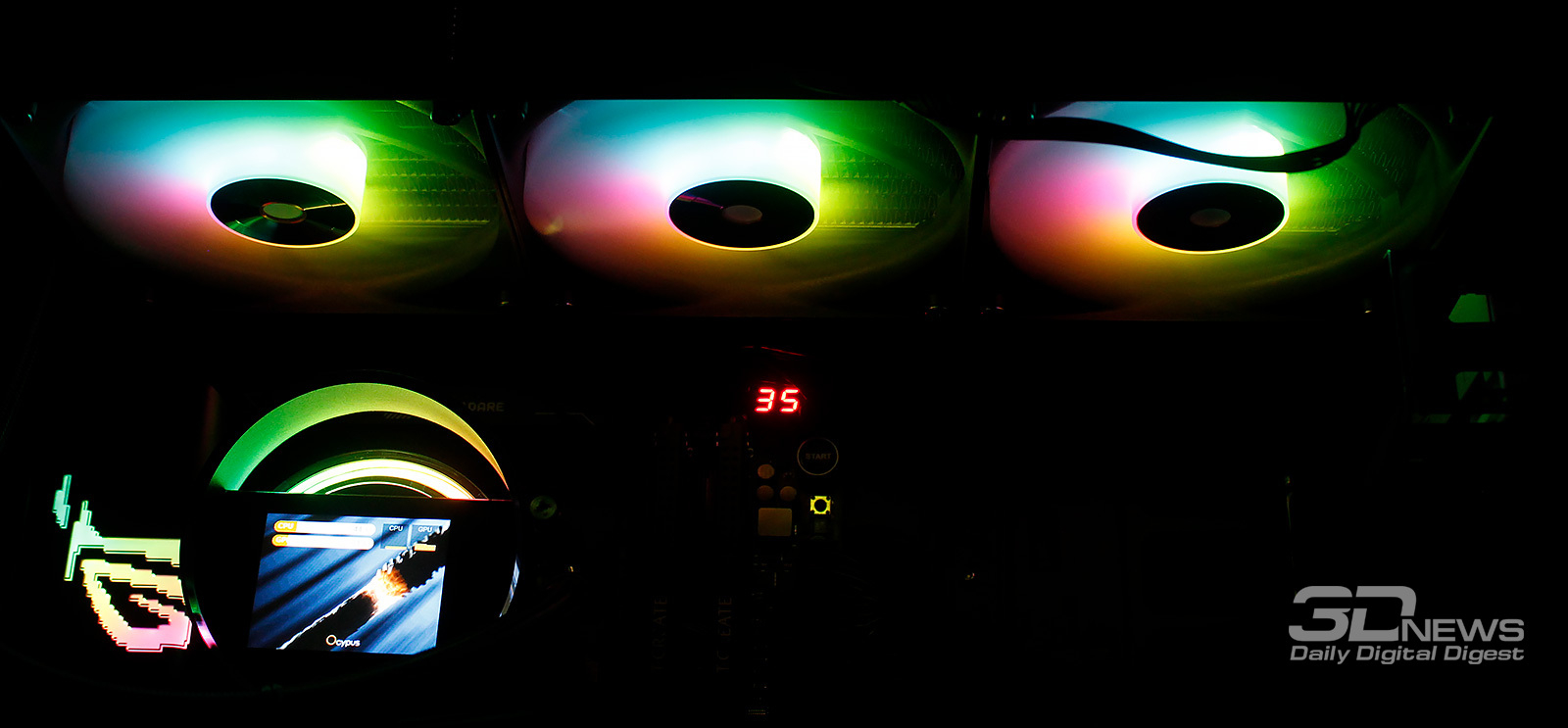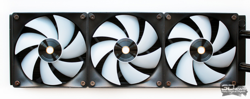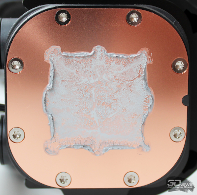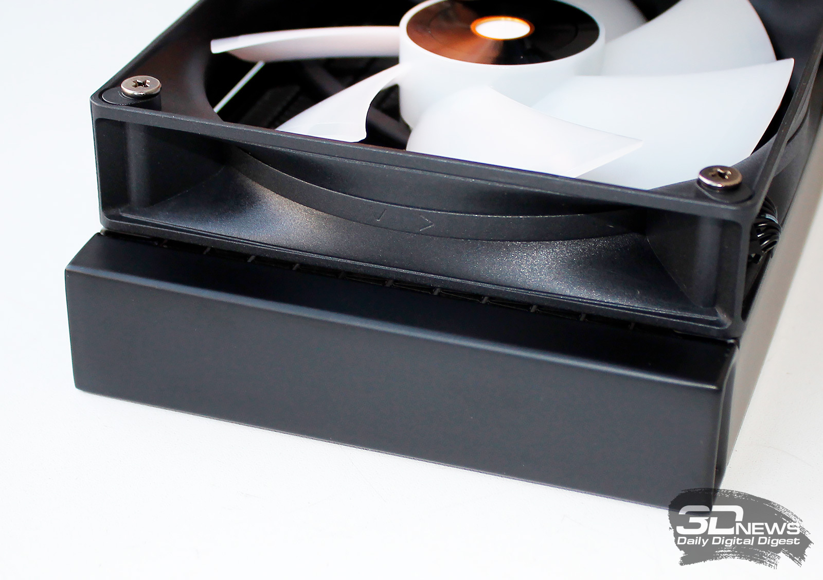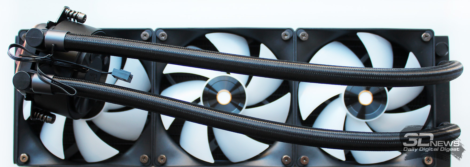 Упаковка и комплектация Система жидкостного охлаждения Ocypus Sigma L36 BK ARGB запечатана в большую коробку с изображением самой системы на лицевой стороне и её подробными техническими характеристиками на обратной. В основную коробку вставлена корзина из пористого картона с отсеками под компоненты системы жидкостного охлаждения, где они и зафиксированы. Причем радиатор с вентиляторами и экран помпы дополнительно защищены картонными коробками. Сбоку размещена небольшая коробочка с комплектующими. В ней находятся усилительная пластина для процессоров Intel, две пары монтажных пластин, комплекты винтов и гаек, кабель для вентиляторов, термопаста, стяжки-липучки и инструкция по установке. Произведённая в Китае Ocypus Sigma L36 BK ARGB продаётся в России за 8699 рублей, а гарантийный срок, предоставляемый на эту модель, равен пяти годам, что очень неплохо для AiO СЖО. ⇡#Особенности конструкцииНужно ли говорить, что Ocypus Sigma L36 BK ARGB представляет собой классическую систему жидкостного охлаждения необслуживаемого типа, уже заправленную и готовую к эксплуатации? Думаем, вы это и так прекрасно видите на приведённых далее фотографиях. А вот дизайн у системы довольно интересный. Он простой и лаконичный, но при этом совершенно нескучный из-за изящных вентиляторов с красивой белой крыльчаткой и золотыми кольцами на статорах. Масса СЖО равна 1560 граммам, что примерно на 10% меньше, чем у других систем этого форм-фактора (360 мм). Стандартный радиатор Ocypus Sigma L36 BK ARGB выполнен из алюминия и имеет размеры 397 × 120 × 27 мм. Он состоит из двенадцати плоских каналов, по которым прокачивается теплоноситель, и перфорированной гофроленты, приклеенной между этими каналами. Толщина рёбер равна 20,5 мм. Плотность рёбер радиатора равна 20-21 FPI, что является стандартным значением для AiO СЖО. На увеличенном торце радиатора размещены два статичных фитинга с опрессованными на них шлангами, а рядом можно заметить заглушенное заливное отверстие. Для соединения радиатора с помпой используются два резиновых шланга в нейлоновой оплётке внешним диаметром 12 мм и длиной 375 мм. Для них в комплекте с СЖО предусмотрены нейлоновые стяжки. Помпа Ocypus Sigma L36 BK ARGB очень компактна: внешне и размерами она напоминает хоккейную шайбу. Сверху на её корпусе видны четыре круглые точки – это магнитные крепления экрана мониторинга. В подшипнике ротора помпы используется керамическая втулка, обеспечивающая ей долговечность и бесшумность в работе. Правда, заявленный ресурс помпы составляет 30 тысяч часов, что довольно скромно по современным меркам. Скорость ротора заявлена на отметке 3100 об/мин (3030 об/мин, по данным мониторинга). При этом уровень шума насоса не должен превышать 27 дБА, а энергопотребление – 3,6 Вт (3,0 Вт, по данным мониторинга). Сверху на помпу устанавливается экран мониторинга в хромированном кольце. Его можно поворачивать на 90, 180, 270 и 360 градусов, ориентируя экран в четырёх положениях. Тип экрана – IPS, диагональ – 2,4 дюйма, разрешение – 320 × 240 пикселей. Его возможности мы продемонстрируем в разделе с установкой системы. Медный водоблок, привёрнутый восемью винтами к основанию помпы, имеет внутреннюю микроканальную структуру с расстоянием 0,1 мм между рёбрами. Размеры контактной поверхности водоблока равны 55,5 × 55,5 мм, а качество её обработки очень высокое. Поскольку ровность основания водоблока идеальн