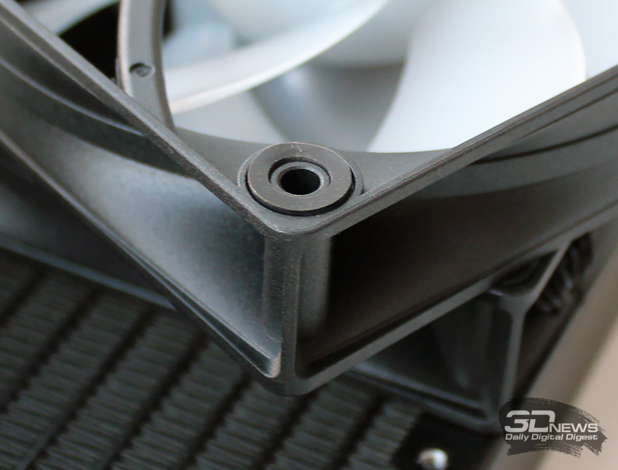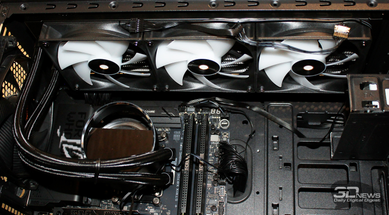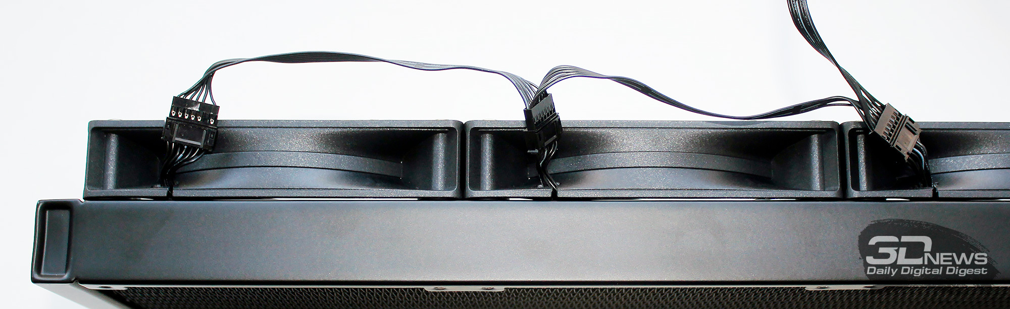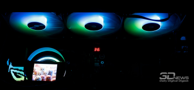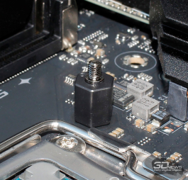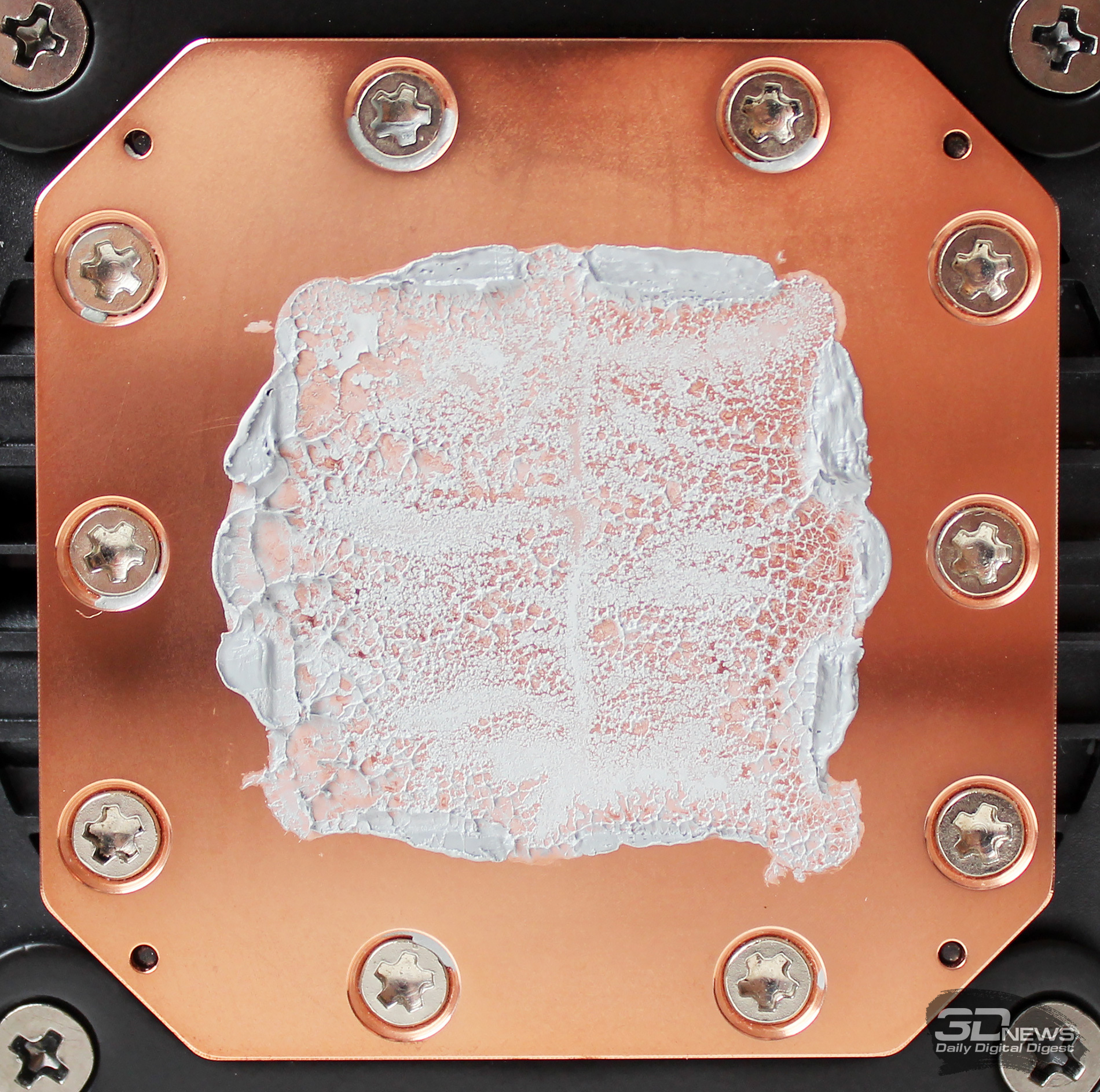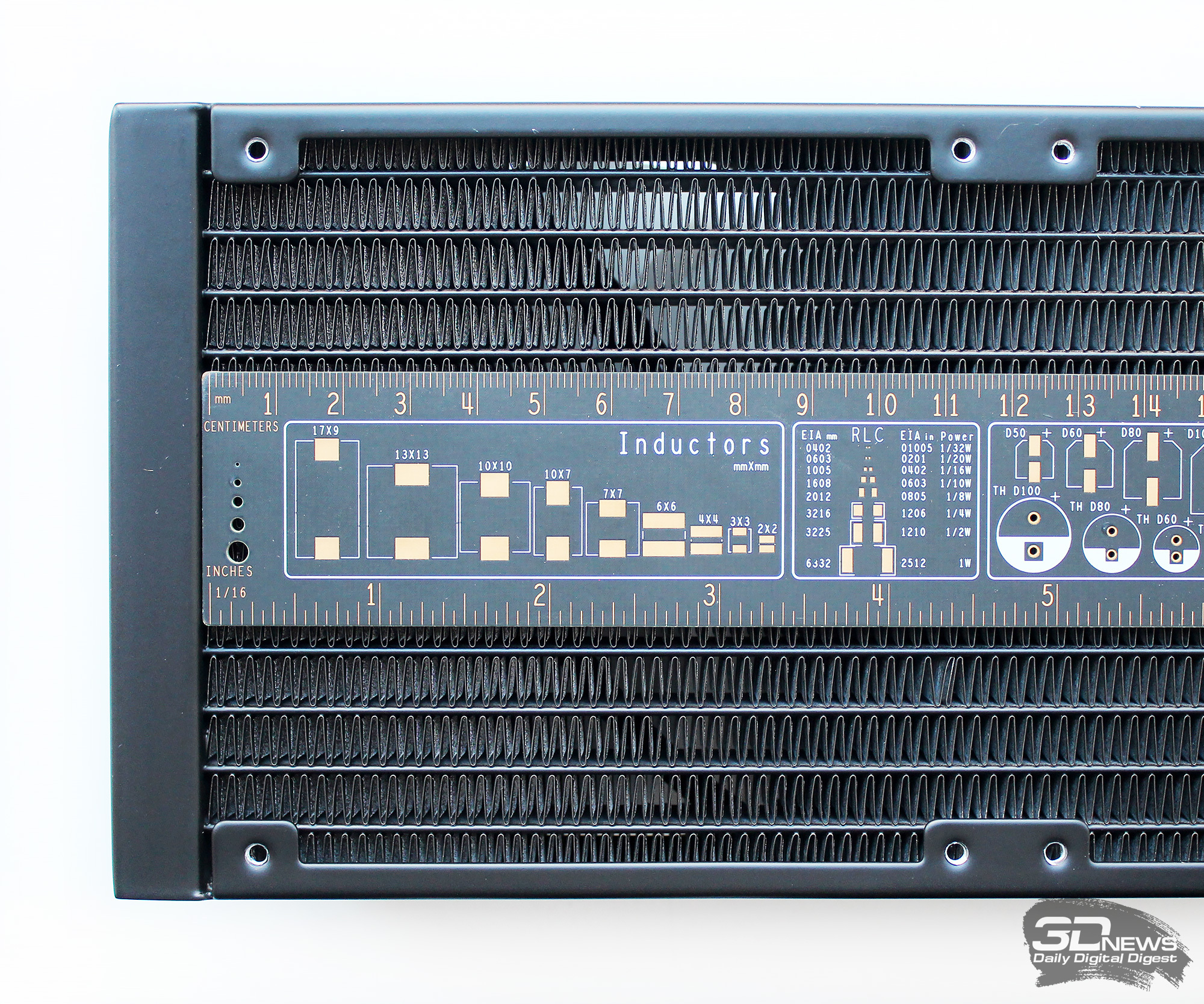 Упаковка и комплектация Система жидкостного охлаждения Ocypus Sigma L36 BK ARGB запечатана в большую коробку с изображением самой системы на лицевой стороне и её подробными техническими характеристиками на обратной. В основную коробку вставлена корзина из пористого картона с отсеками под компоненты системы жидкостного охлаждения, где они и зафиксированы. Причем радиатор с вентиляторами и экран помпы дополнительно защищены картонными коробками. Сбоку размещена небольшая коробочка с комплектующими. В ней находятся усилительная пластина для процессоров Intel, две пары монтажных пластин, комплекты винтов и гаек, кабель для вентиляторов, термопаста, стяжки-липучки и инструкция по установке. Произведённая в Китае Ocypus Sigma L36 BK ARGB продаётся в России за 8699 рублей, а гарантийный срок, предоставляемый на эту модель, равен пяти годам, что очень неплохо для AiO СЖО. ⇡#Особенности конструкцииНужно ли говорить, что Ocypus Sigma L36 BK ARGB представляет собой классическую систему жидкостного охлаждения необслуживаемого типа, уже заправленную и готовую к эксплуатации? Думаем, вы это и так прекрасно видите на приведённых далее фотографиях. А вот дизайн у системы довольно интересный. Он простой и лаконичный, но при этом совершенно нескучный из-за изящных вентиляторов с красивой белой крыльчаткой и золотыми кольцами на статорах. Масса СЖО равна 1560 граммам, что примерно на 10% меньше, чем у других систем этого форм-фактора (360 мм). Стандартный радиатор Ocypus Sigma L36 BK ARGB выполнен из алюминия и имеет размеры 397 × 120 × 27 мм. Он состоит из двенадцати плоских каналов, по которым прокачивается теплоноситель, и перфорированной гофроленты, приклеенной между этими каналами. Толщина рёбер равна 20,5 мм. Плотность рёбер радиатора равна 20-21 FPI, что является стандартным значением для AiO СЖО. На увеличенном торце радиатора размещены два статичных фитинга с опрессованными на них шлангами, а рядом можно заметить заглушенное заливное отверстие. Для соединения радиатора с помпой используются два резиновых шланга в нейлоновой оплётке внешним диаметром 12 мм и длиной 375 мм. Для них в комплекте с СЖО предусмотрены нейлоновые стяжки. Помпа Ocypus Sigma L36 BK ARGB очень компактна: внешне и размерами она напоминает хоккейную шайбу. Сверху на её корпусе видны четыре круглые точки – это магнитные крепления экрана мониторинга. В подшипнике ротора помпы используется керамическая втулка, обеспечивающая ей долговечность и бесшумность в работе. Правда, заявленный ресурс помпы составляет 30 тысяч часов, что довольно скромно по современным меркам. Скорость ротора заявлена на отметке 3100 об/мин (3030 об/мин, по данным мониторинга). При этом уровень шума насоса не должен превышать 27 дБА, а энергопотребление – 3,6 Вт (3,0 Вт, по данным мониторинга). Сверху на помпу устанавливается экран мониторинга в хромированном кольце. Его можно поворачивать на 90, 180, 270 и 360 градусов, ориентируя экран в четырёх положениях. Тип экрана – IPS, диагональ – 2,4 дюйма, разрешение – 320 × 240 пикселей. Его возможности мы продемонстрируем в разделе с установкой системы. Медный водоблок, привёрнутый восемью винтами к основанию помпы, имеет внутреннюю микроканальную структуру с расстоянием 0,1 мм между рёбрами. Размеры контактной поверхности водоблока равны 55,5 × 55,5 мм, а качество её обработки очень высокое. Поскольку ровность основания водоблока идеальн