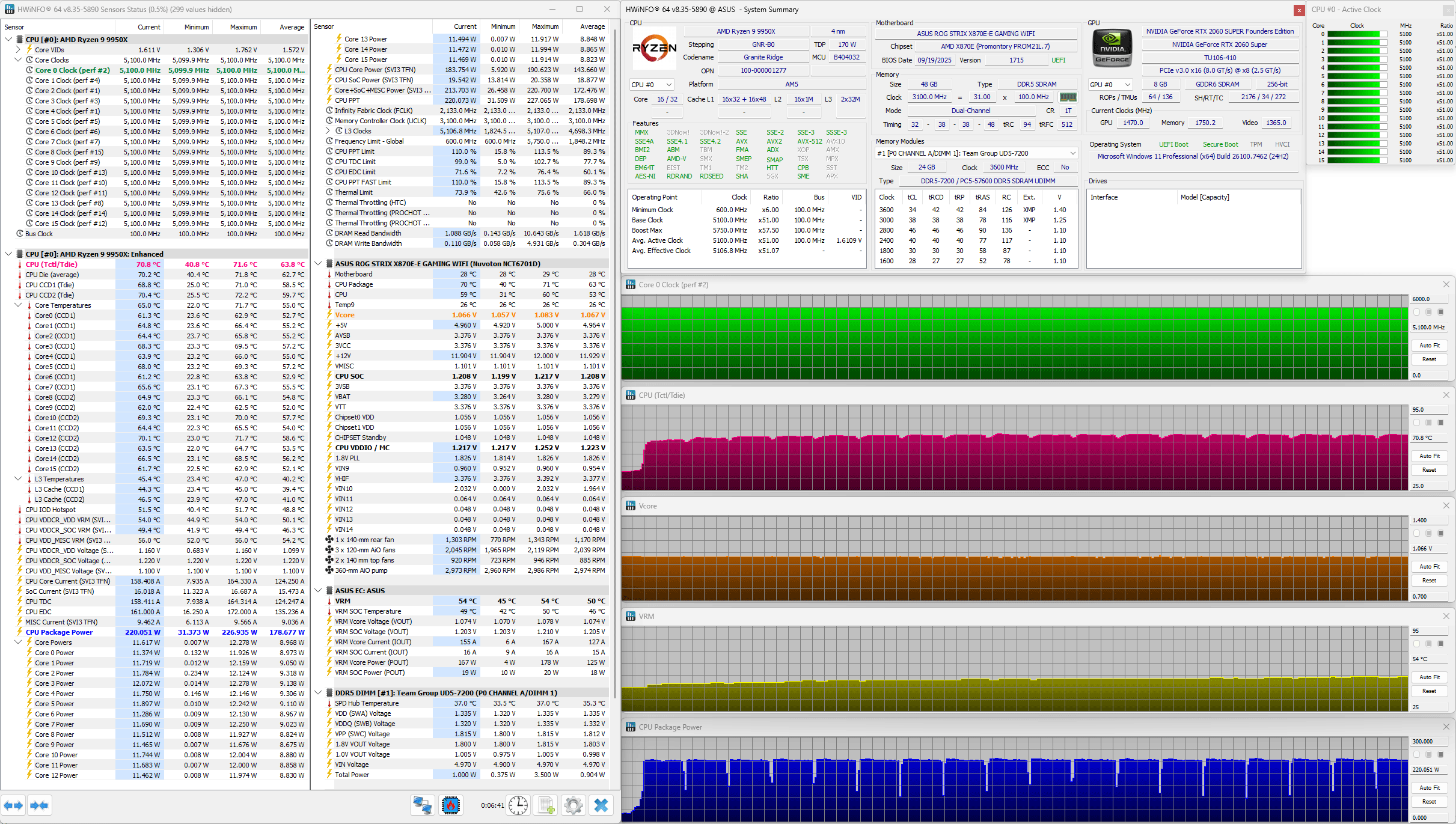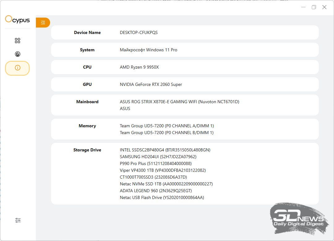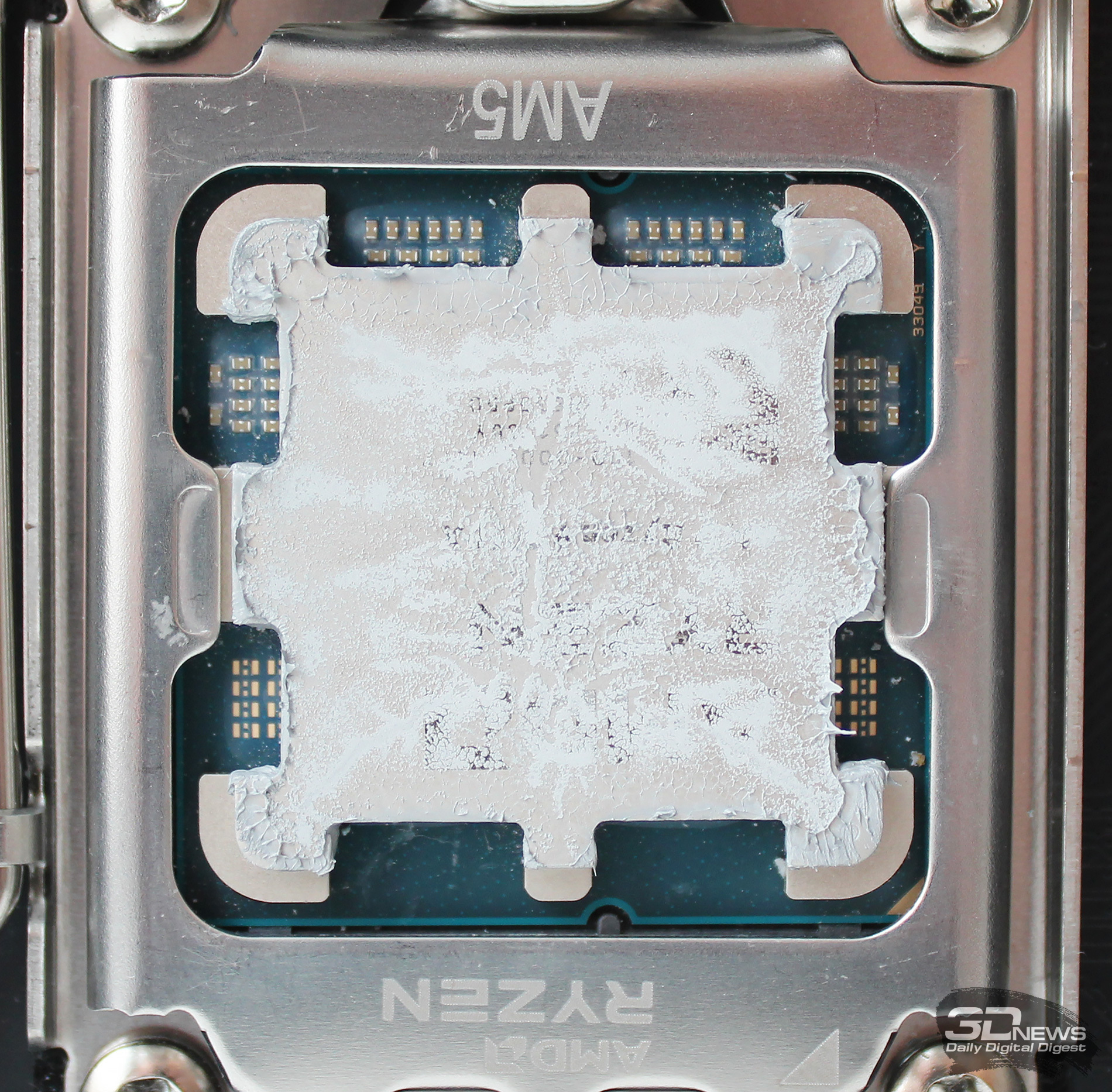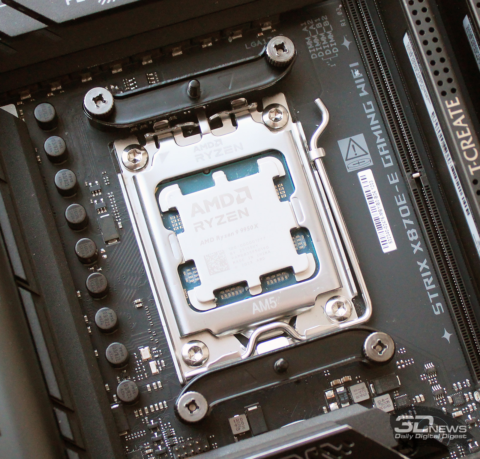 Для получения стабильных и объективно сопоставимых друг с другом результатов основные параметры процессора были зафиксированы в следующих значениях: частота BCLK – 100 МГц, множитель ядер – 51, частота – 5,1 ГГц, напряжение Vcore – 1,070-1,075 В. В BIOS материнской платы Asus был выставлен восьмой (максимальный) уровень стабилизации напряжения на ядре процессора (CPU load-line calibration). По данным HWiNFO64, уровень тепловыделения процессора с такими настройками достигал 225 ватт. Эффективная частота оперативной памяти была зафиксирована на отметке 6,2 ГГц при напряжениях 1,335/1,320 В (VDD/VDDQ), а её основные тайминги фиксировались в значениях 32-38-38-48 CR1 с дополнительной подстройкой вторичных и третичных таймингов. Напряжение VSOC фиксировалось на отметке 1,210 В. Частота коммуникационной шины Infinity Fabric (FCLK) была установлена на 2,133 ГГц. Тестирование было проведено в операционной системе Microsoft Windows 11 Pro версии 24H2 (26100.7462). Программное обеспечение, использованное для теста:
