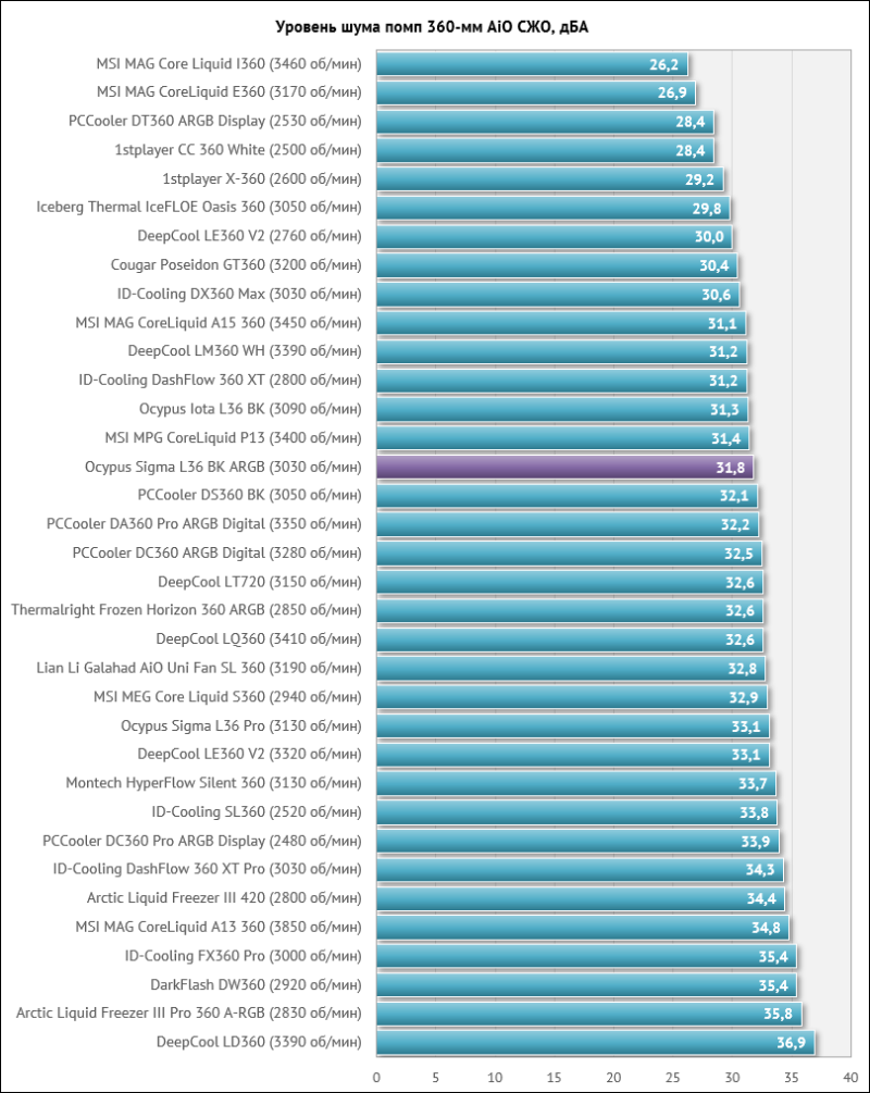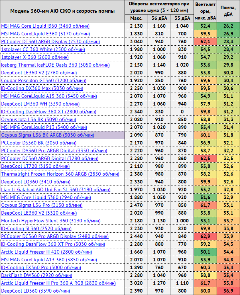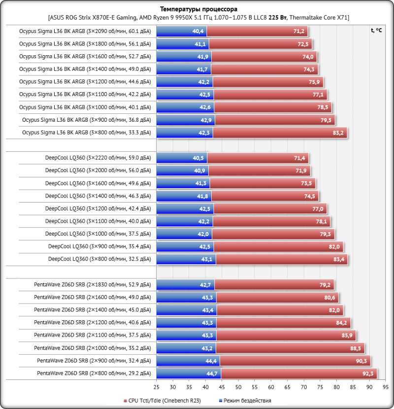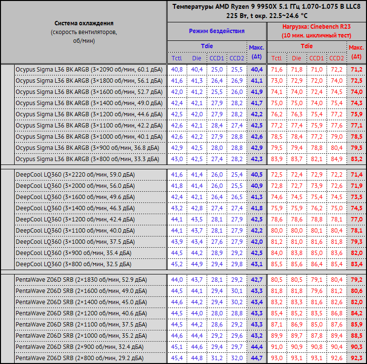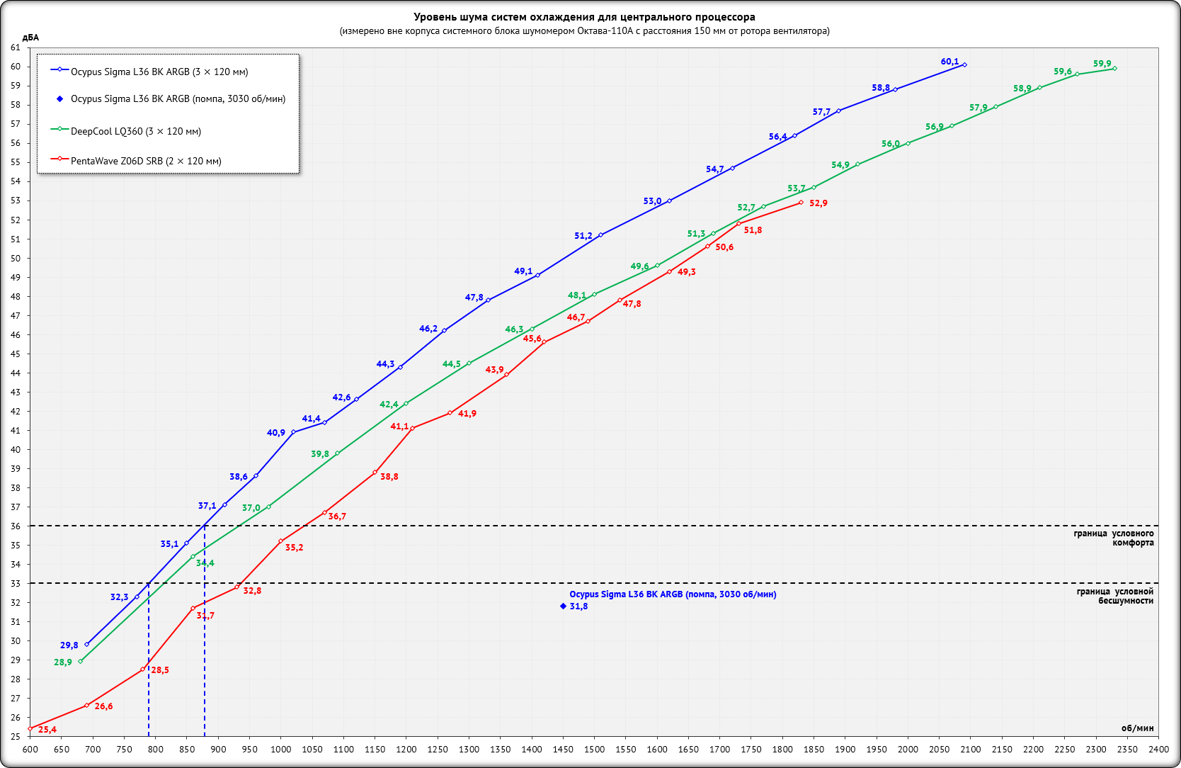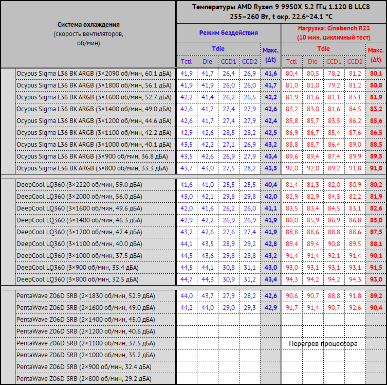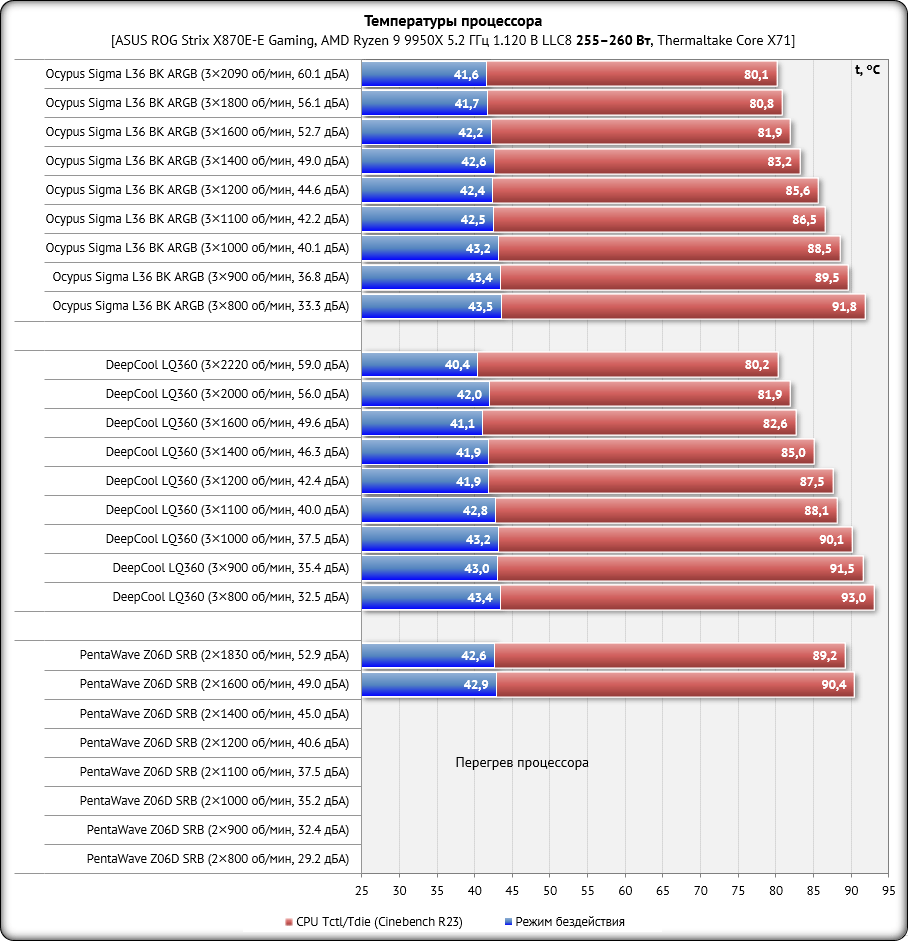 Снимок экрана мониторинга во время одного из циклов тестирования выглядит следующим образом. Нагрузка на процессор создавалась двумя последовательными циклами Cinebench R23. На стабилизацию температуры CPU между циклами отводилось по 10 минут. За окончательный результат, который вы увидите на диаграмме, принята максимальная температура по датчику Tdie в пике нагрузки и в режиме простоя с учётом корректировки на дельту температуры окружения. Кроме этого, в отдельной таблице будут приведены температуры каждого кластера ядер процессора (CCD1 и CCD2). Температура в помещении контролировалась установленным рядом с системным блоком электронным термометром с точностью измерений 0,1 °C и с возможностью почасового мониторинга изменения температуры в помещении за последние 6 часов. Во время данного тестирования температура колебалась в диапазоне 22,5–24,6 °C (дельта учитывалась в результатах). Измерение уровня шума систем охлаждения проводилось электронным шумомером «ОКТАВА-110А» в период от ноля до трёх часов ночи в полностью закрытой комнате площадью около 20 м2. Уровень шума измерялся вне корпуса системного блока, когда источником шума в помещении являлась только система охлаждения и её вентиляторы или только помпа. Шумомер, зафиксированный на штативе, всегда располагался строго в одной точке на расстоянии ровно 150 мм от ротора вентилятора. Системы охлаждения размещались на самом углу стола на подложке из вспененного полиэтилена. Нижняя граница измерений шумомера составляет 22 дБА, а субъективно-комфортный (просьба не путать с низким!) уровень шума систем охлаждения при измерениях с такого расстояния находится около отметки 36 дБА. За условно-низкий уровень шума мы принимаем значение 33 дБА. Основным соперником Ocypus Sigma L36 BK ARGB сегодня выступит система с радиатором такого же типоразмера 360 мм – DeepCool LQ360. Кроме этого, в тестирование включен воздушный суперкулер PentaWave Z06D SRB с двумя штатными вентиляторами. Добавим, что скорость вращения крыльчаток вентиляторов тестируемых систем охлаждения регулировалась в диапазоне от 800 об/мин до их максимума с шагом 100 или 200 об/мин с помощью специального контроллера, точность которого составляет ±10 об/мин. ⇡#Эффективность охлажденияОчевидно, что эффективность Ocypus Sigma L36 BK ARGB практически такая же, как и у используемой нами в качестве ориентира для всех 360-мм AiO СЖО DeepCool LQ360 – результаты тестов двух этих систем не различаются более чем на 1 градус Цельсия, за исключением режима 900 об/мин, где Ocypus эффективнее сразу на 2,5 градуса Цельсия. Что касается сравнения с суперкулером, то здесь Sigma L36 BK ARGB эффективнее PentaWave Z06D SRB на 8-9 градусов Цельсия в каждом скоростном режиме вентиляторов. Далее повышаем частоту процессора AMD Ryzen 9 9950X до 5,2 ГГц с увеличением напряжения до 1,120 В при том же восьмом уровне LLC. По данным HWiNFO64, тепловыделение процессора в таком режиме под стресс-тестом достигает 255-260 ватт, поэтому температуры заметно выросли. Тем не менее Ocypus Sigma L36 BK ARGB и в этом случае обеспечила процессору стабильность на любых скоростях вентиляторов, на что, к слову, способны далеко не все 360-мм СЖО. При увеличении нагрузки Ocypus Sigma L36 BK ARGB почти в каждом тестовом режиме оказывается чуть эффективнее DeepCool LQ360, а в среднем это 1,5-2 градуса Цельсия в пользу героини сегодняшней статьи. Воздушный кулер вновь отстаёт на 9 градусов Цельсия и не способ