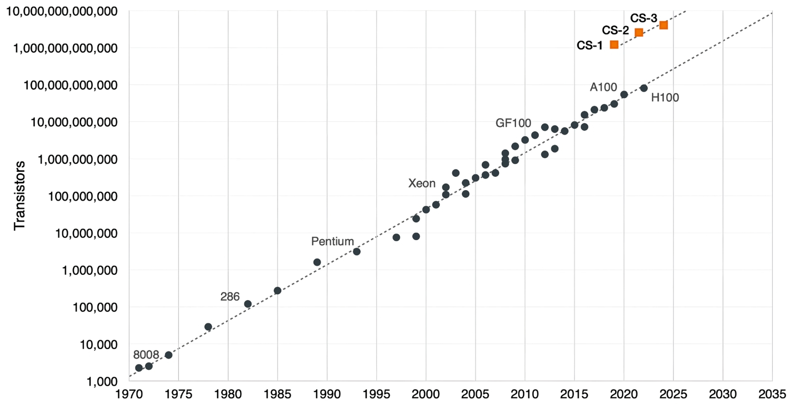 Хотя пресловутый «закон Мура» продолжает, невзирая на мрачные пророчества множества скептиков, в целом выполняться, чипы Cerebras — точнее, построенные на них серверы серии CS — уверенно воспаряют ещё выше над утверждённой этим самосбывающимся пророчеством прямой (источник: NextPlatform) Огромная площадь кристалла WSE-3 обеспечивает не просто количественное превосходство по числу вычислительных ядер над классическими по габаритам чипами —900 тыс. штук против почти 17 тыс. (плюс ещё 528 специализированных тензорных) у Nvidia H100, — но и качественное, когда речь заходит о быстроте обмена данными с памятью. Для ключевых в наши дни задач искусственного интеллекта — как тренировки, так и инференса — это едва ли не решающее преимущество. Благодаря тому, что множество ячеек SRAM на столь внушительном кристалле можно свободно размещать поближе к ядрам, характерная ширина полосы пропускания при обмене данными между первыми и вторыми достигает в случае WSE-3 21 Пбайт/с, тогда как для H100 — только 0,003 Пбайт/с. Обширные габариты чипа позволяют и шину внутренних межсоединений (fabric) сделать неимоверно скоростной просто за счёт физического наращивания числа параллельных каналов: до 214 Пбит/с против 0,0576 Пбит/с у всё того же H100. Не случайно ведущий тайваньский, а заодно и глобальный чипмейкер, TSMC, что непосредственно изготавливает царь-процессоры по заказу Cerebras, разработал специально для подобных изделий особую технологию System-on-Wafer (SoW); правда, помимо самого калифорнийского стартапа, воспользовался ею к настоящему времени ещё всего только один заказчик — Tesla. А ведь царь-чипы способны вдобавок ко всему прочему объединяться в кластеры: в случае WSE-3 — до 2048 узлов, состоящих из полнофункциональных вычислителей CS-3, что обеспечивает пиковую производительность на уровне 256 Эфлопс. Сила! Основали Cerebras, впервые громко заявившую о себе в 2019-м, когда был изготовлен и протестирован WSE-1, специалист по микропроцессорной разработке Шон Лай (Sean Lie) и Эндрю Фельдман (Andrew Feldman), ранее создатель и глава поглощённого AMD ещё в 2011-м разработчика микросерверов Sea Micro. Сегодня, из 2026-го, этот шаг кажется весьма прозорливым (даже с учётом того, что доминирует на рынке ИИ-ориентированных вычислителей до сих пор всё-таки Nvidia — со своими вполне классическими по габаритам ГП): Лай и Фельдман с самого начала рассчитывали создать систему, пригодную именно для тренировки и исполнения моделей искусственного интеллекта. Уже в те времена пригодность актуального «железа» для машинного обучения проверяли с использованием бенчмарка MLPerf, который фиксировал скорость тренировки модельной нейросети (с исходно нулевыми весами) до такого состояния, когда та оказывалась способна решать, не выходя за пределы заданных погрешностей, ряд практических задач: распознавания образов, визуальной идентификации объектов (отдельно на больших и на малых изображениях), а также обработки команд на естественном языке. Так вот, типичные для той поры аппаратные платформы — суперкомпьютеры классической архитектуры, по сути; ведь ставшие чуть позже основой ИИ-вычислений Nvidia A100 появились только в 2020-м, — тратили на полное прохождение MLPerf по несколько часов. За что приходилось, в свою очередь, выкладывать десятки миллионов американских долларов: суперкомпьютерное время никогда не было дешёвым.
