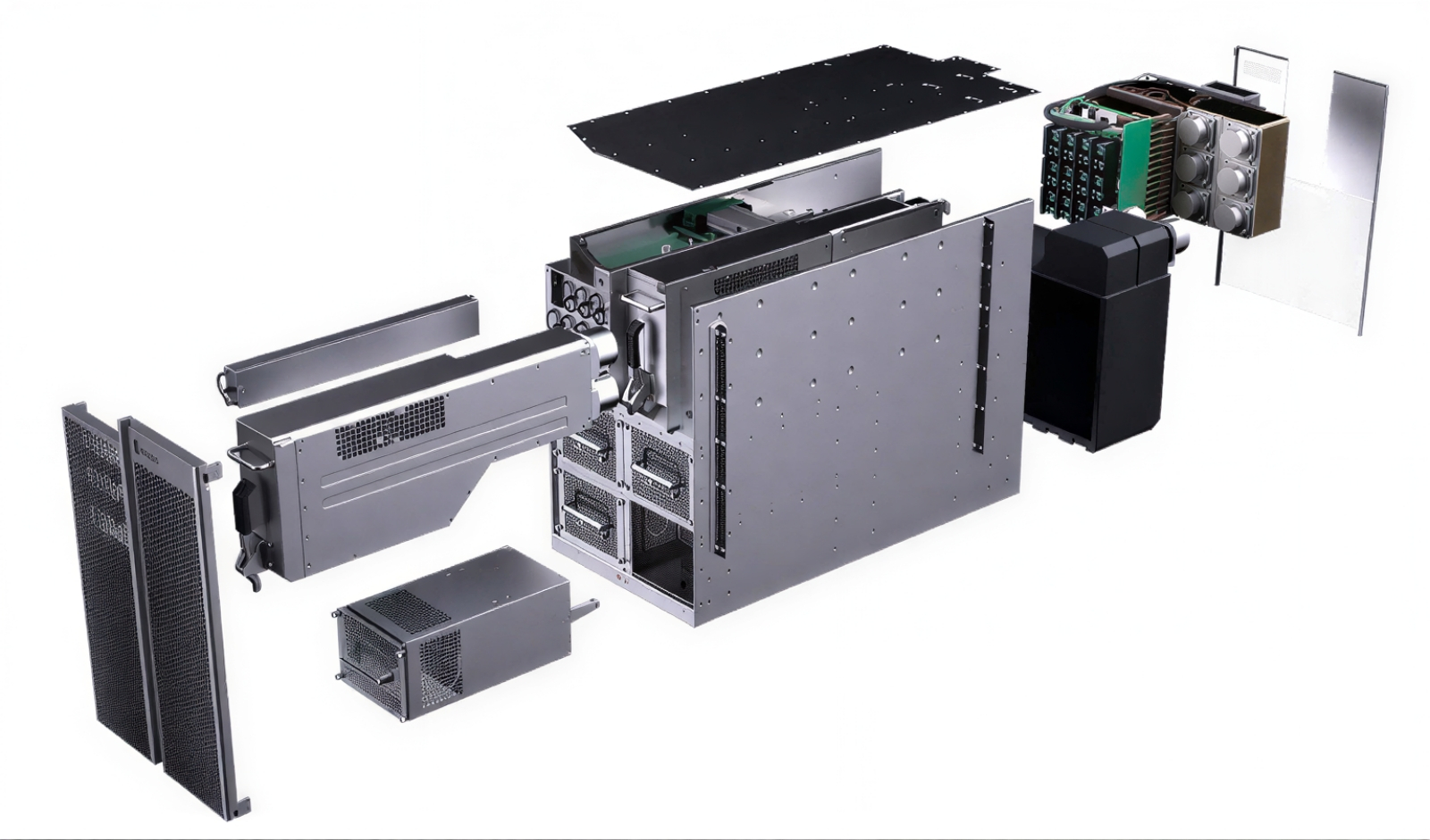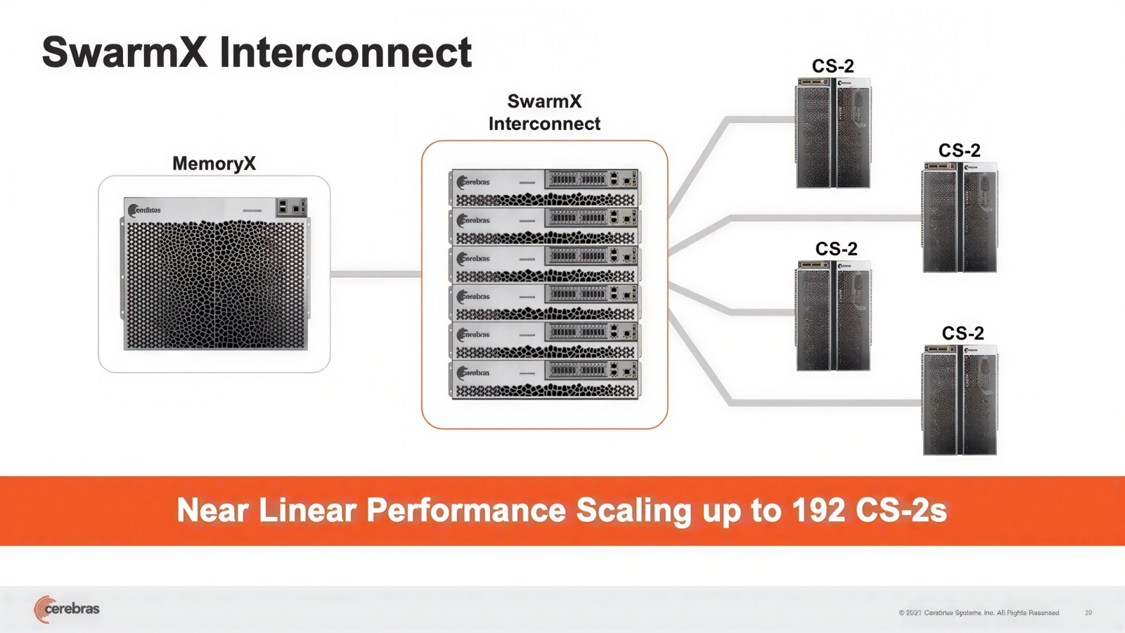 Разработчикам WSE-1 пришлось самим проектировать и корпус для своего царь-чипа, и готовую справляться с его чудовищным теплорассеянием систему охлаждения, — до них такие задачи никто не решал (источник: Cerebras) ⇡#Зримые достоинстваНеоптимальность фоннеймановских систем для решения задач машинного обучения — и прежде всего для работы с по-настоящему крупными матрицами — отмечается давным-давно. Проблема только в том, что именно в базирующиеся на принципах фон Неймана полупроводниковые компьютеры вложены за много десятилетий такие объёмы инвестиций, что догнать их за разумное время сколь угодно перспективным вычислителям иных типов чрезвычайно непросто. Предложенная Cerebras идея царь-чипа представлялась в конце 2010-х вполне разумным компромиссом: с одной стороны, для изготовления такой микросхемы применимы уверенно поставленные на поток технологии; с другой — объём памяти SRAM уже первой его версии, WSE-1 (18 Гбайт), позволял целиком загружать туда любую актуальную на тот момент БЯМ — и не тратить тем самым драгоценные процессорные циклы на перенос промежуточных данных из внешнего ОЗУ (DRAM) к вычислительным ядрам и обратно. Правда, развитие генеративных моделей оказалось настолько стремительным, что это бесспорное преимущество царь-процессоров довольно скоро потеряло актуальность: в 18 Гбайт для них начало становиться тесновато, а увеличивать объём SRAM за счёт сокращения числа вычислительных ядер было бы крайне нерационально. По этой причине уже в 2021 г. следующее поколение компьютеров Cerebras, CS-2, обзавелось внешней (по отношению к самому царь-чипу) подсистемой хранения данных MemoryX и контроллером межсоединений (fabric machine) SwarmX. Зона MemoryX образована модулями памяти DRAM и NAND, поскольку далеко не все перцептроны в составе глубокой нейросети задействованы единомоментно в процессе её обучения, и потому не всем им необходимо располагаться в максимальной близости от вычислительных ядер. Правда, переход к использованию внешней памяти ощутимо сказался на скорости обмена данными в пределах вычислительного кластера. Для объединения машин CS-2 использовалась среда переноса данных SwarmX на основе каналов 100GbE с применением технологии RoCE RDMA, что позволяло достичь пропускной способности в 150 Тбит/с. Для сравнения: NVLink 6.0, обеспечивающий соединения между узлами платформы Nvidia Rubin в крупномасштабных конфигурациях (74 ГП в стойке), за счёт сверхплотной среды обмена all-to-all mesh позволяет передавать до 260 Тбайт/с.