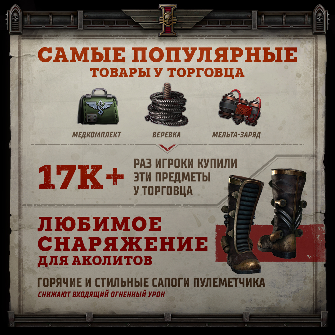 - любимый элемент снаряжения аколитов — сапоги пулемётчика (снижают входящий огненный урон);
