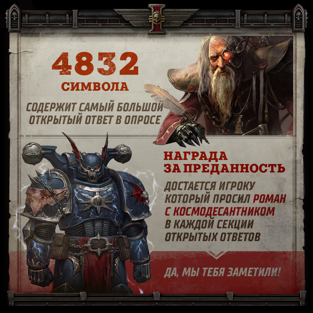 - разработчики отметили наградой за преданность пользователя, который в каждой открытой секции опроса просил добавить в игру роман с космодесантником.