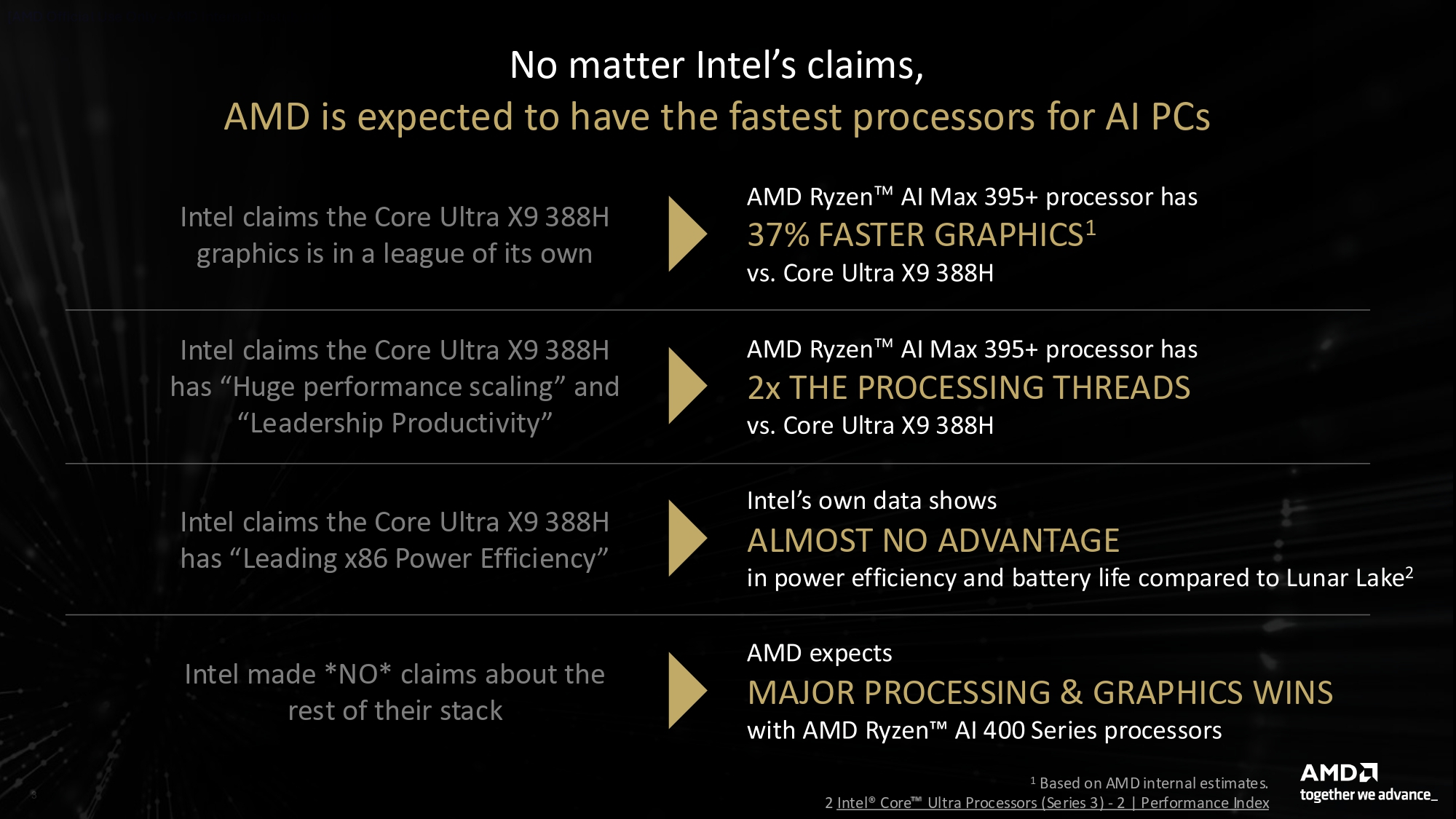 AMD также опровергает утверждения Intel об эффективности её процессоров, ссылаясь на её же (Intel) материалы и утверждая, что эти данные показывают незначительное или полное отсутствие преимуществ в энергоэффективности и времени автономной работы новых процессоров Panther Lake по сравнению с предшественниками Lunar Lake. На том же слайде утверждается, что Intel не делала никаких заявлений о производительности, энергопотреблении или возможностях ИИ для остальных процессоров линейки, а затем говорится, что Ryzen AI 400 должны лидировать по производительности и графике в этих сегментах.