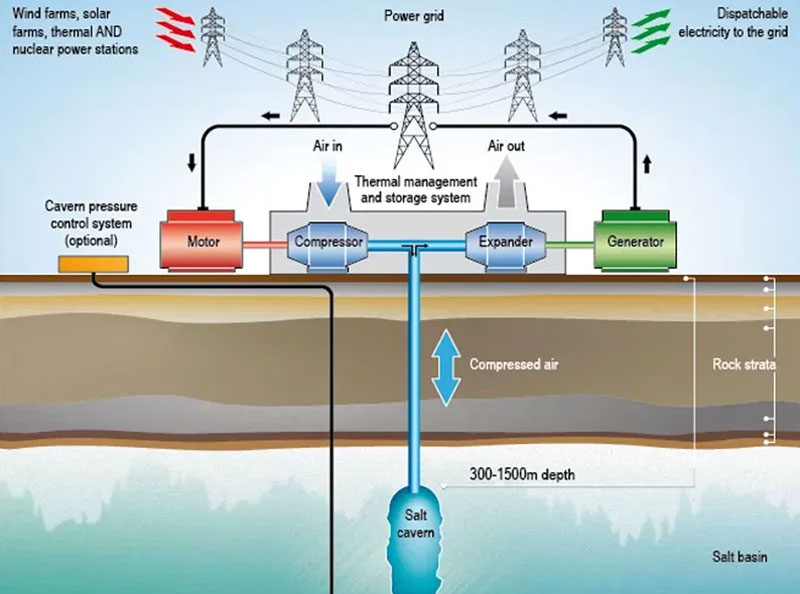 Технология CAES позволяет накапливать избыточную энергию солнца и ветра, сжимая воздух и закачивая его в подземные резервуары в моменты наивысшей выработки. Ночью, в штиль и в моменты наибольшего потребления электричества воздух извлекается из хранилища и направляется на турбины, вращая генераторы и вырабатывая электроэнергию. Такой подход обеспечивает длительное хранение энергии по более низкой стоимости по сравнению с большинством аккумуляторных технологий.