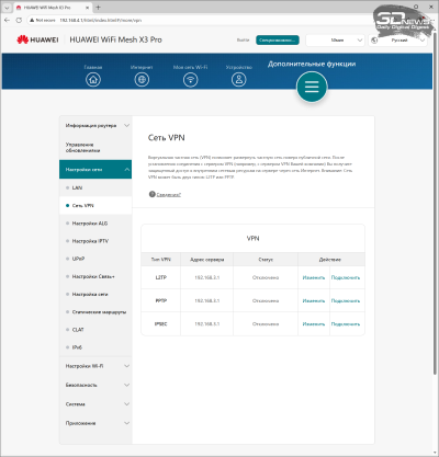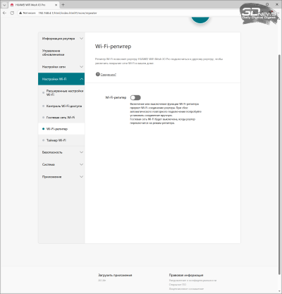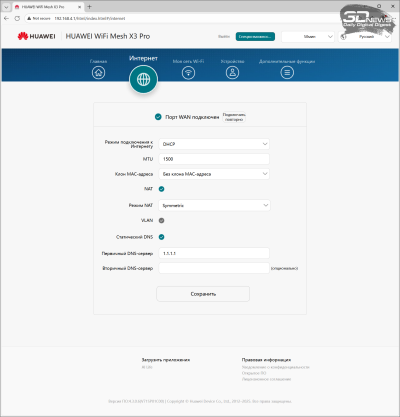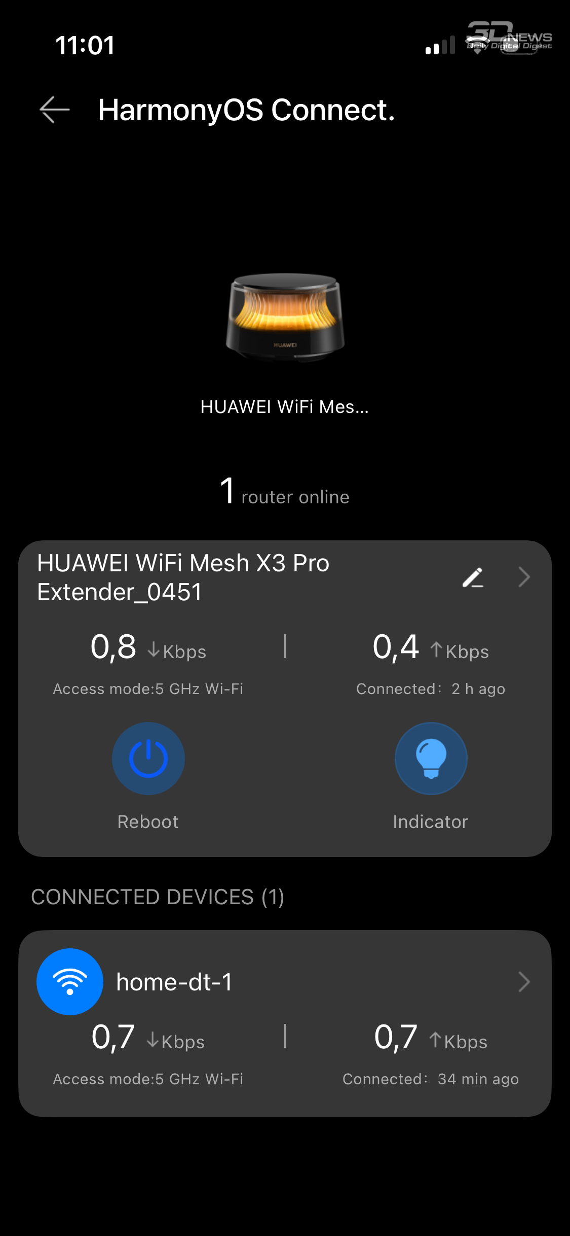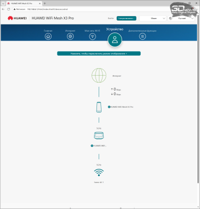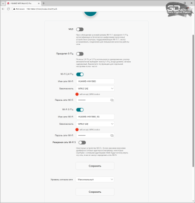 В период работы над обзором HUAWEI WiFi Mesh X3 Pro был доступен для предзаказа в России за сумму 16 999 руб., а стоимость полного комплекта с сателлитом равнялась 24 999 руб. Сателлитов в одной сети может быть и больше одного, но тогда придется докупить необходимое количество. ⇡#КонструкцияВ отличие от подавляющего большинства сетевых устройств в скучных прямоугольных корпусах, герой обзора представляет собой усеченный конус из прозрачного пластика, а внутри находится хрустальная гора с подсветкой. По умолчанию подсветка имеет янтарный цвет, но в мобильном приложении AI Life можно изменить ее цветовую температуру (от густого оранжевого до нейтрально-белого), яркость или сделать так, чтобы они соответствовали времени суток и погоде за окном. Включить или выключить подсветку можно и постукиванием по крышке корпуса. Специально для WiFi Mesh X3 Pro были созданы прозрачные антенны — как утверждает HUAWEI, первые во всей индустрии. Маршрутизатор имеет две антенны для диапазона 2,4 ГГц и четыре — для 5 ГГц. Сателлит — поменьше главного маршрутизатора. Под стеклом у него — строгая геометрическая фигура вместо горы, но она тоже светится в соответствии с заданными настройками. Провода заходят снизу и, если проделать в мебели отверстия, могут быть полностью скрыты. Сам маршрутизатор HUAWEI WiFi Mesh X3 Pro имеет два порта 2.5GbE, любой из которых может использоваться для WAN-соединения, а сателлит — единственный порт GbE. Оба устройства пользуются активным охлаждением, но вентиляторы работают практически бесшумно. В комплект поставки HUAWEI WiFi Mesh X3 Pro входят блоки питания устройств и черный патч-корд. Программное обеспечение HUAWEI WiFi Mesh X3 Pro работает под управлением фирменной операционной системы HarmonyOS. Ее графическая оболочка рассчитана на рядовых пользователей, а не энтузиастов, что заметно по узкому репертуару функций. Тем не менее необходимые подавляющему большинству владельцев службы здесь реализованы, а настроить маршрутизатор очень просто. WAN-подключение возможно только по IP или PPPoE. Зато есть выбор между двумя типами NAT — симметричным и коническим. Последний облегчает проброс портов для P2P-протоколов, VoIP и онлайн-гейминга. В ОС встроены утилиты ping и traceroute для диагностики канала. Из всех возможных VPN-клиентов доступны лишь PPTP (с шифрованием MPPE или без него), L2TP без IPsec и чистый IPsec. VPN-серверов (как и функции DDNS) и файловых серверов в прошивке нет. Как видно по количеству разъемов на устройстве, развитая кабельная сеть здесь не является приоритетом. Соответствующий раздел интерфейса ОС позволяет отключить функцию автоопределения WAN, деактивировать отдельный порт или ограничить его скорость, но отсутствуют такие функции, как VLAN в локальной сети (только для WAN-сегмента) и агрегация портов. Другое дело — разделы, посвященные Wi-Fi. Маршрутизатор позволяет создать единый SSID для радио 2,4 и 5 ГГц с функцией приоритета 5 ГГц (иными словами, Band Steering), MLO, а также резервный SSID в диапазоне 5 ГГц для legacy-клиентов и гостевой SSID. Радио 5 ГГц в тестовым образце HUAWEI WiFi Mesh X3 Pro поддерживает большинство «мировых» каналов — от 32-го до 64-го и от 100-го до 140-го. Часть из них недоступна без лицензирования в России, но мы предполагаем, что в коммерческих партиях маршрутизатора лишние каналы уберут. Задать код региона Wi-Fi невозможно, и он вообще не транслируется. Доступна трехступенчатая регулировка мощности пер