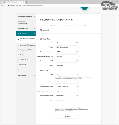 Как видим, маршрутизатор способен насытить мультигигабитный канал WAN в режиме простого NAT или PPPoE, а вот VPN-клиенты поддерживаемых протоколов работают очень медленно. От PPTP (не важно, с шифрованием или нет) в принципе не приходится ожидать высокой скорости, однако и результаты L2TP (причем без IPsec) оказались немногим лучше. ⇡#Результаты тестирования: Wi-FiТестирование беспроводной сети выполнено на той же платформе, только под управлением Windows 11 25H2. В качестве беспроводного NIC использовался Qualcomm NCM865 с антеннами Taoglas GW.52.A153. Тестовый стенд находился в прямой видимости на расстоянии 2 м от подопытного устройства. Мощность передатчиков — средняя, стандарт безопасности Wi-Fi — WPA3. Для точки доступа 5 ГГц из каналов от 32-го до 64-го был выбран 52-й как самый чистый от соседских сетей. Каналы 132 и выше не рассматривались т. к. они не позволяют сформировать единую полосу пропускания 160 МГц в российском диапазоне. Проблемы взаимной совместимости различных точек доступа и клиентов Wi-Fi 7 (в том числе и региональные) хорошо известны. В прошлый раз, когда нам пришлось работать с маршрутизатором нового стандарта, адаптер Qualcomm NCM865 смог установить подключение в режиме IEEE 802.11be только после смены региона точки доступа с России на США. В случае HUAWEI WiFi Mesh X3 Pro это оказалось невозможно, поэтому все тесты пришлось выполнить в режиме ax. Впрочем, мы уже знаем, что переход к Wi-Fi 7 не дает никаких ощутимых преимуществ вне диапазона 6 ГГц, в том числе и при объединении каналов 2,4 и 5 ГГц с помощью MLO, а HUAWEI WiFi Mesh X3 Pro и так развивает завидную скорость передачи данных на волне 5 ГГц — свыше 1 800 Мбит/с в одну сторону при условии, что клиент и маршрутизатор находятся в одной комнате. В диапазоне 2,4 ГГц выбор канала, как правило, не имеет большого значения в силу большой зашумленности (мы использовали 11-й). Тем не менее и здесь нам удалось добиться неплохих результатов — вплоть до 250 Мбит/с.