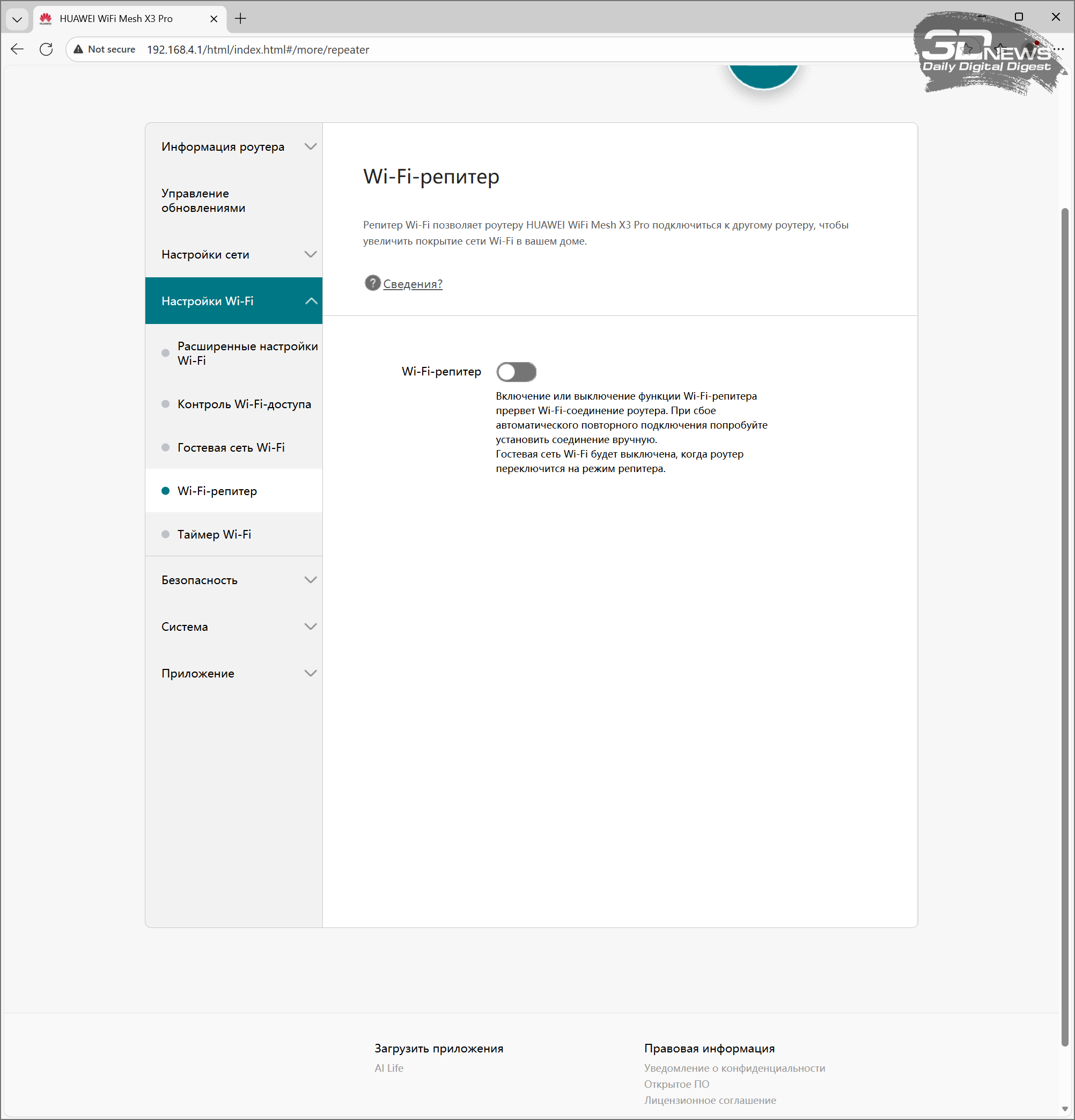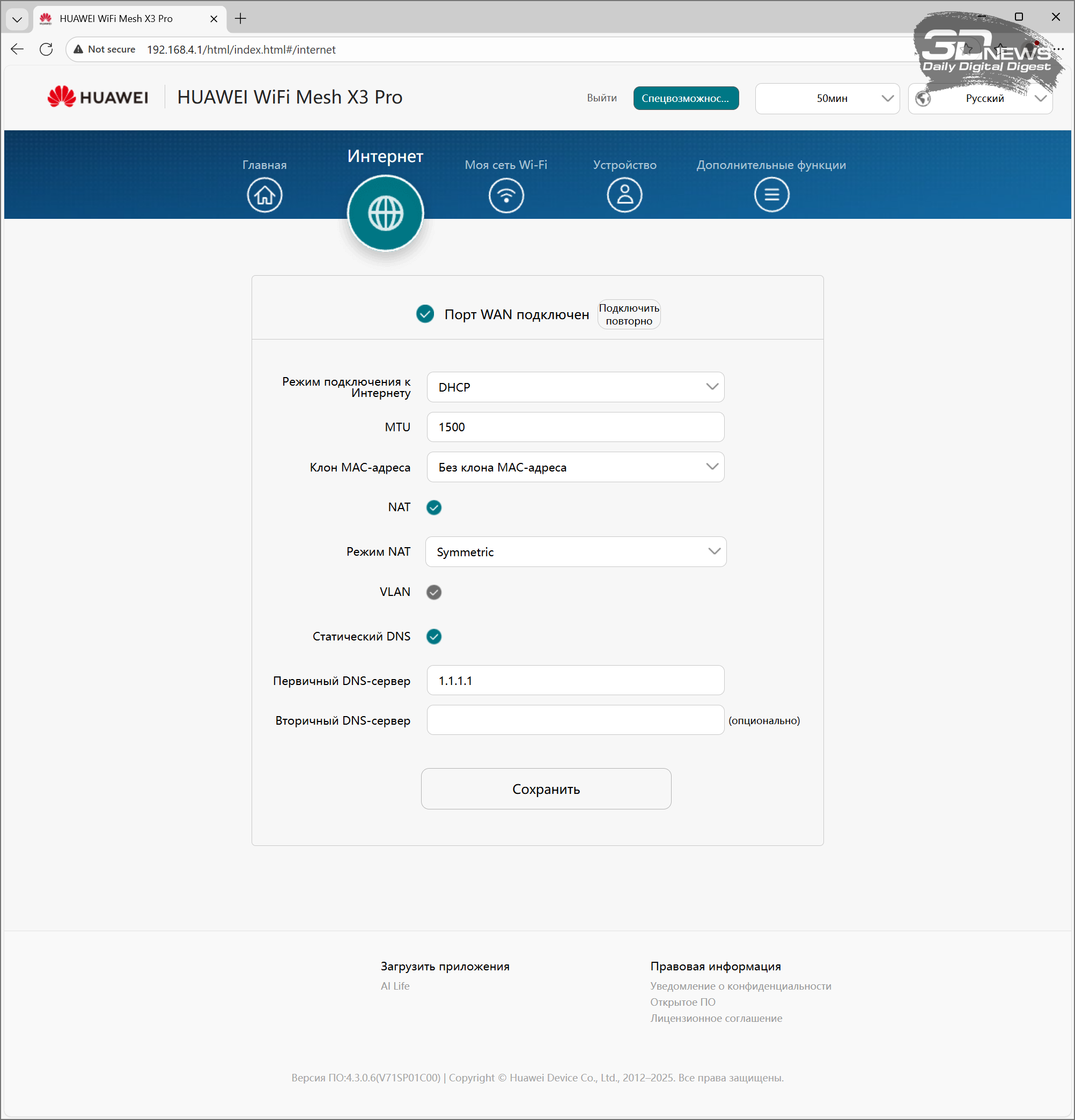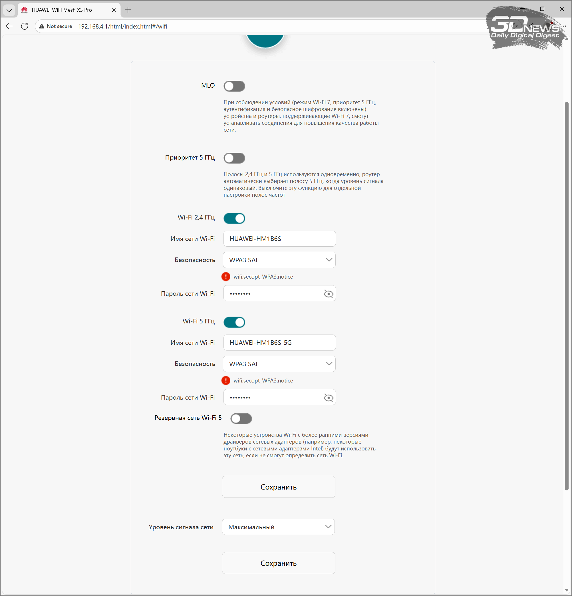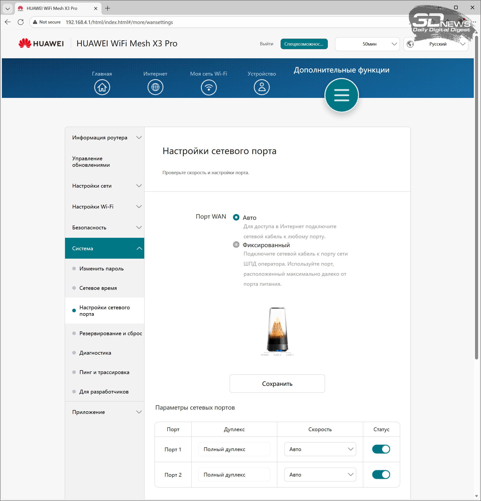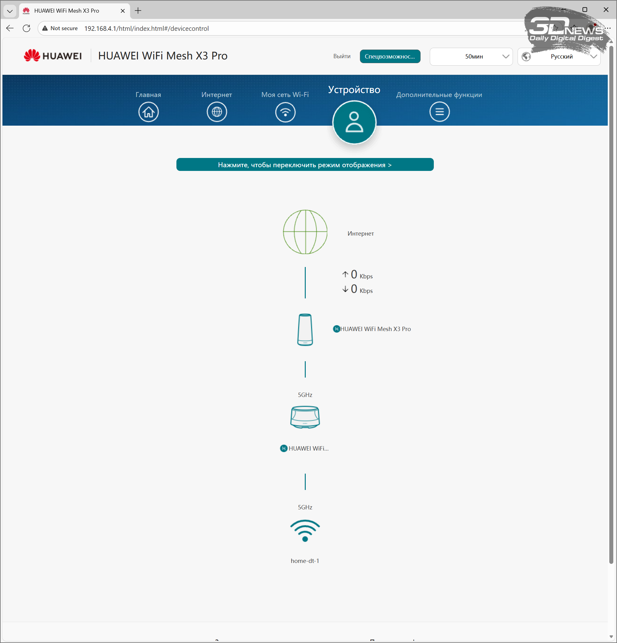 Ручеек домашних маршрутизаторов стандарта Wi-Fi 7, которые официально поставляют в Россию, еще не превратился в реку, но сейчас хотя бы есть из чего выбрать. WiFi Mesh X3 Pro — новейший представитель этой категории от HUAWEI, однако, как хорошо видно на фото, совместимость с Wi-Fi 7 — не самое важное из его качеств. Технические характеристики, цена В силу того, что многие продукты HUAWEI комплектуются чипами дочерней компании — HiSilicon, зачастую не известно никаких деталей об их начинке. В официальных спецификациях маршрутизатора фигурирует лишь объем оперативной и flash-памяти — 128 и 512 Мбайт соответственно. Зато известна формула MIMO: 2×2:2 в каждом из диапазонов — 2,4 и 5 ГГц, а значит, совокупная канальная скорость беспроводной сети здесь равна 3 570 Мбит/с. В теории ее может освоить один клиент благодаря MLO — одной из ключевых функций стандарта Wi-Fi 7. Впрочем, даже если бы технология MLO в отрыве от диапазона 6 ГГц несла практическую пользу, следующим препятствием оказалась бы скорость интерфейса WAN — устройство имеет два порта 2.5GbE без агрегации. Герой обзора рассчитан на работу в составе mesh-сети со специальным сателлитом. Последний можно подключить к головному устройству через гигабитный проводной Ethernet либо использовать в качестве беспроводного ретранслятора.