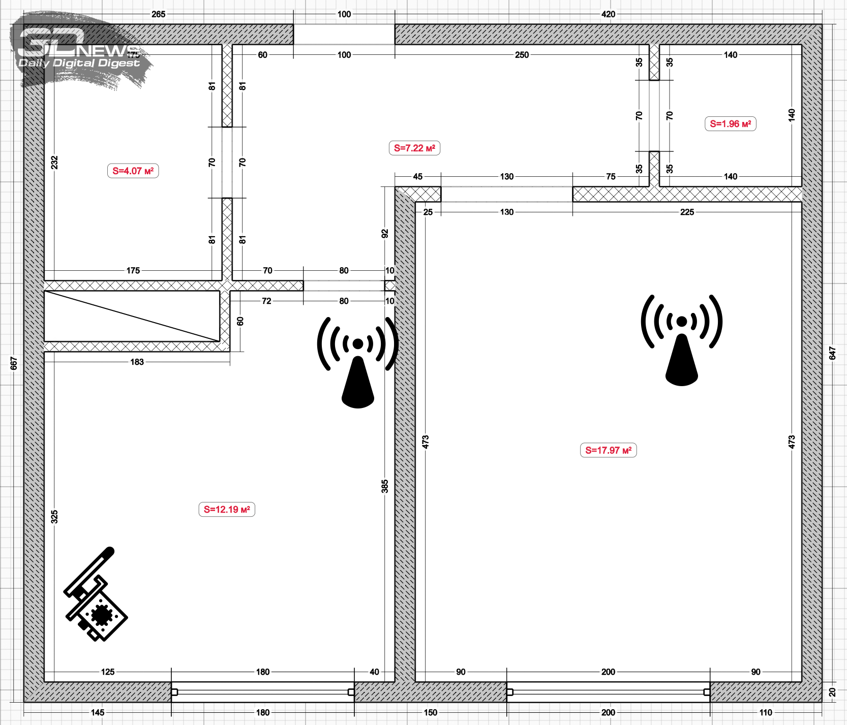 Наконец, мы измерили пропускную способность mesh-сети на основе главного маршрутизатора HUAWEI WiFi Mesh X3 Pro с комплектным сателлитом при использовании беспроводного бэкхола. Такая конфигурация лучше всего подходит для частных домов, в которых устройства могут находиться в прямой видимости друг от друга, а перекрытия и межкомнатные перегородки часто делают из умеренно радиопрозрачных материалов. А что произойдет в типичной бетонной квартире, где проблема покрытия связана не столько с расстоянием, сколько с аттенюацией сигнала? Действительно, несущая стена между маршутизатором и клиентом вдвое снизила скорость передачи данных в диапазоне 5 ГГц и втрое — в диапазоне 2,4 ГГц, несмотря на то, что мощность передатчика была увеличена до максимальной. Абсурдно рассчитывать на то, что репитер восстановит пропускную способность до таких же величин, как в условиях примой видимости. Наоборот, битрейт канала 5 ГГц в направлении от беспроводного клиента к маршрутизатору только снизился. Зато скорость «скачивания», которая в большинстве случаев важнее, действительно увеличилась на 100 Мбит/с и больше, а битрейт 2,4 ГГц заметно вырос при передаче данных в любую сторону.