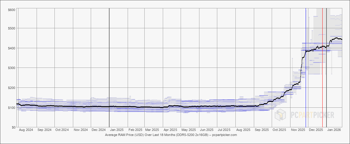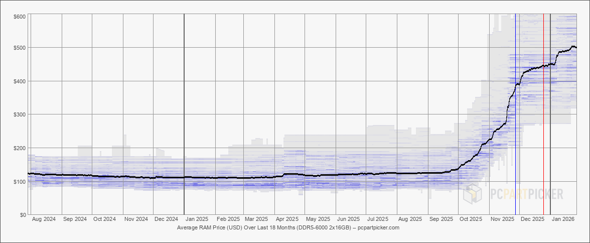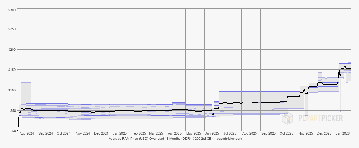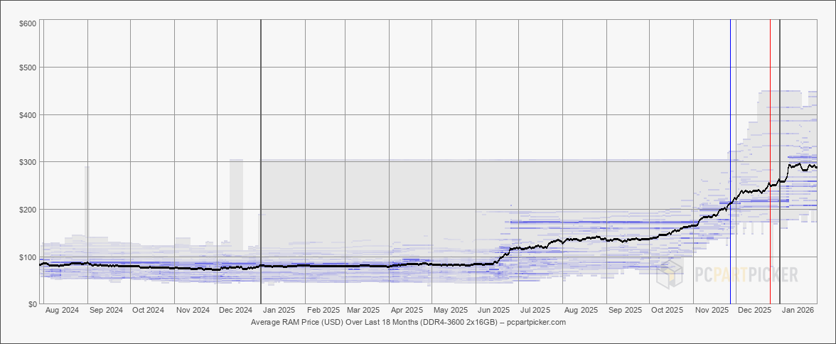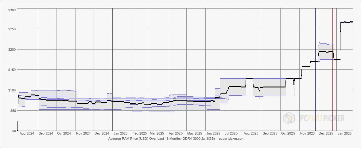 После нескольких месяцев постоянного активного роста цены на оперативную память на рынке США демонстрируют некоторую стабилизацию, пишет портал Tom’s Hardware. Это видно по данным о ценах, собранным платформой для сборки ПК PCPartPicker.com.