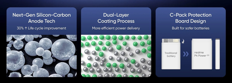 Компания Realme выпустила P4 Power — смартфон с очень ёмкой кремний-углеродной батареей на 10 001 мА·ч. Производитель заявляет для новинки лучшую автономность в своём классе. Компания также обещает, что батарея сохранит не менее 80 % от своей первоначальной ёмкости после 8 лет использования. Аккумулятор рассчитан на 1650 циклов зарядки.
