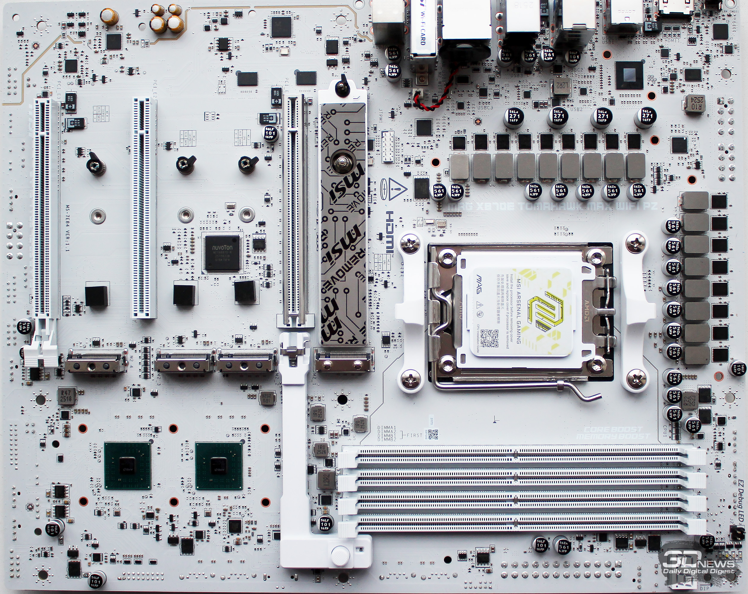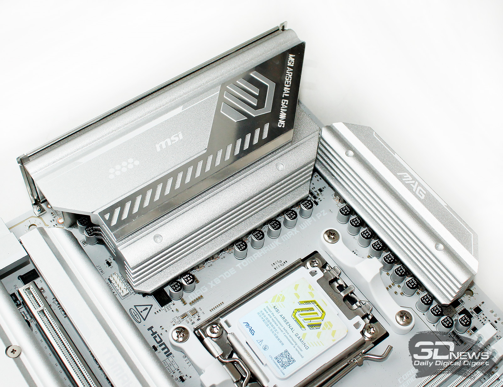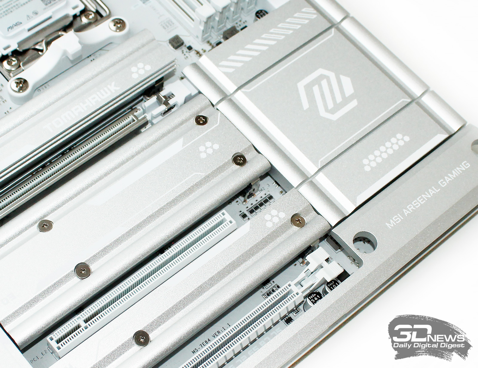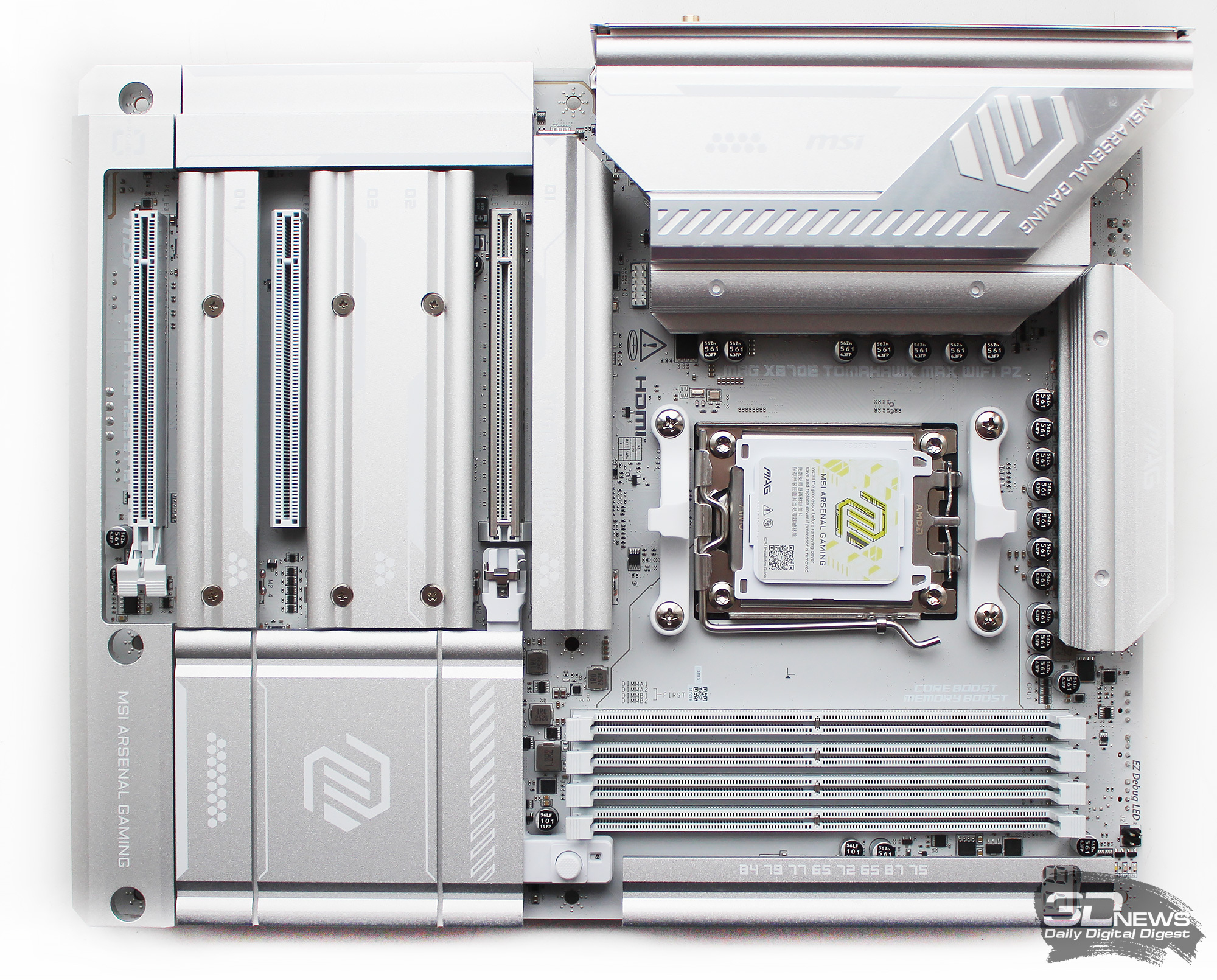 ⇡#Упаковка и комплектацияПлата MSI MAG X870E Tomahawk WIFI PZ входит в серию MSI Arsenal Gaming, поэтому её коробка оформлена в соответствующем стиле с нотками милитари. На её лицевой стороне указано название модели и серии платы, поддерживаемые процессоры и технологии, а на обратной приведено фото устройства, перечень ключевых особенностей и краткие характеристики с портами ввода-вывода. На торце коробки приклеен стикер с серийным номером платы, штрихкодами и страной производства (Китай). Внутри цветной оболочки плата защищена коробкой из плотного картона, где лежит в антистатическом пакете на специальном поддоне, исключающем вероятность повреждения коннекторов с обратной стороны печатной платы. Под крышкой этого поддона находится довольно полный набор аксессуаров, в числе которых антенна беспроводного модуля связи, два кабеля SATA, кабель передней панели корпуса EZ, кабель EZ Conn, кабель подсветки ARGB, винты для накопителей в портах M.2 и ключик, краткая инструкция и гарантия, купон MSI Shout Out и комплект наклеек. Также в комплект входит маленький флеш-накопитель объёмом 32 Гбайт, где записаны утилиты и драйверы. Никакой защиты в нём нет, поэтому после установки всего программного обеспечения флешку можно использовать для собственных нужд. Стоимость MSI MAG X870E Tomahawk WIFI PZ составляет 31 999 рублей, что для плат на наборе системной логики AMD X870E является средним уровнем (даже чуть ниже среднего). Также отметим, что в России на данный продукт предоставляется трёхлетняя гарантия. ⇡#Дизайн и особенностиMSI MAG X870E Tomahawk WIFI PZ выполнена в форм-факторе ATX (244 × 305 мм) на светло-сером текстолите, а все радиаторы на ней серебристого цвета, что делает эту модель визуально лёгкой и сияющей под любым освещением. Дизайн радиаторов платы лаконичный, но не строгий, как в более привычных чёрных версиях. Здесь чувствуются какие-то зимние нотки: холод, коньки и лёд… При этом все грани радиаторов, которых здесь более чем в достатке, аккуратно обработаны, пораниться о них невозможно. Панель портов ввода-вывода интегрирована в плату и выкрашена в белый цвет, что соответствует общей стилистике продукта. Набор интерфейсов можно назвать исчерпывающим. Здесь сразу двенадцать портов USB, включая три Type-C с пропускной способностью 40 и 10 Гбит/с, видеовыход HDMI версии 2.1, сетевой порт 5G и два коннектора SMA для антенн беспроводного модуля связи (2T2R), два 3,5-мм аудиоразъёма и оптический выход, а также две утопленные в поверхность кнопки – Flash BIOS и Clear CMOS. Схемы расположения всех элементов и портов на MSI MAG X870E Tomahawk WIFI PZ приводим ниже, где хорошо видно, что все коннекторы вынесены на обратную сторону печатной платы. Крепления всех элементов на плате винтовые, поэтому с их снятием проблем не возникло. Вот как выглядит MSI MAG X870E Tomahawk WIFI PZ без навесных элементов. В её основе лежит восьмислойная печатная плата, произведённая по фирменной технологии «PCB Fabric», благодаря которой, по информации MSI, обеспечена повышенная пропускная способность, снижены потери сигнала, достигнут более точный контроль сопротивления и повышенная термостабильность в условиях предельных нагрузок. Процессорный сокет конструктивного исполнения AM5 выпущен компанией Lotes и поддерживает установку любых вышедших к сегодняшнему дню процессоров AMD. Перечень совместимых с платой процессоров приведён на странице поддержки. В него входят все выпущен
