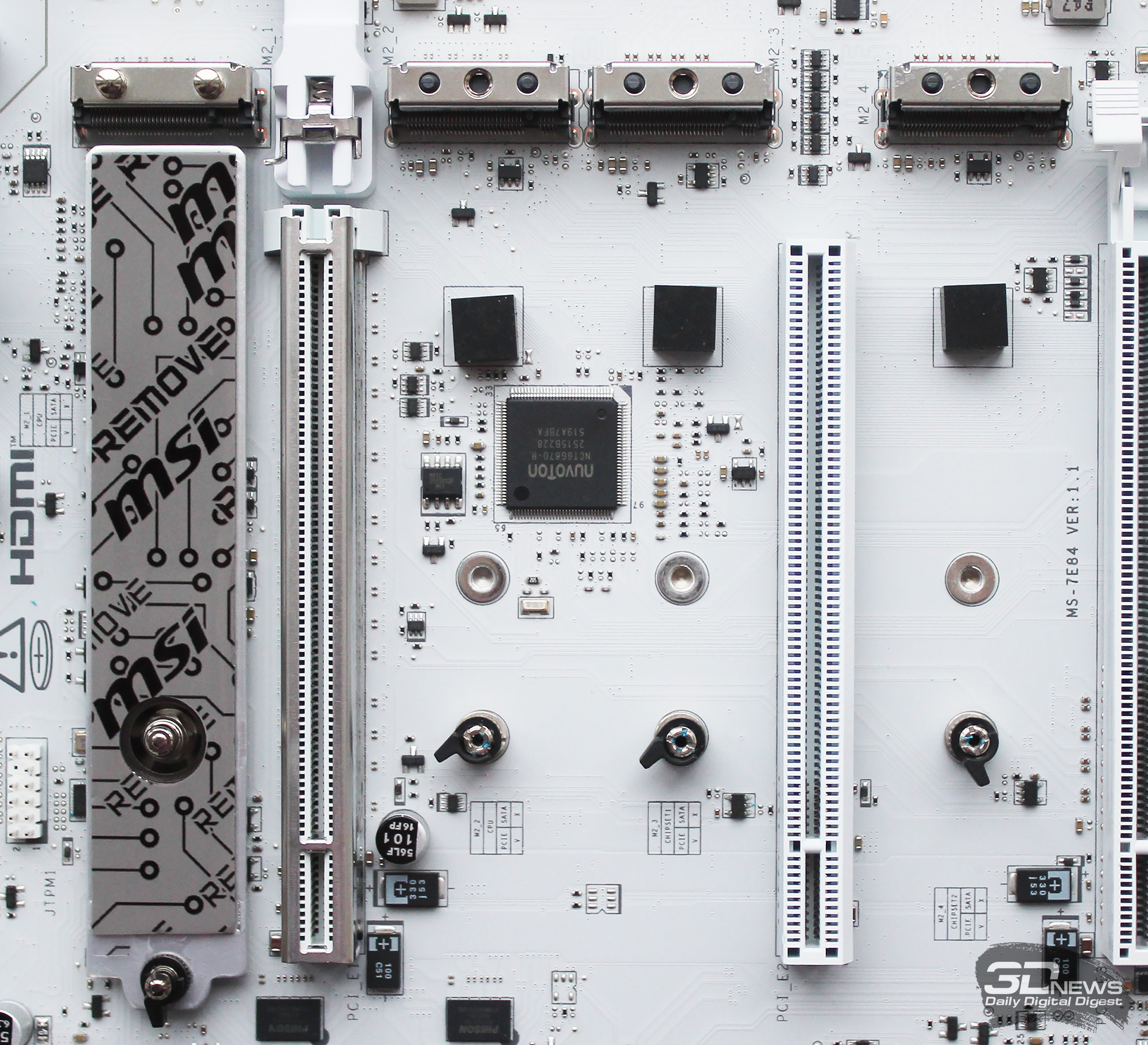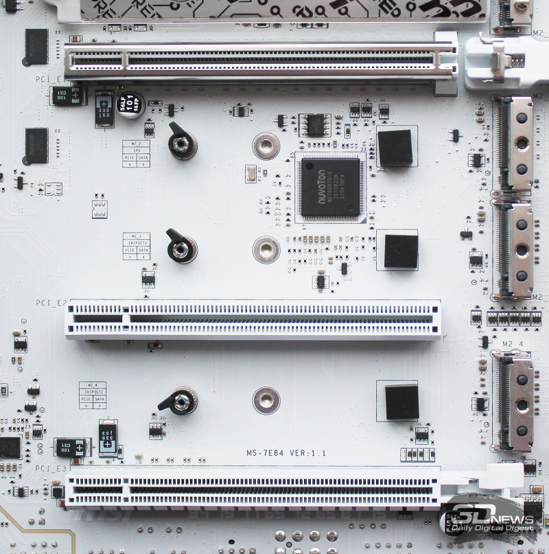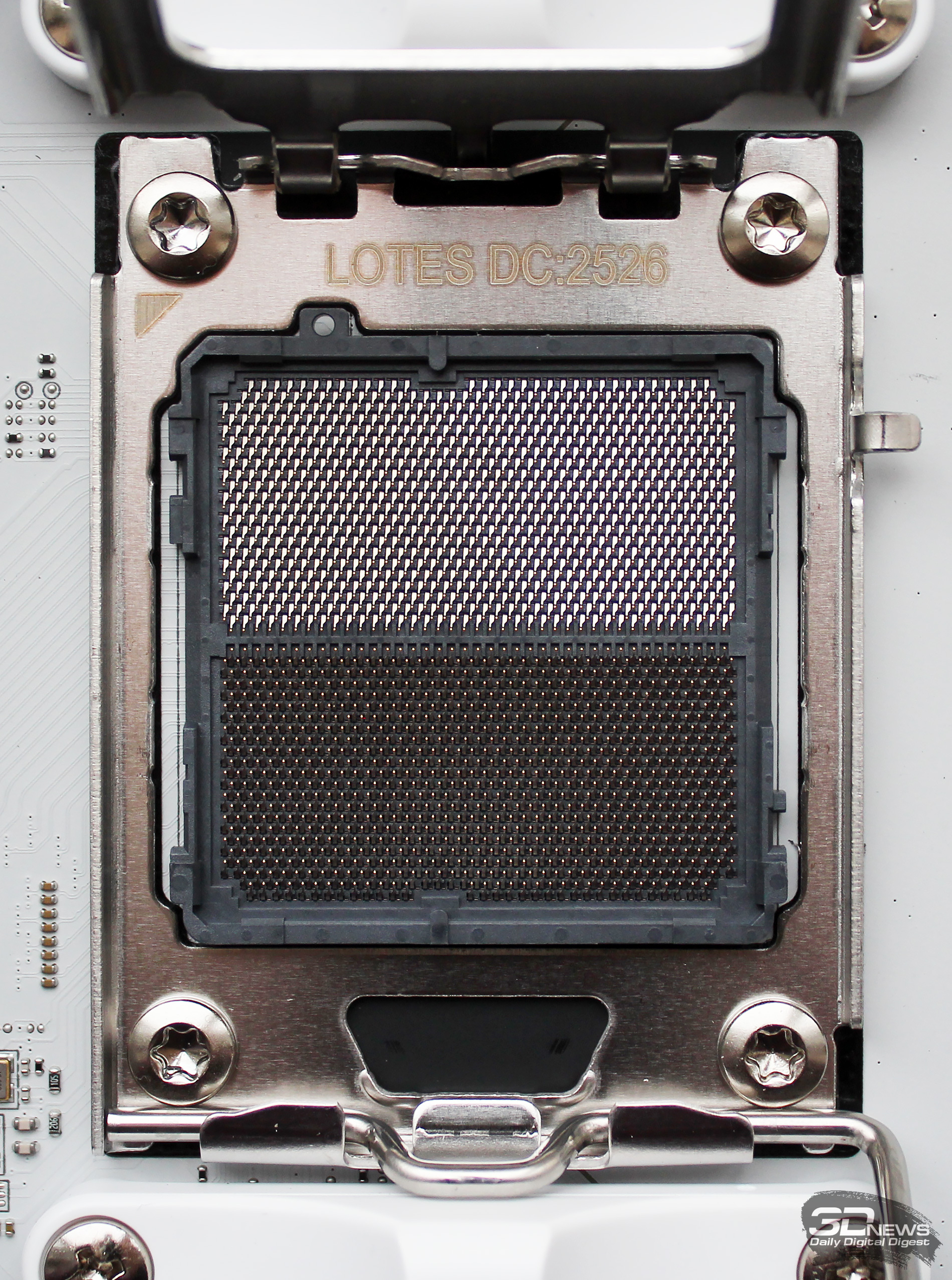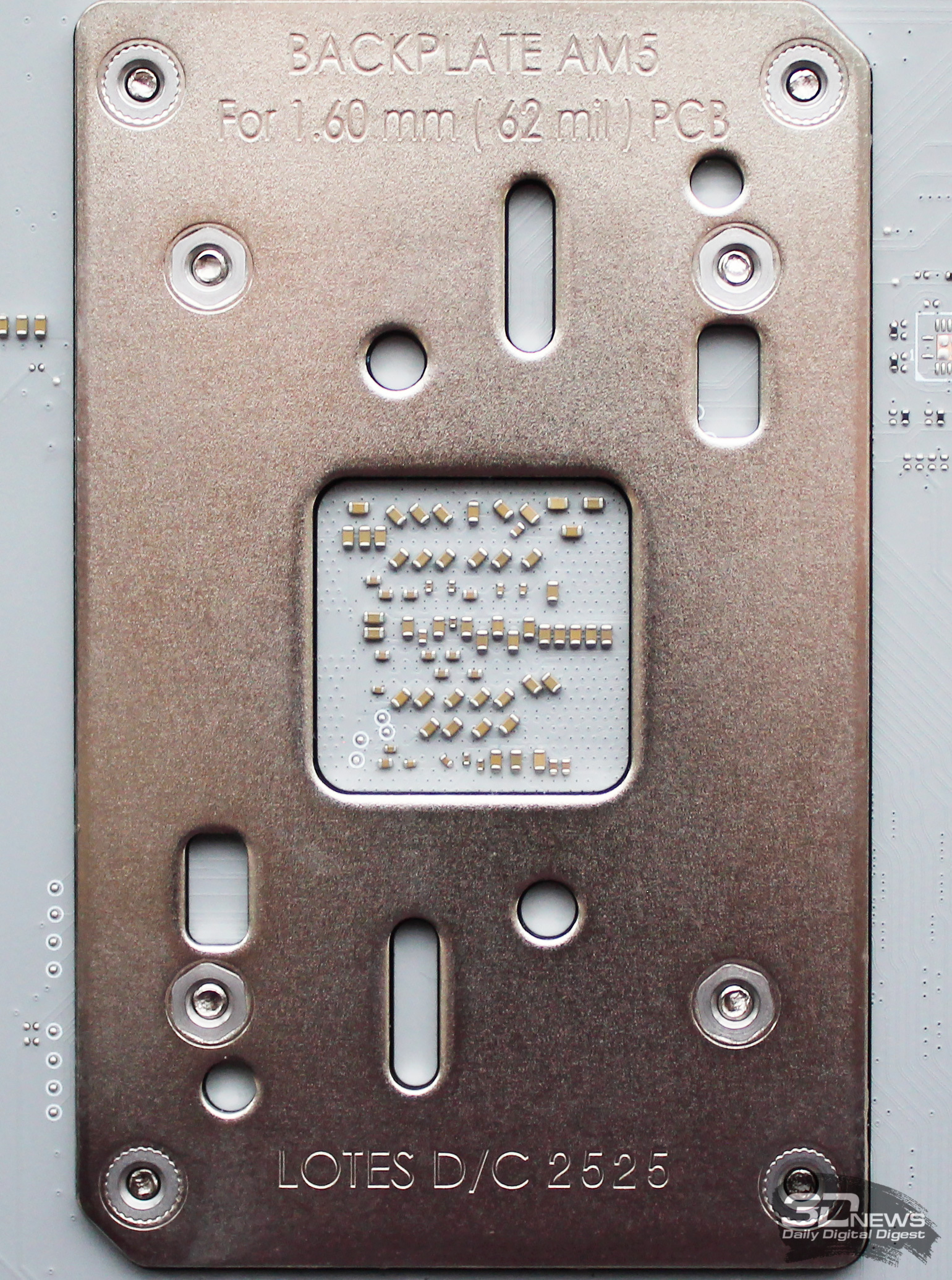 ⇡#Упаковка и комплектацияПлата MSI MAG X870E Tomahawk WIFI PZ входит в серию MSI Arsenal Gaming, поэтому её коробка оформлена в соответствующем стиле с нотками милитари. На её лицевой стороне указано название модели и серии платы, поддерживаемые процессоры и технологии, а на обратной приведено фото устройства, перечень ключевых особенностей и краткие характеристики с портами ввода-вывода. На торце коробки приклеен стикер с серийным номером платы, штрихкодами и страной производства (Китай). Внутри цветной оболочки плата защищена коробкой из плотного картона, где лежит в антистатическом пакете на специальном поддоне, исключающем вероятность повреждения коннекторов с обратной стороны печатной платы. Под крышкой этого поддона находится довольно полный набор аксессуаров, в числе которых антенна беспроводного модуля связи, два кабеля SATA, кабель передней панели корпуса EZ, кабель EZ Conn, кабель подсветки ARGB, винты для накопителей в портах M.2 и ключик, краткая инструкция и гарантия, купон MSI Shout Out и комплект наклеек. Также в комплект входит маленький флеш-накопитель объёмом 32 Гбайт, где записаны утилиты и драйверы. Никакой защиты в нём нет, поэтому после установки всего программного обеспечения флешку можно использовать для собственных нужд. Стоимость MSI MAG X870E Tomahawk WIFI PZ составляет 31 999 рублей, что для плат на наборе системной логики AMD X870E является средним уровнем (даже чуть ниже среднего). Также отметим, что в России на данный продукт предоставляется трёхлетняя гарантия. ⇡#Дизайн и особенностиMSI MAG X870E Tomahawk WIFI PZ выполнена в форм-факторе ATX (244 × 305 мм) на светло-сером текстолите, а все радиаторы на ней серебристого цвета, что делает эту модель визуально лёгкой и сияющей под любым освещением. Дизайн радиаторов платы лаконичный, но не строгий, как в более привычных чёрных версиях. Здесь чувствуются какие-то зимние нотки: холод, коньки и лёд… При этом все грани радиаторов, которых здесь более чем в достатке, аккуратно обработаны, пораниться о них невозможно. Панель портов ввода-вывода интегрирована в плату и выкрашена в белый цвет, что соответствует общей стилистике продукта. Набор интерфейсов можно назвать исчерпывающим. Здесь сразу двенадцать портов USB, включая три Type-C с пропускной способностью 40 и 10 Гбит/с, видеовыход HDMI версии 2.1, сетевой порт 5G и два коннектора SMA для антенн беспроводного модуля связи (2T2R), два 3,5-мм аудиоразъёма и оптический выход, а также две утопленные в поверхность кнопки – Flash BIOS и Clear CMOS. Схемы расположения всех элементов и портов на MSI MAG X870E Tomahawk WIFI PZ приводим ниже, где хорошо видно, что все коннекторы вынесены на обратную сторону печатной платы. Крепления всех элементов на плате винтовые, поэтому с их снятием проблем не возникло. Вот как выглядит MSI MAG X870E Tomahawk WIFI PZ без навесных элементов. В её основе лежит восьмислойная печатная плата, произведённая по фирменной технологии «PCB Fabric», благодаря которой, по информации MSI, обеспечена повышенная пропускная способность, снижены потери сигнала, достигнут более точный контроль сопротивления и повышенная термостабильность в условиях предельных нагрузок. Процессорный сокет конструктивного исполнения AM5 выпущен компанией Lotes и поддерживает установку любых вышедших к сегодняшнему дню процессоров AMD. Перечень совместимых с платой процессоров приведён на странице поддержки. В него входят все выпущен