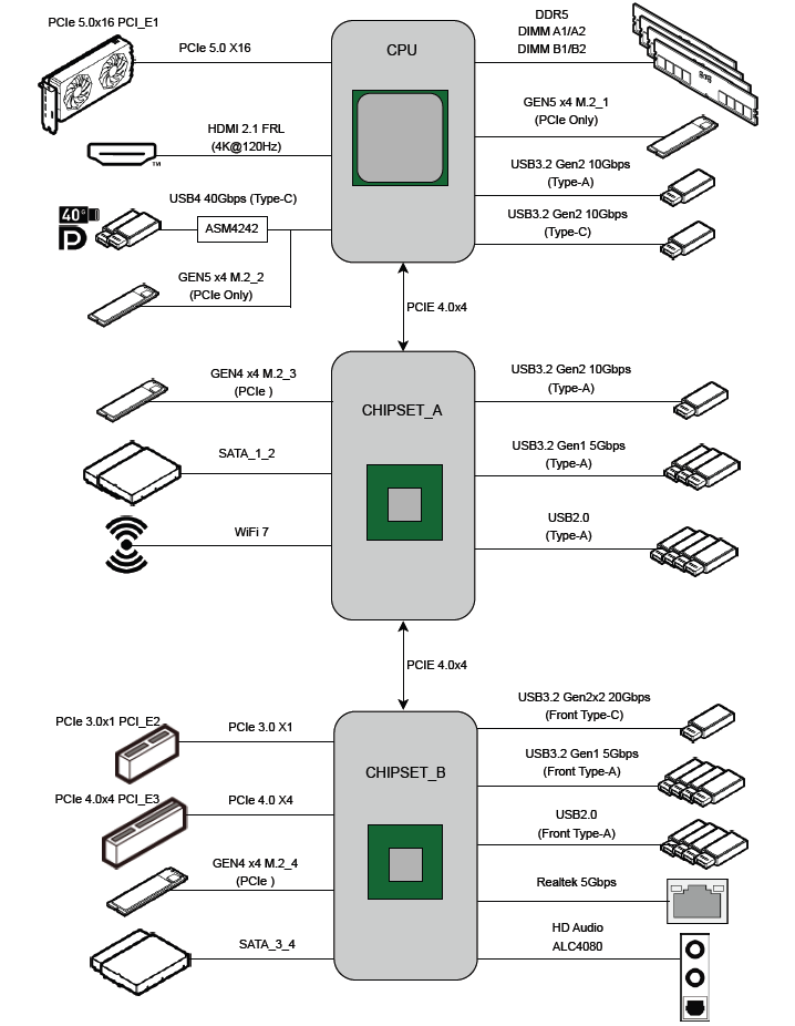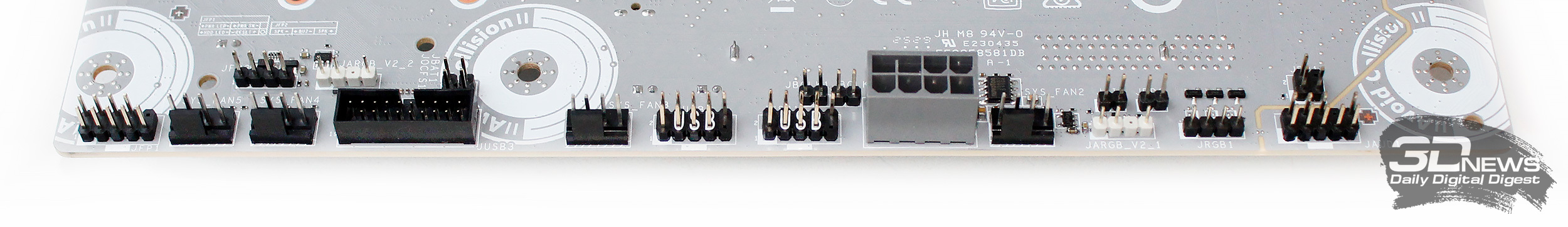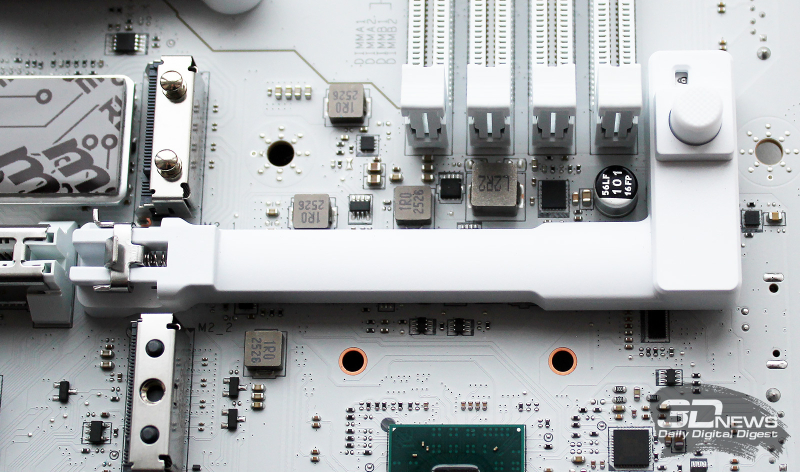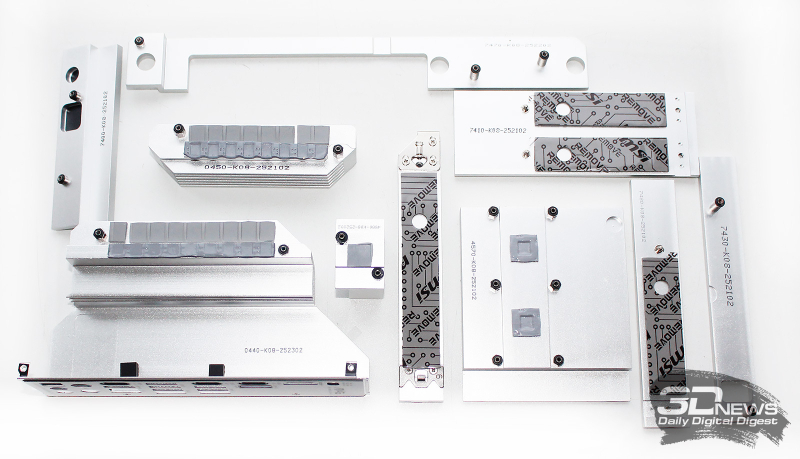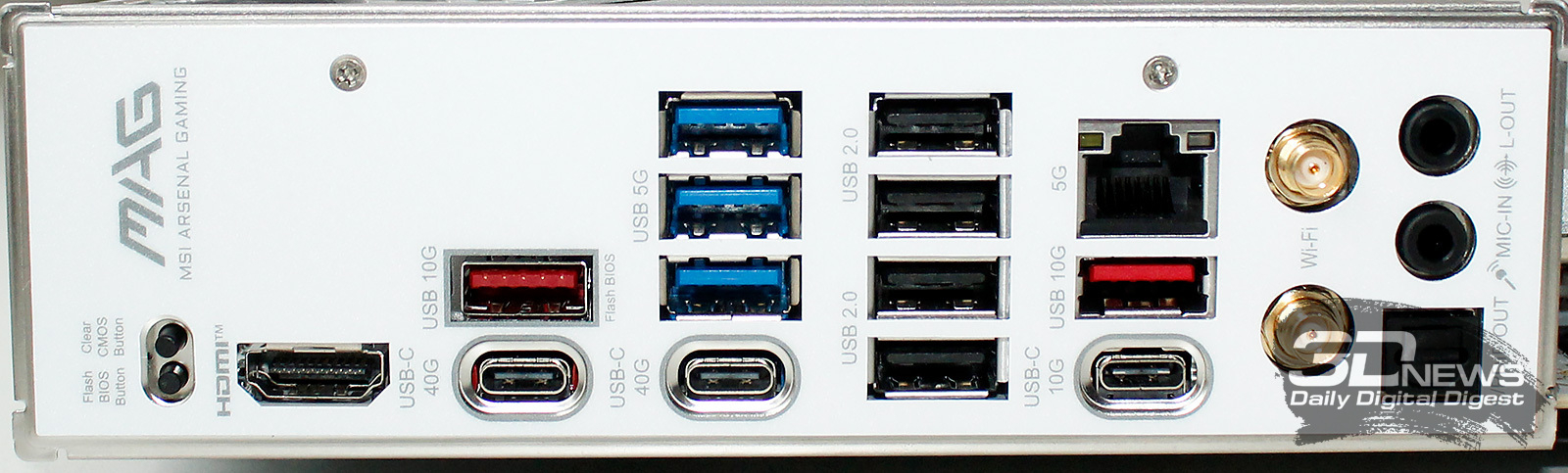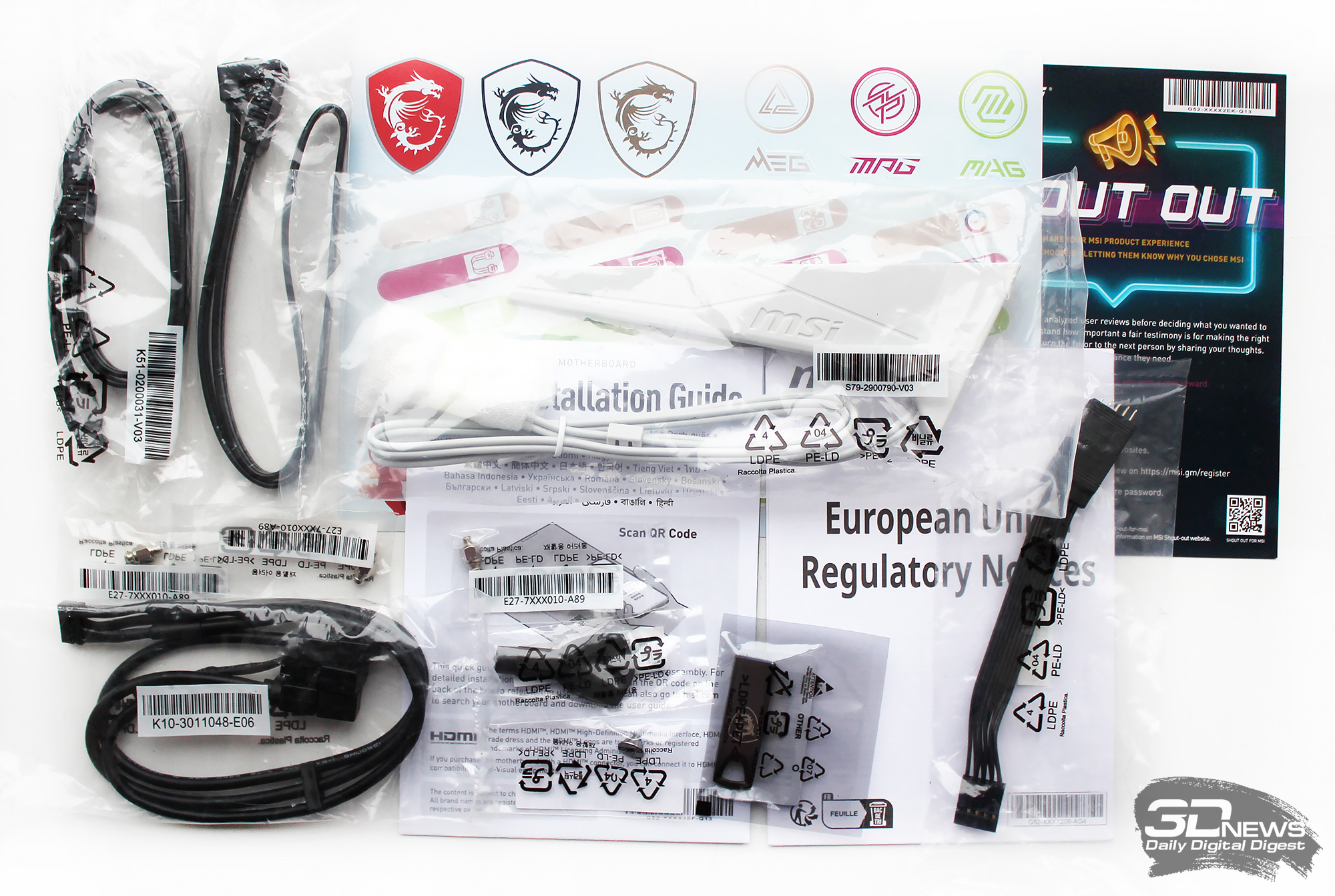 ⇡#Упаковка и комплектацияПлата MSI MAG X870E Tomahawk WIFI PZ входит в серию MSI Arsenal Gaming, поэтому её коробка оформлена в соответствующем стиле с нотками милитари. На её лицевой стороне указано название модели и серии платы, поддерживаемые процессоры и технологии, а на обратной приведено фото устройства, перечень ключевых особенностей и краткие характеристики с портами ввода-вывода. На торце коробки приклеен стикер с серийным номером платы, штрихкодами и страной производства (Китай). Внутри цветной оболочки плата защищена коробкой из плотного картона, где лежит в антистатическом пакете на специальном поддоне, исключающем вероятность повреждения коннекторов с обратной стороны печатной платы. Под крышкой этого поддона находится довольно полный набор аксессуаров, в числе которых антенна беспроводного модуля связи, два кабеля SATA, кабель передней панели корпуса EZ, кабель EZ Conn, кабель подсветки ARGB, винты для накопителей в портах M.2 и ключик, краткая инструкция и гарантия, купон MSI Shout Out и комплект наклеек. Также в комплект входит маленький флеш-накопитель объёмом 32 Гбайт, где записаны утилиты и драйверы. Никакой защиты в нём нет, поэтому после установки всего программного обеспечения флешку можно использовать для собственных нужд. Стоимость MSI MAG X870E Tomahawk WIFI PZ составляет 31 999 рублей, что для плат на наборе системной логики AMD X870E является средним уровнем (даже чуть ниже среднего). Также отметим, что в России на данный продукт предоставляется трёхлетняя гарантия. ⇡#Дизайн и особенностиMSI MAG X870E Tomahawk WIFI PZ выполнена в форм-факторе ATX (244 × 305 мм) на светло-сером текстолите, а все радиаторы на ней серебристого цвета, что делает эту модель визуально лёгкой и сияющей под любым освещением. Дизайн радиаторов платы лаконичный, но не строгий, как в более привычных чёрных версиях. Здесь чувствуются какие-то зимние нотки: холод, коньки и лёд… При этом все грани радиаторов, которых здесь более чем в достатке, аккуратно обработаны, пораниться о них невозможно. Панель портов ввода-вывода интегрирована в плату и выкрашена в белый цвет, что соответствует общей стилистике продукта. Набор интерфейсов можно назвать исчерпывающим. Здесь сразу двенадцать портов USB, включая три Type-C с пропускной способностью 40 и 10 Гбит/с, видеовыход HDMI версии 2.1, сетевой порт 5G и два коннектора SMA для антенн беспроводного модуля связи (2T2R), два 3,5-мм аудиоразъёма и оптический выход, а также две утопленные в поверхность кнопки – Flash BIOS и Clear CMOS. Схемы расположения всех элементов и портов на MSI MAG X870E Tomahawk WIFI PZ приводим ниже, где хорошо видно, что все коннекторы вынесены на обратную сторону печатной платы. Крепления всех элементов на плате винтовые, поэтому с их снятием проблем не возникло. Вот как выглядит MSI MAG X870E Tomahawk WIFI PZ без навесных элементов. В её основе лежит восьмислойная печатная плата, произведённая по фирменной технологии «PCB Fabric», благодаря которой, по информации MSI, обеспечена повышенная пропускная способность, снижены потери сигнала, достигнут более точный контроль сопротивления и повышенная термостабильность в условиях предельных нагрузок. Процессорный сокет конструктивного исполнения AM5 выпущен компанией Lotes и поддерживает установку любых вышедших к сегодняшнему дню процессоров AMD. Перечень совместимых с платой процессоров приведён на странице поддержки. В него входят все выпущен