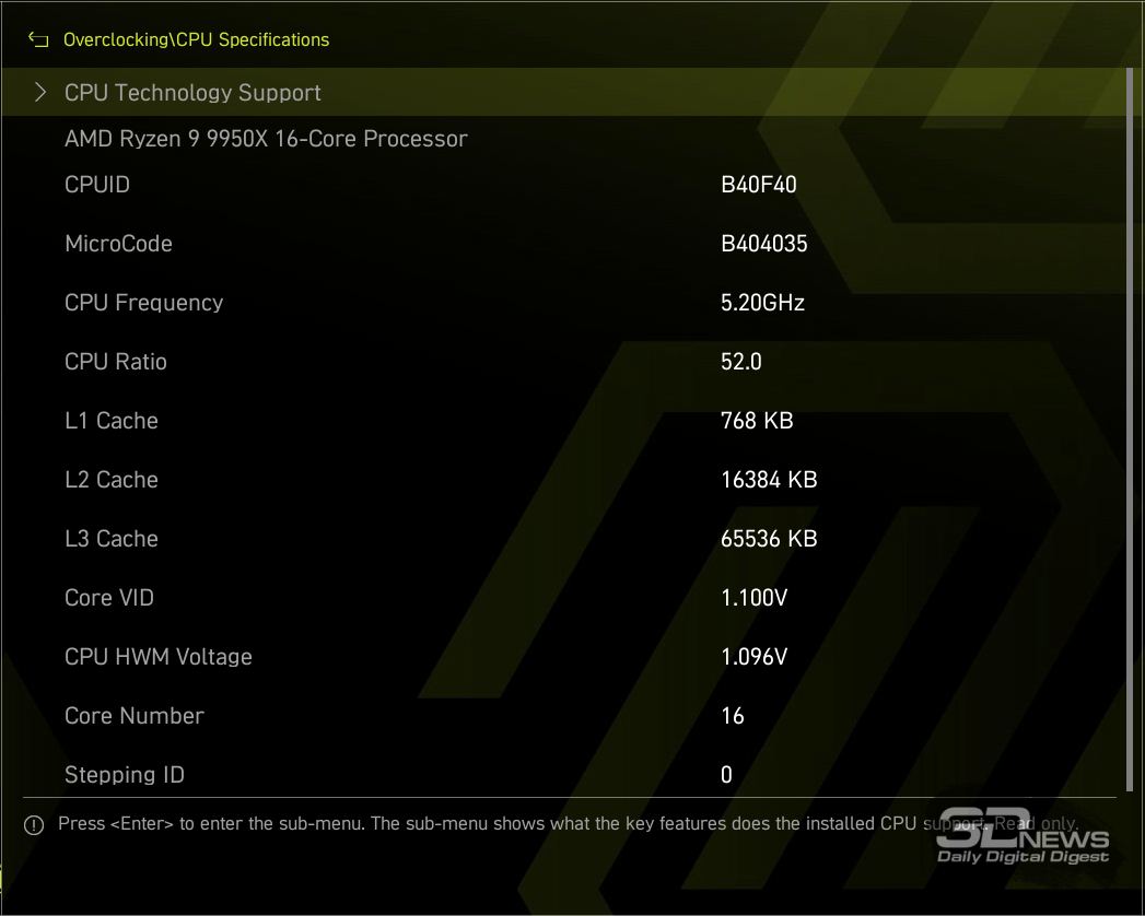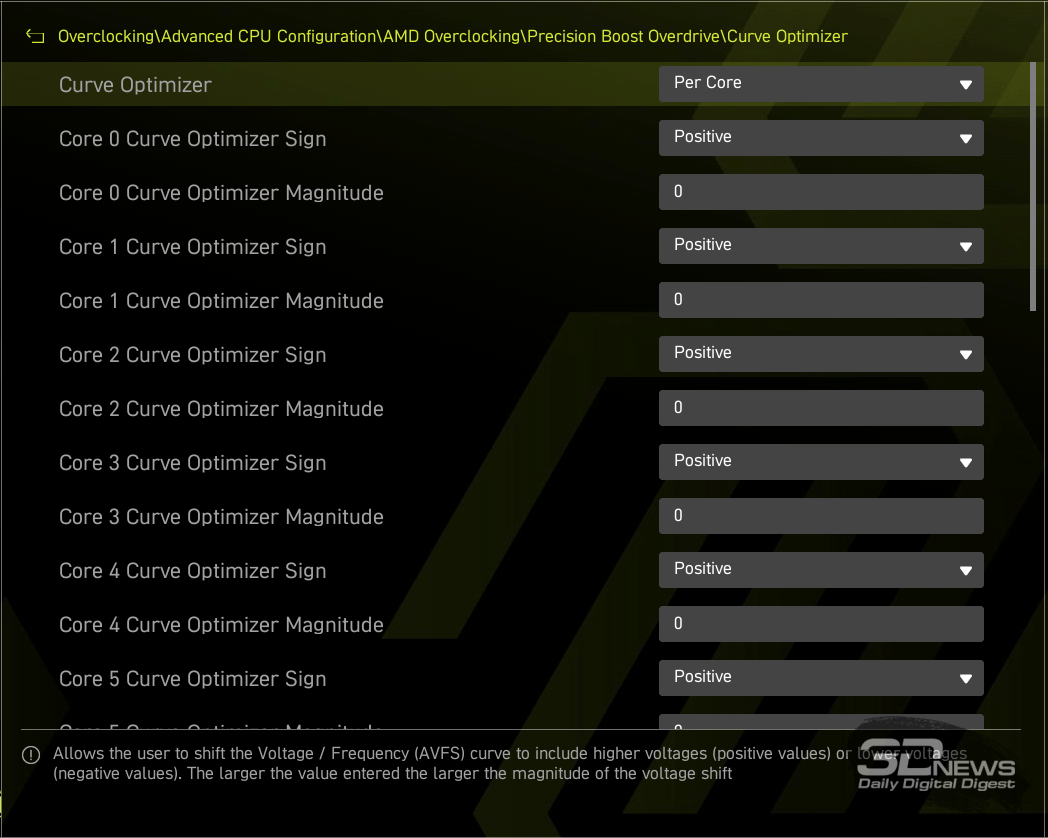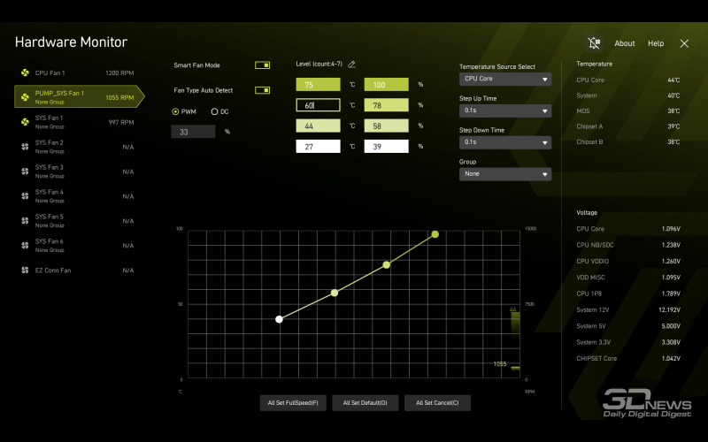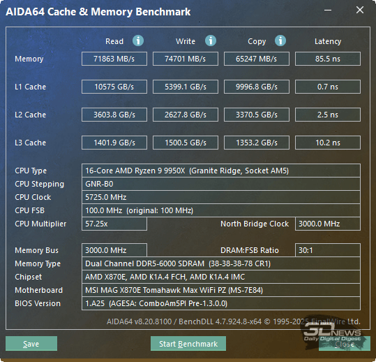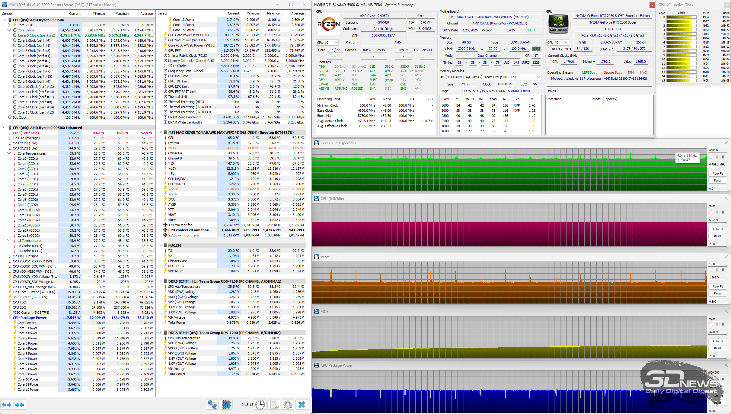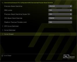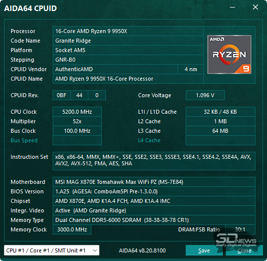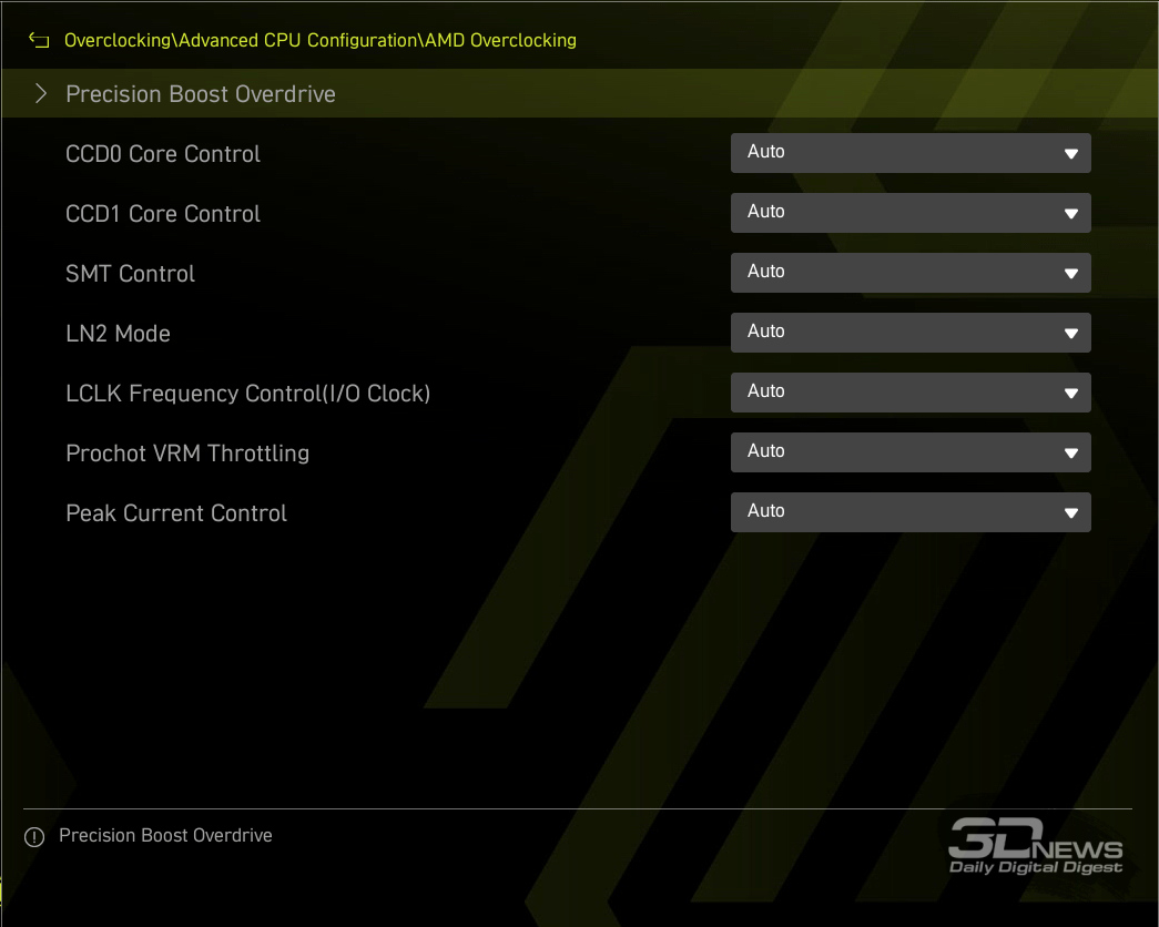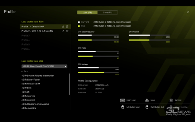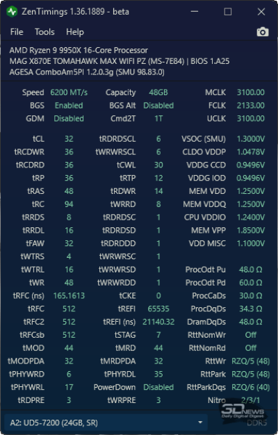 Стабильность системы мы проверяли стресс-тестом из бенчмарка рендеринга Cinebench R23 и другими утилитами, а мониторинг проводился с помощью HWiNFO64 версии 8.40-5900. Основные характеристики MSI MAG X870E Tomahawk WIFI PZ приведены из утилиты HWiNFO64. Первый запуск и тест материнской платы MSI MAG X870E Tomahawk WIFI PZ был проведён при автоматических настройках BIOS, не считая активации профиля настроек оперативной памяти, отключения ненужных контроллеров и настройки кривых скорости вентиляторов. Все параметры процессора были установлены платой самостоятельно, без вмешательства пользователя. Память стартовала на штатных для XMP1 6000 МГц с таймингами, прописанными в её профиле (конечно же, далеко не оптимальными). С такими настройками стресс-тест 16-ядерного AMD Ryzen 9 9950X на MSI MAG X870E Tomahawk WIFI PZ был пройден при следующих данных мониторинга. ⇡#Настройки BIOS по умолчаниюСразу отметим, что при автоматических настройках BIOS процессор не перегревается, что встречается не так уж и часто в материнских платах. То есть сразу плюсик в копилку MSI MAG X870E Tomahawk WIFI PZ. Далее отметим, что частота процессора под нагрузкой стабилизировалась на 4,82 ГГц при напряжении 1,1 В и максимальной температуре 75,4 градуса Цельсия. Потребление процессора в пике нагрузки достигало 200,3 ватта. Не завышены и другие напряжения процессора и оперативной памяти, поэтому можно сказать, что обязательной настройки BIOS на этой плате пользователю не требуется. В следующем цикле тестов мы решили попробовать предустановленные в BIOS профили PBO, начав с самого простого, Thermal Point 65 (снятие всех ограничений за исключением предельной температуры 65 градусов Цельсия). При этом мы получили следующие показатели мониторинга во время стресс-теста. ⇡#Профиль настроек PBO Thermal Point 65Поскольку теперь всем заправляет предельная температура 65 градусов Цельсия, то частота процессора в нагрузке снизилась до 4,56 ГГц при 183,5 ваттах и напряжении 0,97 В. Процессорный кулер, судя по его вентиляторам, совершенно не напрягался, поэтому такой вариант может подойти тем, кто хочет добиться от системы минимального уровня шума при незначительном снижении производительности. Работает, фиксируем. А вот дальше с профилями PBO не задалось. Активация любого другого из них приводила либо к перманентному зависанию, либо к мгновенной перезагрузке, что, кстати, не обязательно является виной платы, а скорее особенностью сочетания процессора, оперативной памяти и только потом платы. Ну что же, тогда пробуем настроить вручную, благо у MSI MAG X870E Tomahawk WIFI PZ для этого арсенал инструментов более чем исчерпывающий. На этот раз с PBO Limits, Curve Optimizer и Curve Shaper мы играть не стали (затратно по времени и не гарантирует результат), а, зная пределы тестового процессора, использовали фиксированные установки частот, напряжений и LLC. Первым шагом стала установка частоты 5,1 ГГц при LLC 3 с дальнейшим подбором минимально возможного напряжения, при котором сохранялась стабильность и не снижались результаты тестов в бенчмарках (да-да, и такое бывает). Оказалось, что для этого на MSI MAG X870E Tomahawk WIFI PZ нашему процессору AMD Ryzen 9 9950X потребовалось всего 1,055 В, тогда как на моей родной Asus ROG Strix X870E-E Gaming WiFi этот же процессор на такой же частоте требует 1,075 В. Впрочем, тут нечему удивляться, поскольку алгоритмы LLC на разных платах сравнивать нельзя (да и на MSI они, как правило, более агрессивные). Итак, посмотрим на показатели 