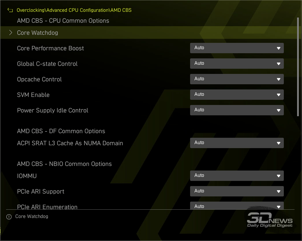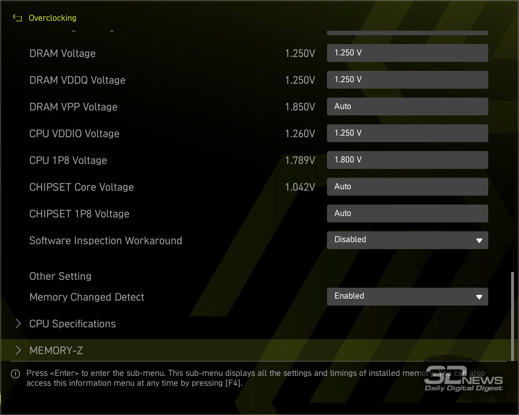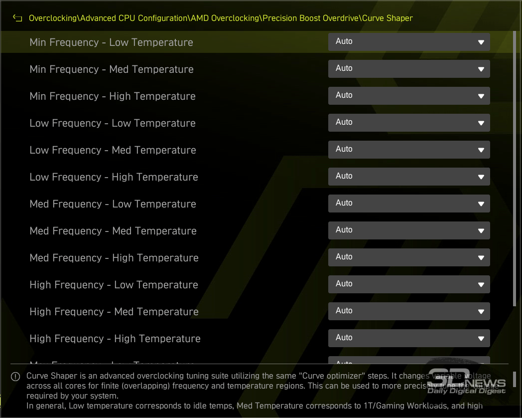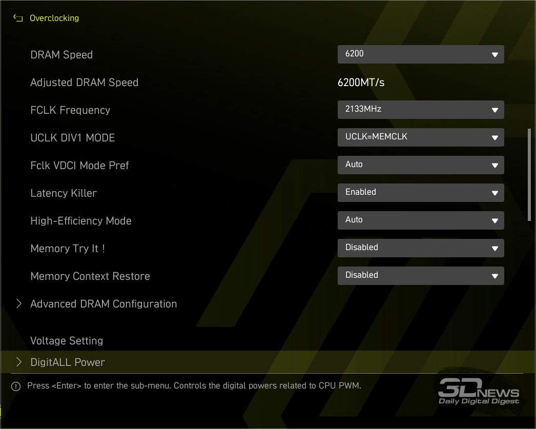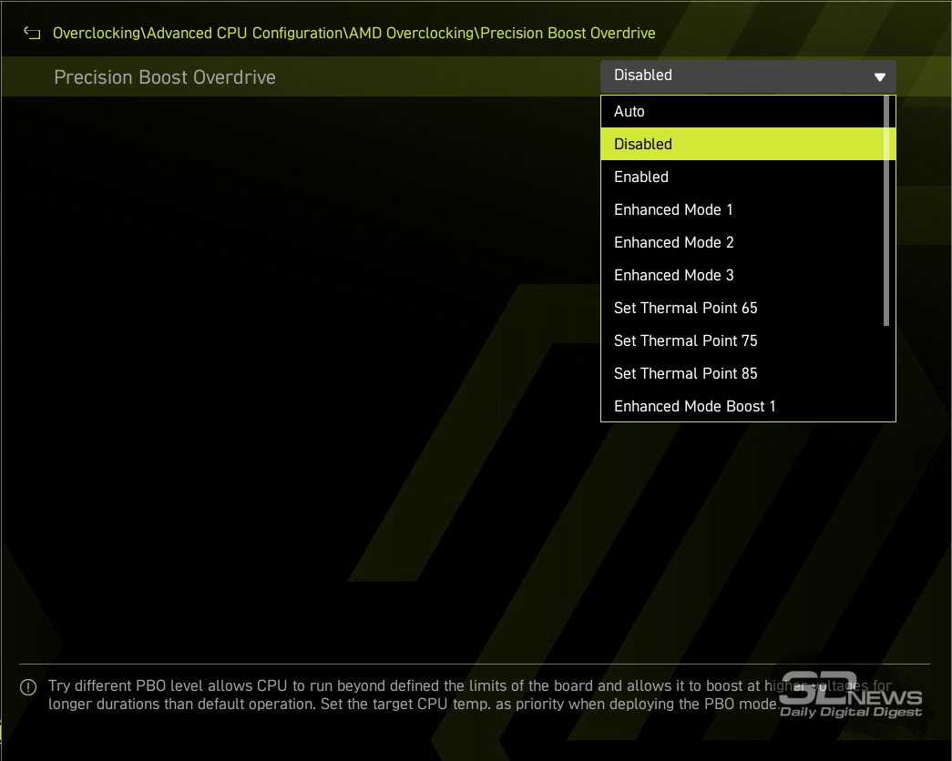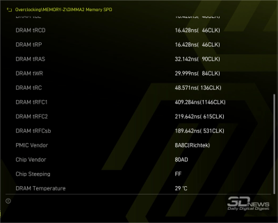 Стабильность системы мы проверяли стресс-тестом из бенчмарка рендеринга Cinebench R23 и другими утилитами, а мониторинг проводился с помощью HWiNFO64 версии 8.40-5900. Основные характеристики MSI MAG X870E Tomahawk WIFI PZ приведены из утилиты HWiNFO64. Первый запуск и тест материнской платы MSI MAG X870E Tomahawk WIFI PZ был проведён при автоматических настройках BIOS, не считая активации профиля настроек оперативной памяти, отключения ненужных контроллеров и настройки кривых скорости вентиляторов. Все параметры процессора были установлены платой самостоятельно, без вмешательства пользователя. Память стартовала на штатных для XMP1 6000 МГц с таймингами, прописанными в её профиле (конечно же, далеко не оптимальными). С такими настройками стресс-тест 16-ядерного AMD Ryzen 9 9950X на MSI MAG X870E Tomahawk WIFI PZ был пройден при следующих данных мониторинга. ⇡#Настройки BIOS по умолчаниюСразу отметим, что при автоматических настройках BIOS процессор не перегревается, что встречается не так уж и часто в материнских платах. То есть сразу плюсик в копилку MSI MAG X870E Tomahawk WIFI PZ. Далее отметим, что частота процессора под нагрузкой стабилизировалась на 4,82 ГГц при напряжении 1,1 В и максимальной температуре 75,4 градуса Цельсия. Потребление процессора в пике нагрузки достигало 200,3 ватта. Не завышены и другие напряжения процессора и оперативной памяти, поэтому можно сказать, что обязательной настройки BIOS на этой плате пользователю не требуется. В следующем цикле тестов мы решили попробовать предустановленные в BIOS профили PBO, начав с самого простого, Thermal Point 65 (снятие всех ограничений за исключением предельной температуры 65 градусов Цельсия). При этом мы получили следующие показатели мониторинга во время стресс-теста. ⇡#Профиль настроек PBO Thermal Point 65Поскольку теперь всем заправляет предельная температура 65 градусов Цельсия, то частота процессора в нагрузке снизилась до 4,56 ГГц при 183,5 ваттах и напряжении 0,97 В. Процессорный кулер, судя по его вентиляторам, совершенно не напрягался, поэтому такой вариант может подойти тем, кто хочет добиться от системы минимального уровня шума при незначительном снижении производительности. Работает, фиксируем. А вот дальше с профилями PBO не задалось. Активация любого другого из них приводила либо к перманентному зависанию, либо к мгновенной перезагрузке, что, кстати, не обязательно является виной платы, а скорее особенностью сочетания процессора, оперативной памяти и только потом платы. Ну что же, тогда пробуем настроить вручную, благо у MSI MAG X870E Tomahawk WIFI PZ для этого арсенал инструментов более чем исчерпывающий. На этот раз с PBO Limits, Curve Optimizer и Curve Shaper мы играть не стали (затратно по времени и не гарантирует результат), а, зная пределы тестового процессора, использовали фиксированные установки частот, напряжений и LLC. Первым шагом стала установка частоты 5,1 ГГц при LLC 3 с дальнейшим подбором минимально возможного напряжения, при котором сохранялась стабильность и не снижались результаты тестов в бенчмарках (да-да, и такое бывает). Оказалось, что для этого на MSI MAG X870E Tomahawk WIFI PZ нашему процессору AMD Ryzen 9 9950X потребовалось всего 1,055 В, тогда как на моей родной Asus ROG Strix X870E-E Gaming WiFi этот же процессор на такой же частоте требует 1,075 В. Впрочем, тут нечему удивляться, поскольку алгоритмы LLC на разных платах сравнивать нельзя (да и на MSI они, как правило, более агрессивные). Итак, посмотрим на показатели 