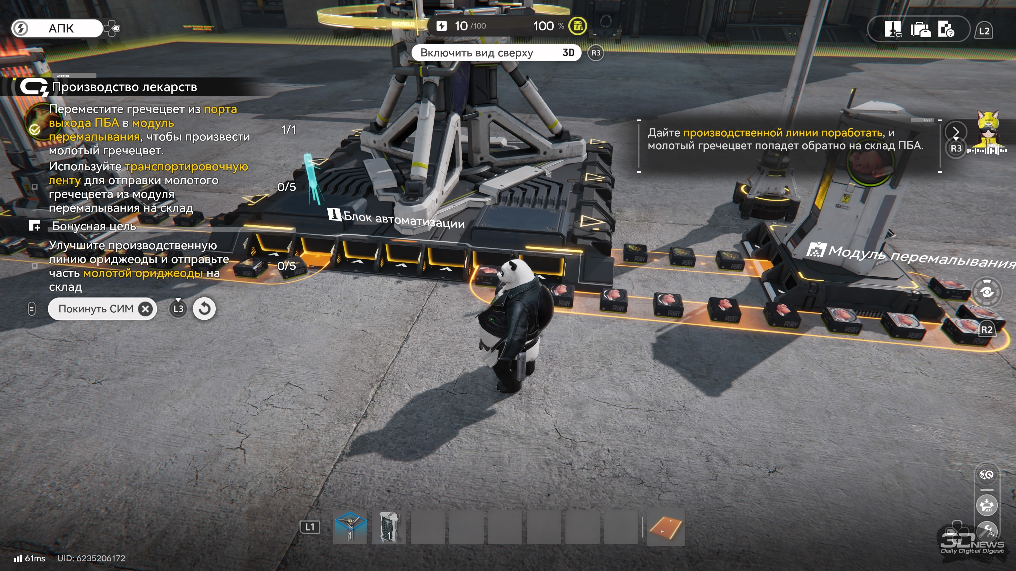 Позднее понимаешь, что разработчиков вдохновляло не только творчество Хидео Кодзимы, но и игры о строительстве фабрик вроде Satisfactory. Дело в том, что область вокруг АПК — большая площадка, которая со временем будет под завязку набита различными модулями: штамповки, упаковки, формовки, посадки, перемалывания… Ищете в мире месторождения разных материалов, размещаете там добывающие установки, оттуда всё волшебным образом доставляется на склад АПК, а потом на вашей «фабрике» из этих ресурсов выпускаются изделия вроде бутылок, деталей, капсул и так далее. Они идут как на создание экипировки, так и на продажу.