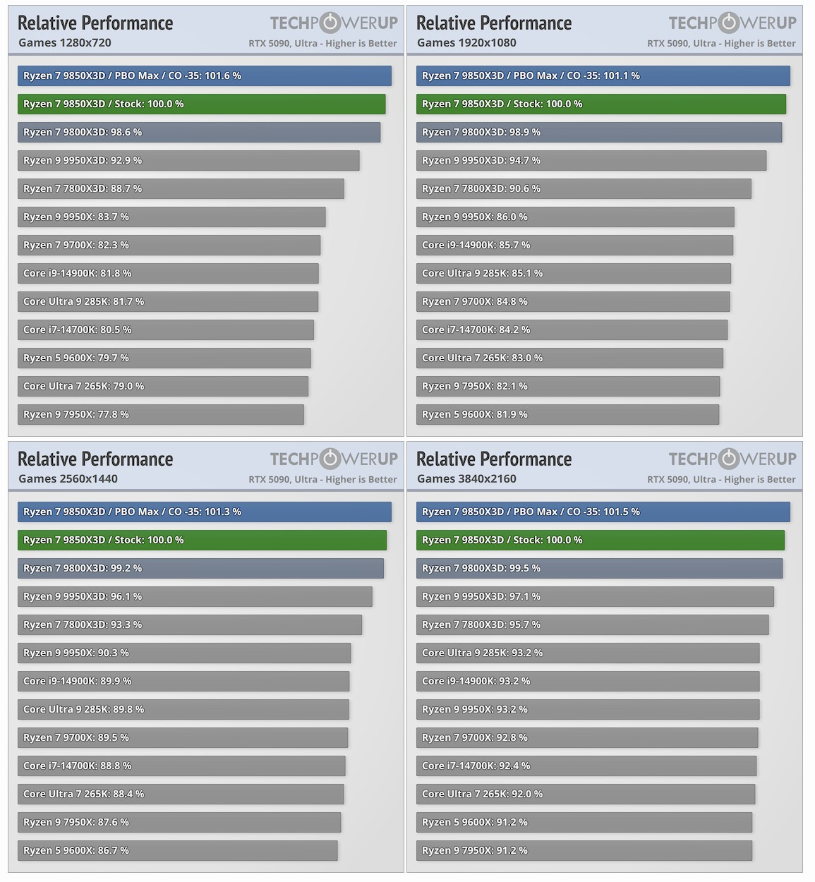 Ryzen 7 9850X3D по-прежнему предлагает восемь ядер с архитектурой Zen 5 и 16 потоков, а также 64 Мбайт дополнительного кеша 3D V-Cache, благодаря чему суммарный объём кеш-памяти третьего уровня достигает 96 Мбайт. Увеличение максимальной тактовой частоты до 5600 МГц, как показали первые независимые обзоры, не принесло никакого значительного увеличения производительности. Разница между Ryzen 7 9850X3D и Ryzen 7 9800X3D составляет порядка 3–4 % в играх. В редких случаях она увеличивается до 5–7 %.