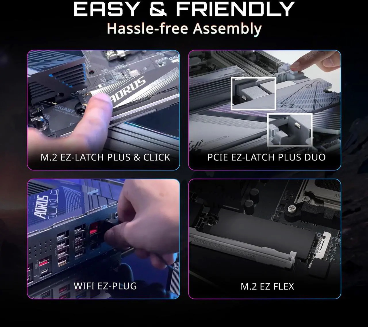 В числе особенностей, повышающих удобство использования и сборки: механизмы PCIe EZ-Latch Plus Duo для извлечения видеокарты без инструментов в двух слотах, механизмы M.2 EZ-Latch для установки SSD и радиатора без винтов, DriverBIOS для подключения Wi-Fi без ручной установки драйверов, а также комбинированный адаптер для Wi-Fi-антенны. В состав платы также входит 5-дюймовый ЖК-дисплей Edge View, отображающий различную информацию о системе и пользовательский контент.