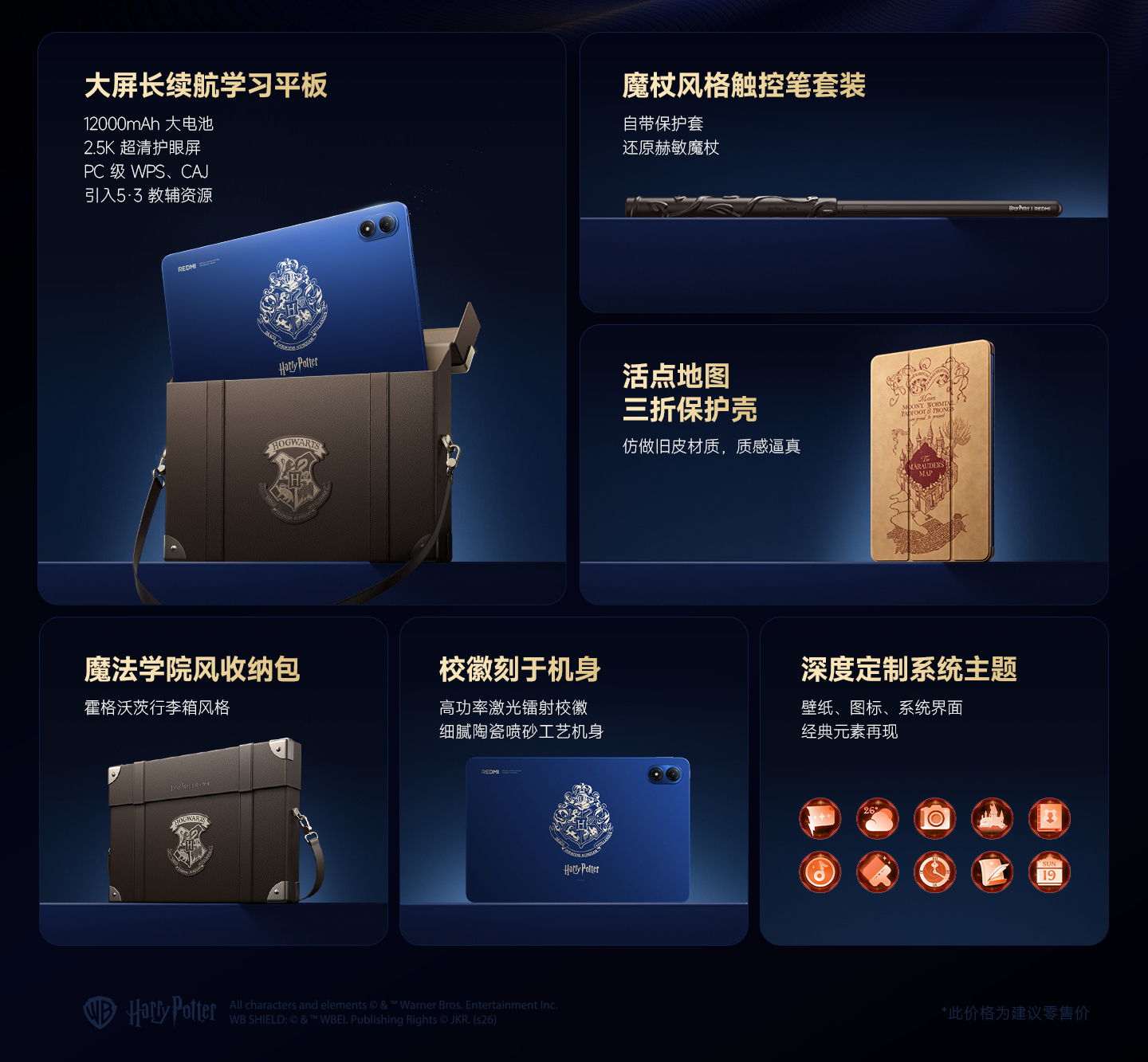 В отличие от обычных версий, Redmi Pad 2 Pro Harry Potter Edition выделяется оформлением и комплектом поставки, который включает несколько эксклюзивных аксессуаров, таких как переносной чехол, компактный чехол-обложка и стилус в виде волшебной палочки. Внешне планшет Harry Potter Edition отличается эксклюзивной синей отделкой с логотипом Хогвартса на задней панели. Также визуально изменены некоторые ярлыки пользовательского интерфейса операционной системы для соответствия магической стилистике.