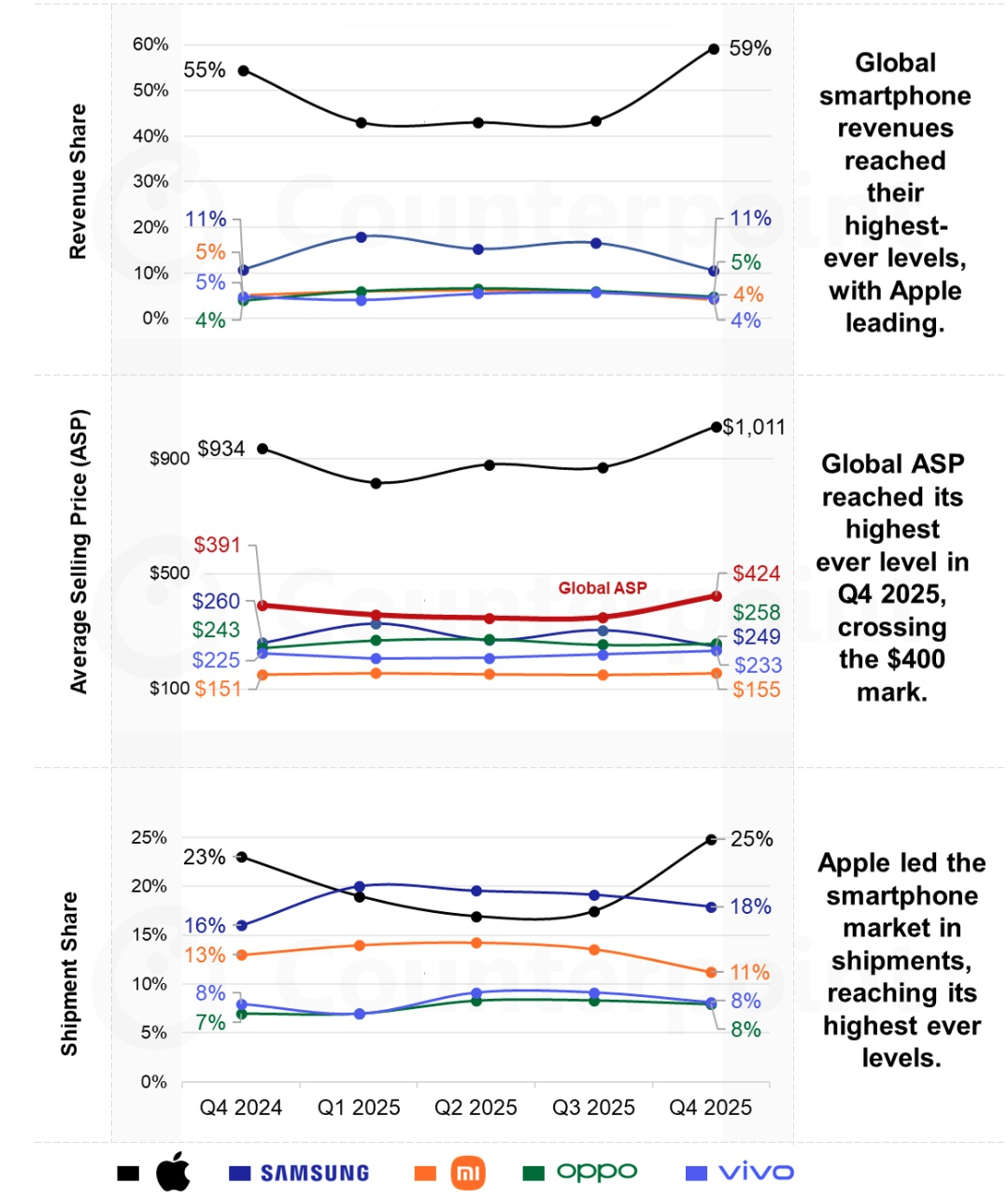 Согласно последнему отчёту глобальной исследовательской компании Counterpoint Research, в четвёртом квартале 2025 года выручка мирового рынка смартфонов выросла на 13 % в годовом исчислении, достигнув $143 млрд, что является самым высоким квартальным показателем за всю историю продаж. Средняя цена продажи смартфона (ASP) выросла на 8 % в годовом исчислении, впервые в четвёртом квартале превысив отметку в $400.