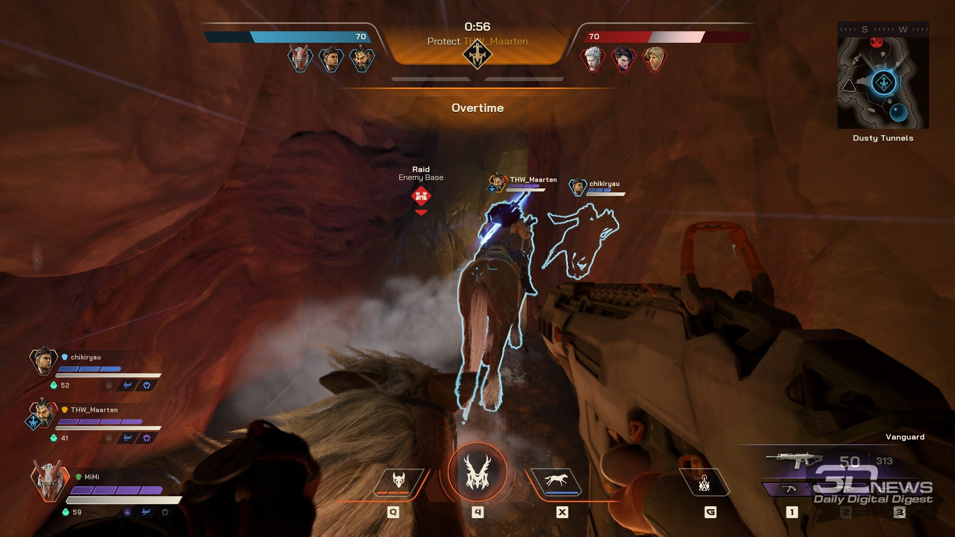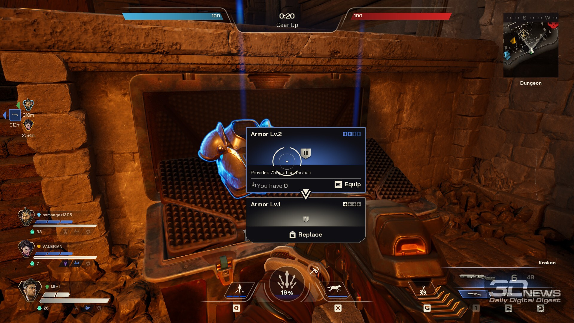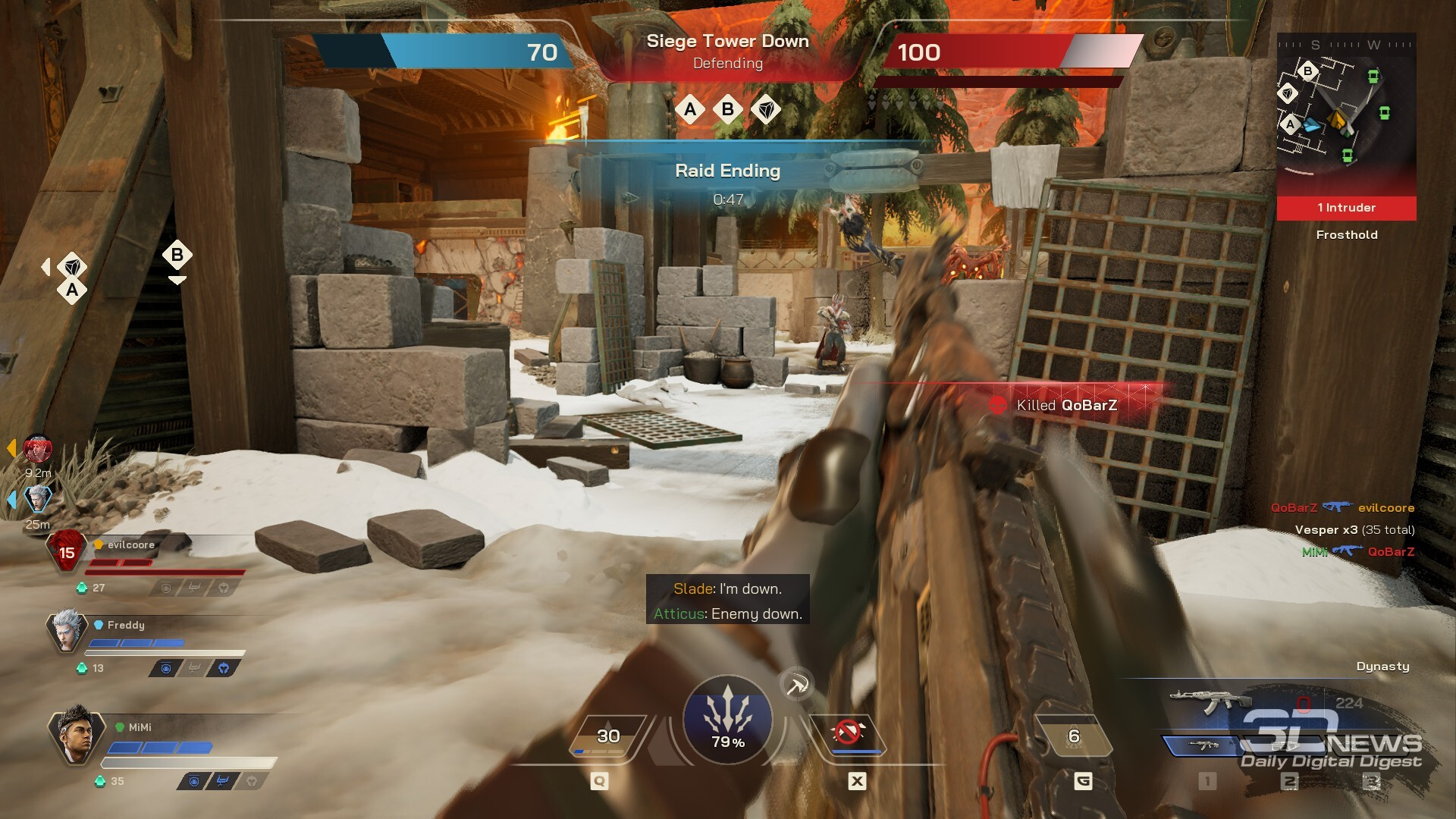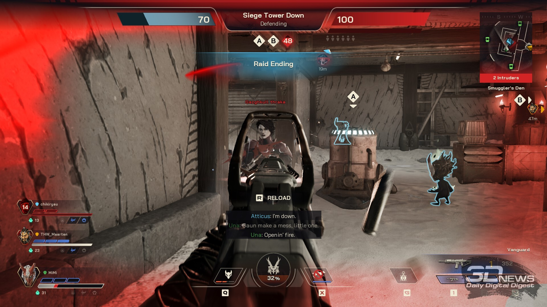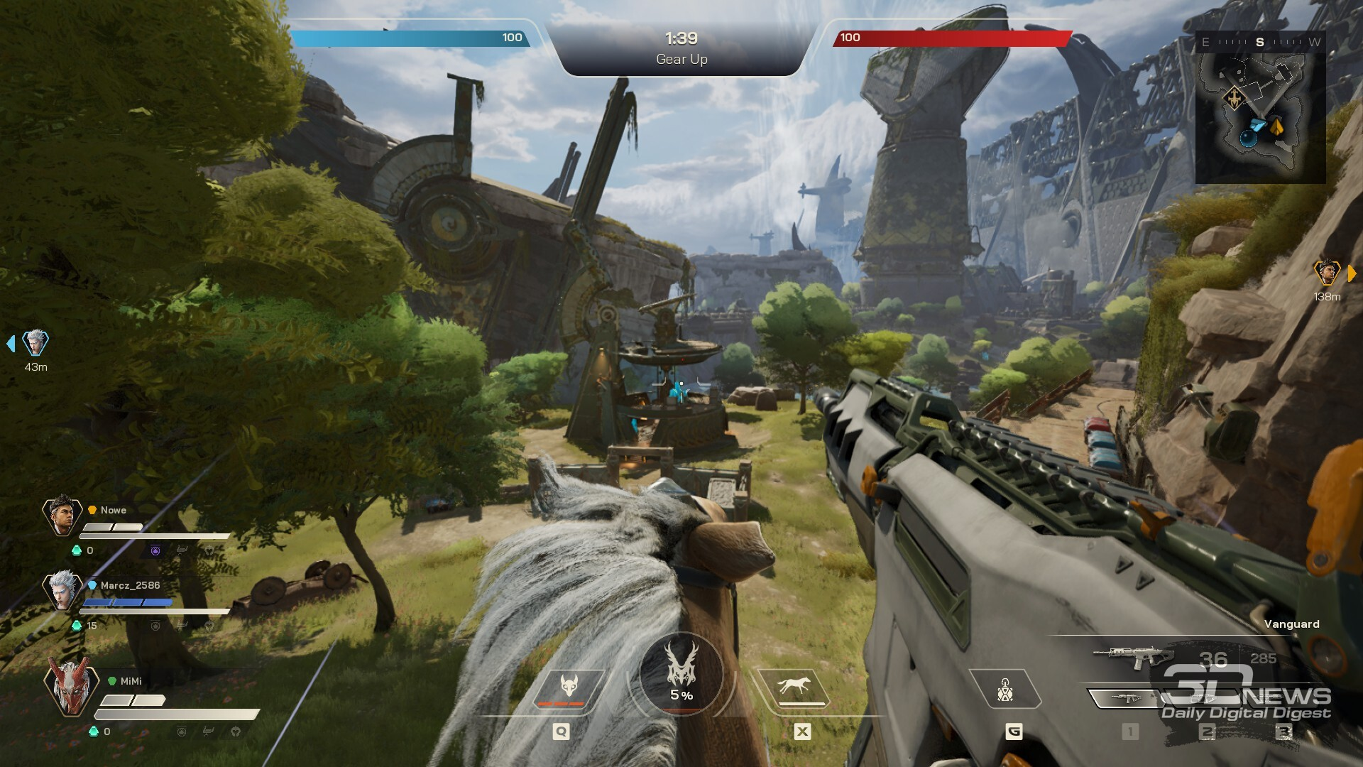 Добыча ресурса представлена небольшой мини-игрой, в которой надо вовремя нажимать кнопку. Надоедает довольно быстро И вот начинается настоящая жара, а прежде симметричный геймплей превращается в асимметричное побоище, где одна команда осаждает крепость, а другая соответственно защищает свою твердыню. Задача штурмующих — заложить взрывчатку на одной из ключевых точек и, преуспев, взорвать ещё одну, для победы этого вполне хватит. Обороняющиеся же должны предотвратить подрыв объектов, обезвреживая заряды и устраняя атакующих, чей ресурс воскрешения в ходе осады ограничен шестью слотами на всю команду. Если в ходе первого штурма Цитадель выстояла, цикл повторяется, только теперь в сундуках и магазинах будет улучшенная экипировка, а на стартовом этапе с неба будут падать контейнеры с особенно ценным снаряжением, что также может послужить хорошим поводом для стычки с противоположной командой. Кстати, арсенал в Highguard не особенно большой — всего девять пушек: штурмовые винтовки, ПП, револьверы, дробовики и снайперские винтовки. Под оружие у игроков два слота, в третий идут особые осадные приспособления вроде ракетной установки или взрывного молота, которыми сподручно громить стены и укрепления. Со стрельбой, в целом, вышло интересно: сами по себе стволы палят приятно, ощущается разница и конкретные боевые преимущества того или иного образца, чувствуется «характер». Но вот непосредственно в бою отдача и регистрация попаданий далеко не самые отзывчивые. Да ещё и процесс частенько усложняется тем, что противников непросто визуально отделить от пейзажа, особенно на расстоянии. Проблема не большая, но вкупе с прочим на удовольствие от процесса влияет не самым лучшим образом. ⇡#Стража не готоваУдивительно это говорить, но Highguard не безнадёжна, а её оригинальный игровой цикл, бодрый ритм и постоянные смены игровых задач вполне могут подарить вам пару-другую искренне весёлых вечеров. Однако спустя десяток партий (тех, что закончились не по вине вылета кого-то из сессии) вы, вполне вероятно, опробуете всё, что игра может предложить. В Highguard пока что нет рейтинговых режимов, а прокачка аккаунта приносит лишь косметические предметы. И тут, конечно, возникает вопрос — а что делать дальше. Как вариант — отточить мастерство на наиболее понравившихся вам персонажах. На старте Highguard предлагает восьмерых героев, разделённых на пять условных категорий: защитники, разведчики, поддержка, разрушители и штурмовики. К штурмовикам относятся трое из списка, к защите двое, у остальных классов, соответственно, по одному представителю. Впрочем, это деление довольно условное, а умение метко стрелять решает исход стычек куда эффективнее способностей любого из героев. Но умения персонажей всё же не бесполезные, а их своевременное применение может принести ощутимую пользу команде: скажем, ледяная стена Кая может спасти команду от гибели; Скарлет, став невидимой, проскакивает незамеченной в тыл врага; шоковое копьё Аттикуса наносит периодический урон по области, что даёт больше контроля над перемещением противника, а, скажем, Мара может выдавать коллегам дополнительные щиты. Пассивные эффекты героев также приносят некоторые преимущества, иногда боевые, вроде увеличенной скорости передвижения и перезарядки после убийства, а иногда дающие определённую 