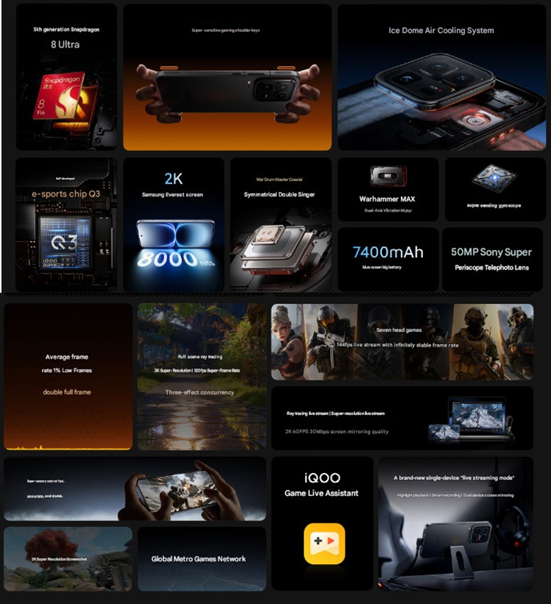 Также сообщается о коаксиальных симметричных двойных динамиках War Drum Master с поддержкой технологии Dolby Atmos, двухосевом вибромоторе Warhammer MAX и «сверхчувствительных» боковых кнопках-триггерах. Смартфон соответствует по защите от влаги и пыли стандартам IP68/IP69. Для управления устройством используется Android 16 с интерфейсом OriginOS 6.0.