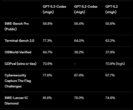 OpenAI отметила, что GPT-5.3-Codex установил новый отраслевой рекорд в бенчмарках SWE-Bench Pro и Terminal-Bench, а также показал выдающиеся результаты на OSWorld и GDPval. По сравнению с GPT-5.2-Codex новая ИИ-модель показала прирост производительности во всех основных бенчмарках: в SWE-Bench Pro 56,8 % против 56,4 % у GPT-5.2-Codex, в Terminal-Bench 77,3 % против 64 % у предыдущей версии. В дополнение к этому разработчики улучшили возможности ИИ-модели в плане веб-разработки.