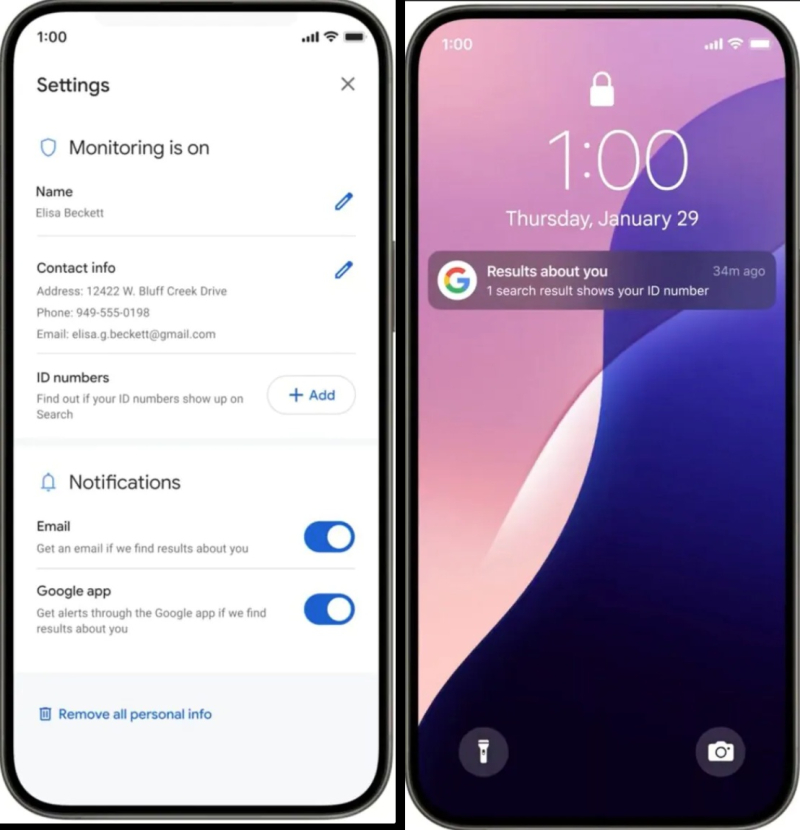 После ввода информации Google просканирует результаты поиска и уведомит по электронной почте или через приложение Google (в зависимости от настроек) о том, где можно найти эту информацию. Затем пользователь сможет удалить её непосредственно из результатов поиска.