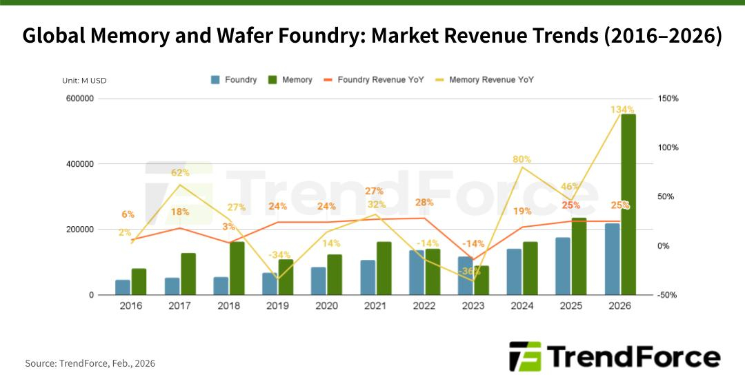 К такому выводу приходят эксперты TrendForce, оценивающие текущие тенденции в обоих сегментах рынка. По их мнению, в этом году совокупная выручка производителей памяти достигнет $551,6 млрд. Рынок услуг по контрактному производству чипов при этом останется на уровне $218,7 млрд, хотя и он достигнет исторического максимума.