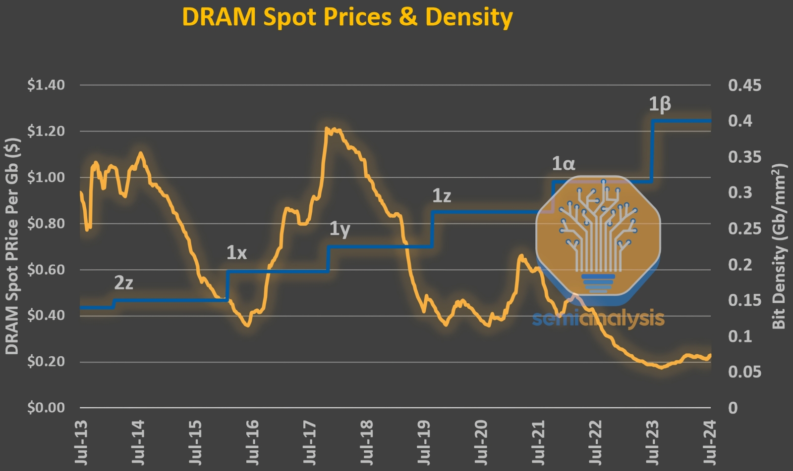 То, что представляется сейчас ненасытной жадностью изготовителей DRAM, вполне объяснимо в исторической перспективе: цена за 1 Гбайт этой памяти ощутимо, хотя и не без волатильности, снижалась с переходом на всё более тонкие производственные нормы, — а ведь капитальные затраты на разработку и внедрение соответствующих технологий лишь возрастали! Понятно, что вендоры, едва появилась такая возможность, принялись — даже не набивать карманы, изголодавшись, а, скорее, вознаграждать себя за многолетнюю работу на грани убыточности (источник: SemiAnalysis)