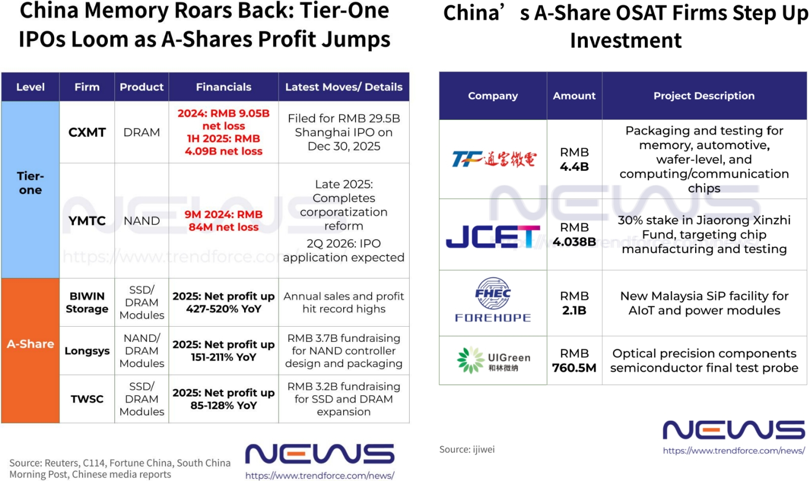 Ведущие китайские производители микроэлектроники и оборудования для её производства по состоянию на начало 2026 г. Слева — изготовители памяти: отдельно указаны пока не торгующиеся на бирже вендоры «первого уровня», отдельно — сливки страты акционерных компаний категории A. Справа: лидеры материковой OSAT-отрасли (источник: TrendForce)