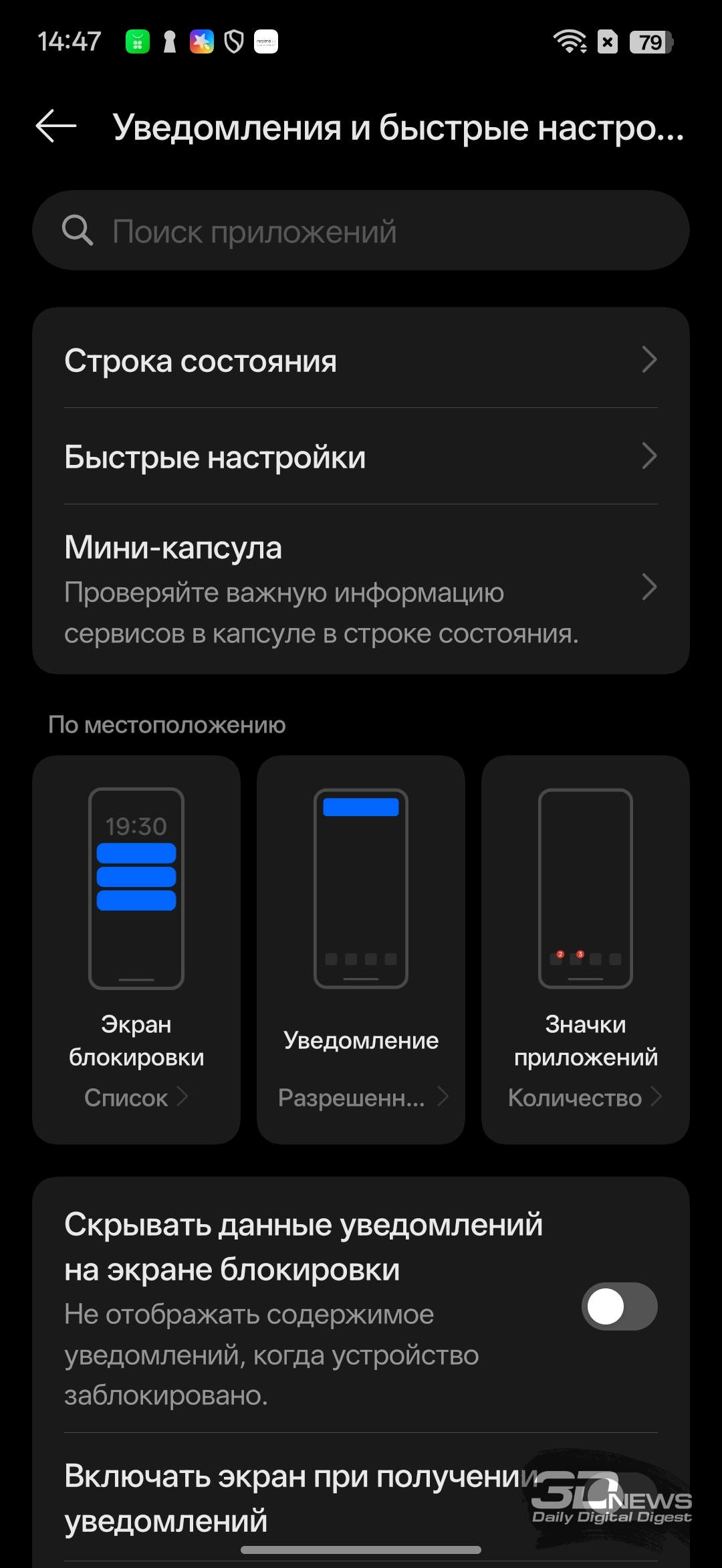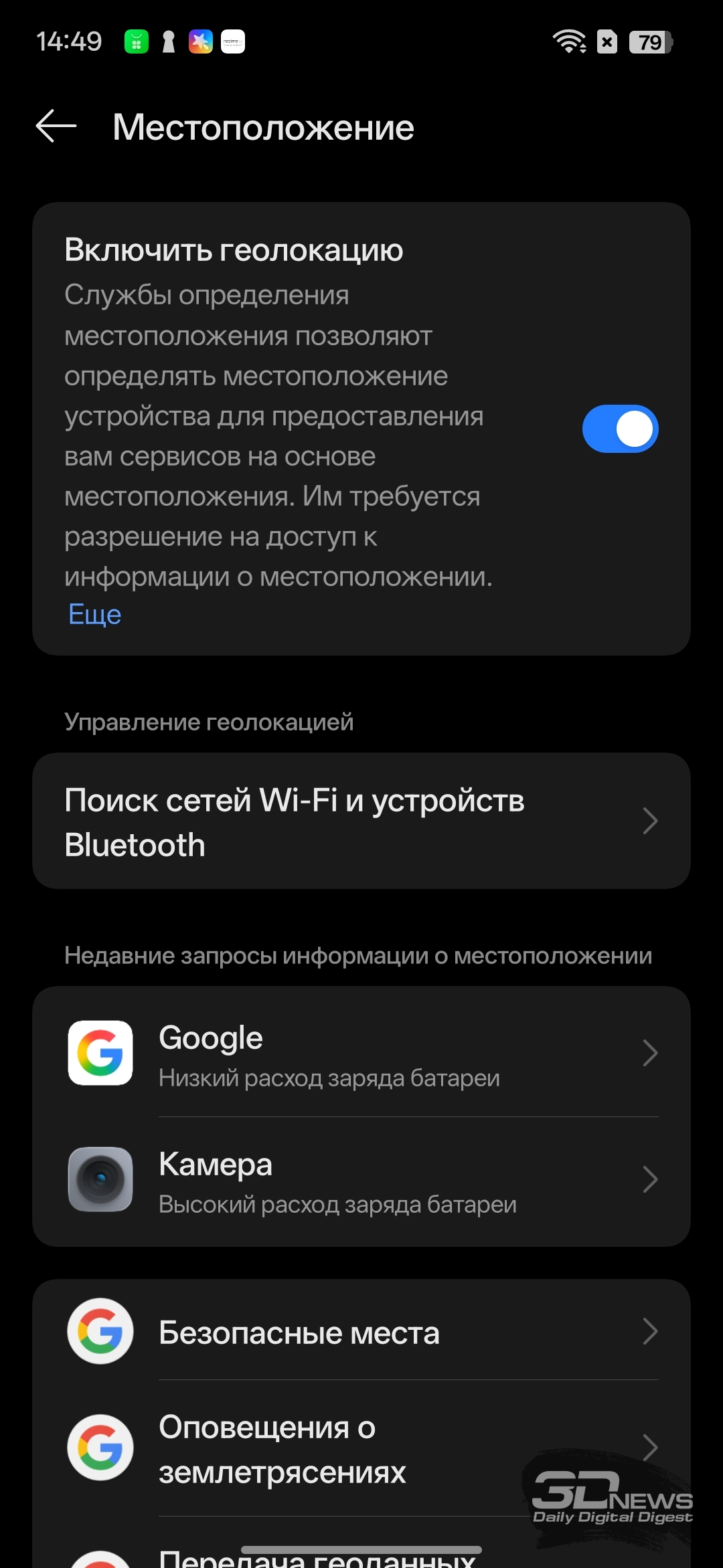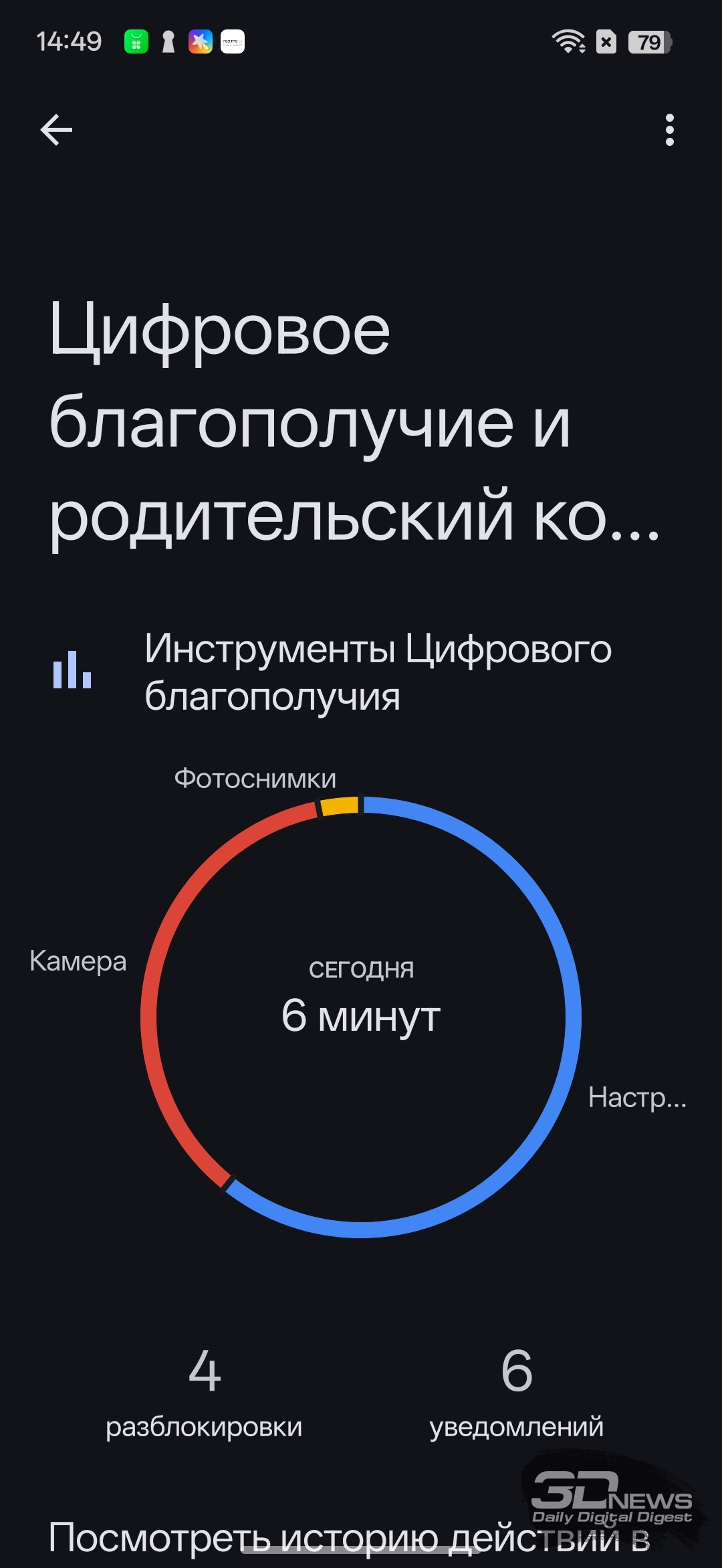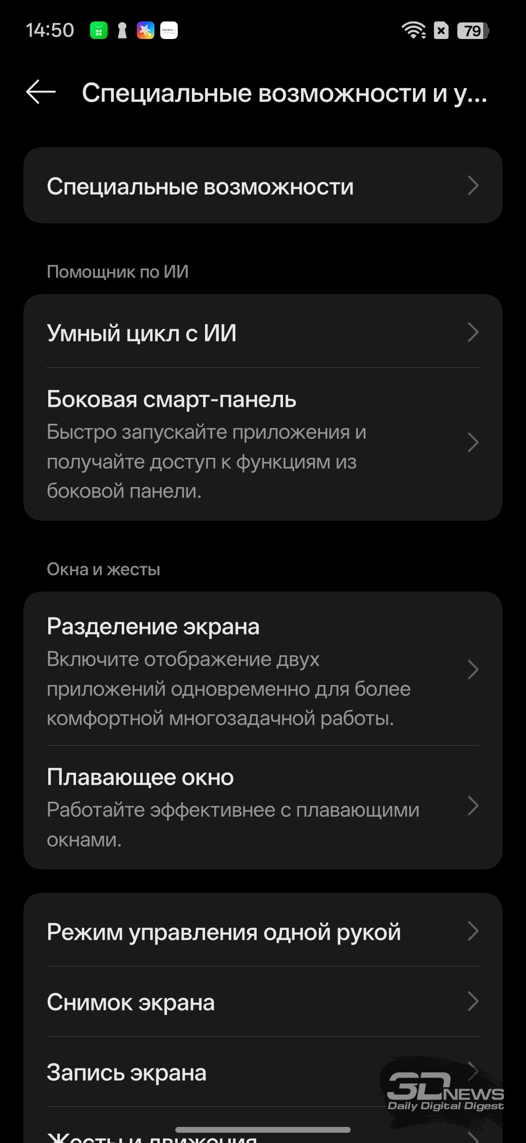 Смотреть все изображения (14) А вот в чем от realme UI 6.0, применяемой на старших смартфонах бренда, оболочка C85 Pro далека, так это в ИИ-функциональности. Весьма разнообразная и мощная там, здесь она почти отсутствует — по статусу не положено, да и аппаратная платформа с нейросетевыми вычислениями дружит слабо. Хотя что-то есть и тут: например, функция «Умный цикл с ИИ» позволяет быстро копировать какую-то информацию с картинки, из мессенджера или со страницы в интернете. Есть и набор инструментов для редактирования фото (ластик, увеличение разрешения, повышение четкости, удаление бликов при съемке через стекло и удаление бликов-засветок при обычной съемке). Тоже неплохо. Работает система недостаточно быстро и не без проблем. Приложения грузятся медленно, работают задумчиво, для взаимодействия с realme C85 Pro нужно запастись терпением. Откровенных тормозов в определенных приложениях, как у HONOR X8d, тут нет, но при этом однажды смартфон у меня самостоятельно в произвольный момент завис и ушел в перезагрузку. Каких-то долгосрочных эффектов у этого не было, но все равно неприятно. Зато занимает в памяти система лишь 8,6 Гбайт — очень достойно на фоне многих конкурентов, оболочки у которых «отъедают» десятки гигабайт и так не самого емкого накопителя. Cканер отпечатков пальцев расположен под экраном, для него используется оптический сенсор, который не реагирует на прикосновения влажного или жирного пальца, да и в целом не слишком шустрый. Вдобавок время от времени приходится повторять движения или же и вовсе вводить пароль, процент несрабатывания высокий. Продублировать дактилоскопический сенсор можно при помощи системы распознавания лица, которая работает на основе обычной фронтальной камеры. Она работает заметно быстрее, но это заведомо менее надежный метод. ⇡#Дисплей и звукВ realme С85 Pro установлен AMOLED-экран диагональю 6,8 дюйма с разрешением 2344 × 1080 точек. Плотность пикселей — 380 ppi. Мало того, что тут стоит экран на органических светодиодах с Full HD-разрешением, — в смартфоне дешевле 20 тысяч рублей уже впечатляет, — так еще и поддерживается частота обновления экрана вплоть до 144 Гц. Другое дело, что в реальности подобная частота здесь практически недостижима — в играх, например, она не поднимается выше 60 Гц. В интерфейсе — держится на уровне 90-120 Гц. Более того, даже в настройках можно выбрать вручную частоту не выше 120 Гц, заявленные 144 Гц попросту недоступны (и зафиксировать их в каком-либо приложении у меня не получилось). Измеренный предельный уровень яркости без программного повышения при автоподстройке составляет 757 кд/м2 — даже для OLED-дисплея очень высокий уровень. Более того, заявлено, что в динамике достигается уровень яркости в 1200 кд/м2, и в это вполне верится. Вдобавок на пике возможны 4000 кд/м2, но это уже строго теоретически — на практике в солнечную погоду дисплей realme C85 Pro ведет себя нормально, но не выдающимся образом, как у актуальных флагманов. В настройках дисплея можно менять размер и тип шрифтов, установить и отрегулировать темную или светлую тему интерфейса (или настроить таймер их включения), регулировать частоту обновления, как я уже писал выше, настраивать яркость (есть и режим «повышенной яркости», поднимающей статическое значение светимости органических диодов в ущерб энергопотреблению) и менять параметры защиты зрения (под э