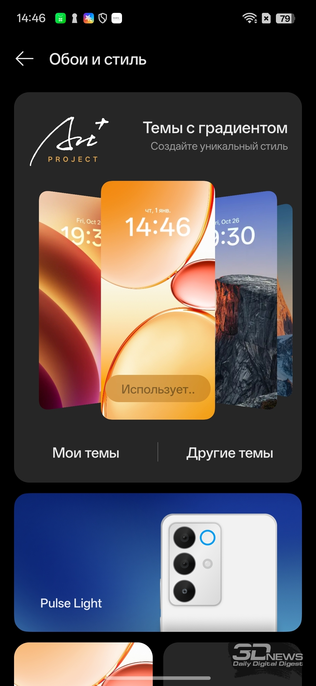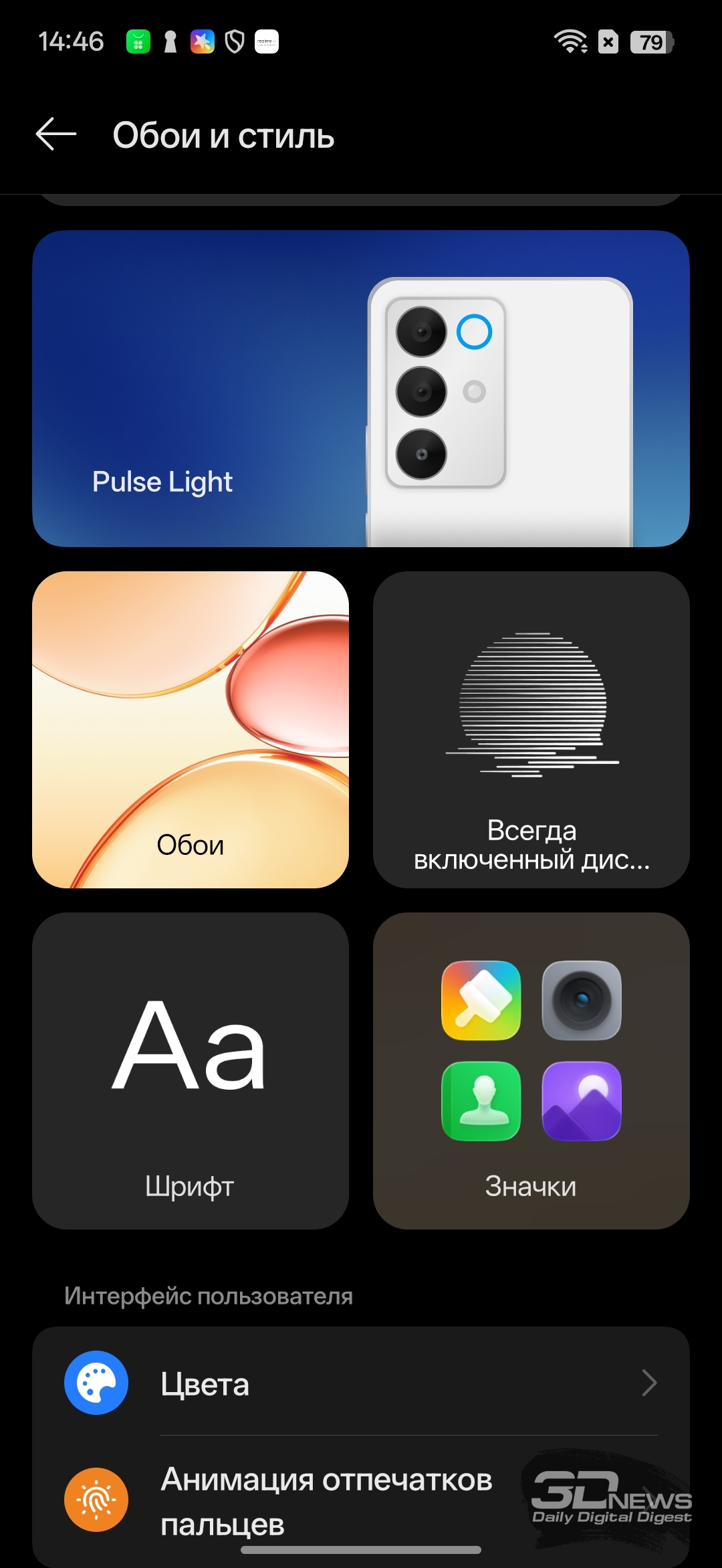 ⇡#ДизайнГлобально внешне realme C85 не изменился. Речь не только о том, что сохранилась сама концепция защищенного смартфона, который выглядит «обычно» (без резиновых бортиков, особой расцветки и других примет, кричащих «Да, меня так просто не сломать!»), но и о конкретных чертах. Например, остался прежним блок камер с тремя расположенными вертикально «объективами». Правда, камера теперь официально одна, realme отказалась от вспомогательного модуля, который и так нес скорее функцию «лишней строчки в резюме». За двумя стеклами из трех прячутся некий датчик (вероятно, это ИК-порт) и микрофон. При этом изменилась форма вспышки — тут опять двойной светодиод, но теперь он круглый, и добавился новый декоративный элемент, диод Pulse Light. Тот же Pulse Light мы видели на модели realme 14 5G. Он загорается при получении уведомлений и подключении зарядного устройства, а также сообщает о критическом уровне этого самого заряда. Мерцает и пульсирует при поступающих звонках и в такт воспроизводимой музыке, реагирует на поворот смартфона или запуск игрового режима GT, а также синхронизируется с играми. Все это настраивается в параметрах смартфона, в любой момент диод можно отключить.