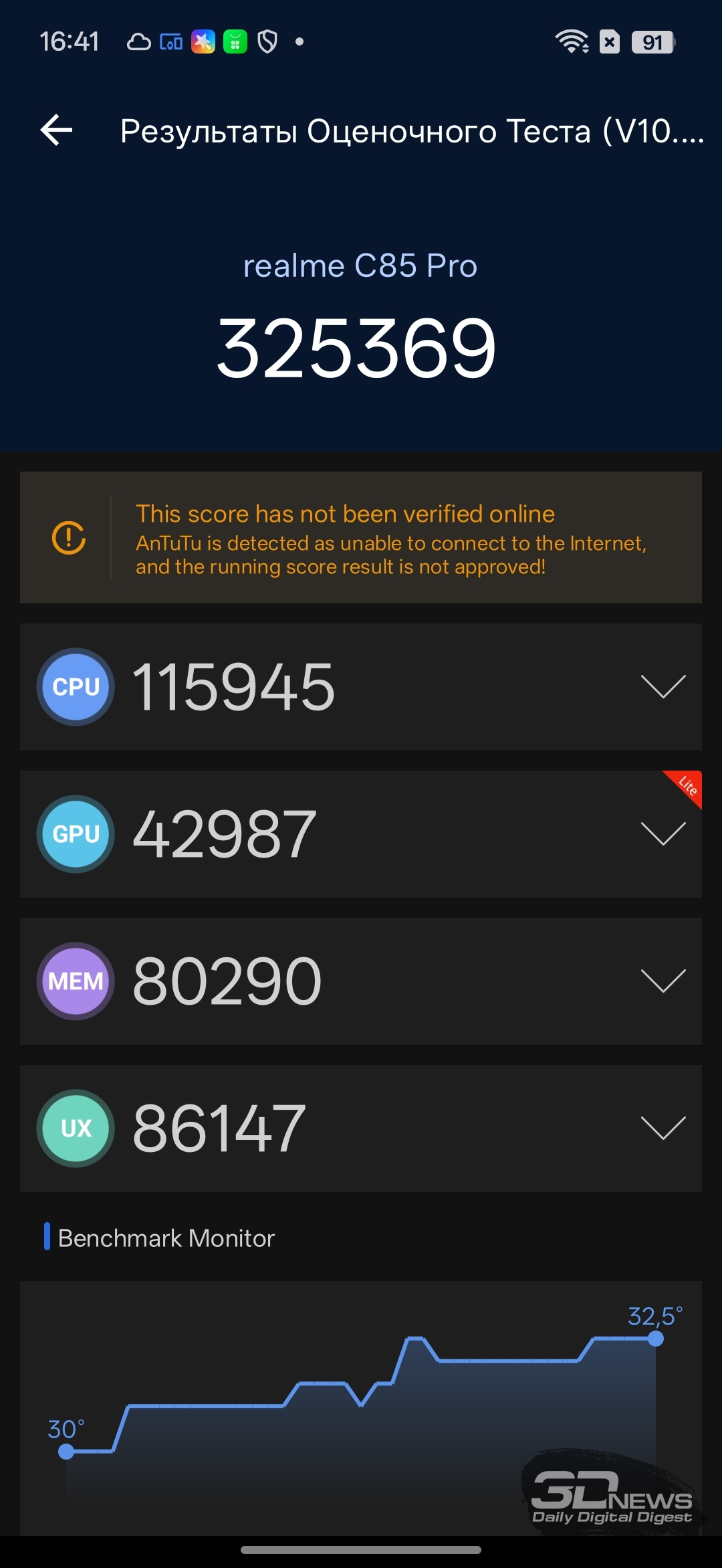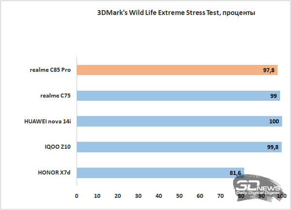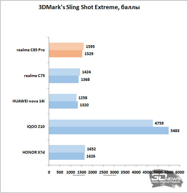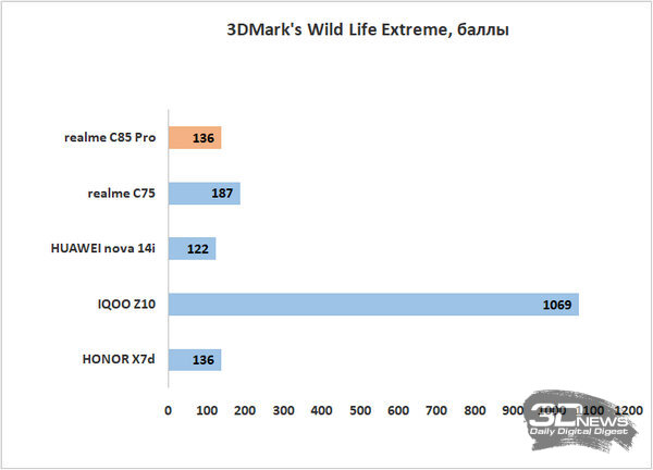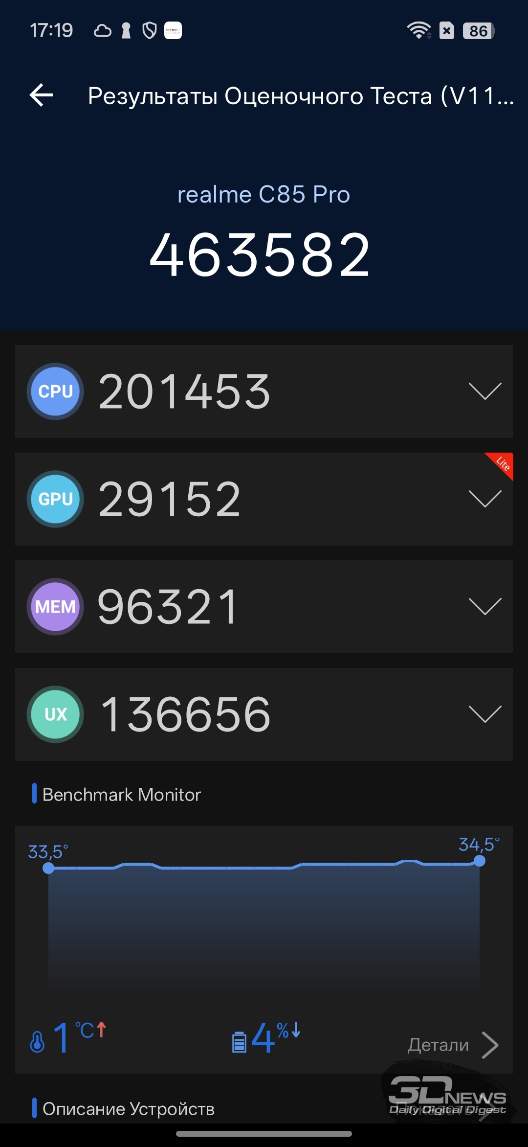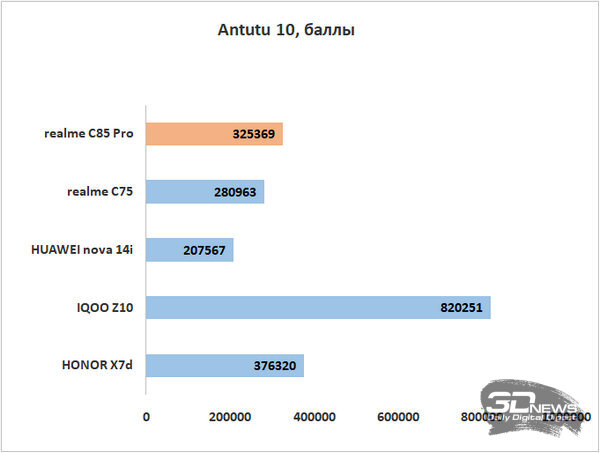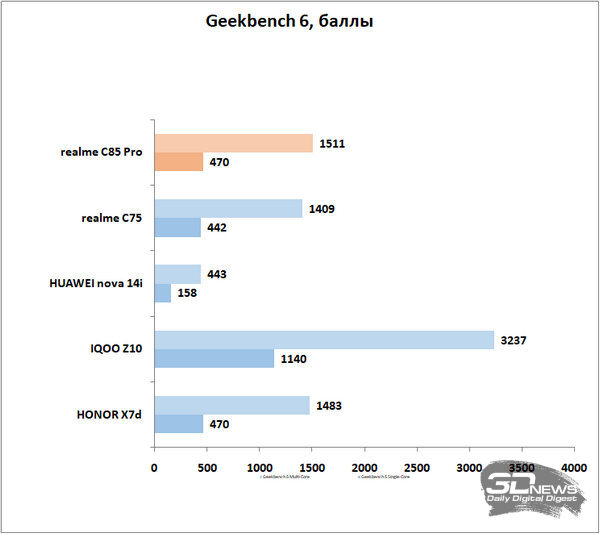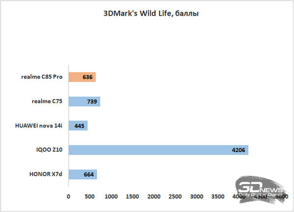 realme С85 Pro, цветовой охват в режиме цветопередачи «Кинематографический». Серый треугольник – охват DCI-P3, белый треугольник – охват realme С85 Pro В режиме «Кинематографический» цветовое пространство тоже широкое, как и в ярком режиме, но оно чуть более ровное и более приближенное к DCI-P3, как и заявлено в описании параметра. Средняя гамма пониженная — 2,11, кривые сильно падают в светлых оттенках. Цветовая температура эталонная (6 500 К), среднее отклонение DeltaE по таблице Color Checker составляет 3,19. В целом экран realme C85 Pro настроен нормально. В realme С85 Pro динамик, увы, монофонический, причем не самого высокого качества. Но хотя бы громкости ему хватает. Мини-джека нет, но есть поддержка ключевых профилей Bluetooth (LDAC, aptX). Bluetooth – версии 5.0. Со звуком у смартфона все предельно просто и примитивно. ⇡#«Железо» и производительностьВ realme C85 Pro установлена аппаратная платформа Qualcomm Snapdragon 685 – и это, безусловно, самое слабое место устройства. Эта платформа, вышедшая еще в 2023 году (а по факту, при минимальных отличиях от Snapdragon 680, можно считать, что и в 2021 году), несет в себе четыре ядра Kryo 265 Gold (модифицированные ARM Cortex-A73) с частотой 2,8 ГГц и четыре Kryo 265 Silver (модифицированные ARM Cortex-A53) с частотой 1,8 ГГц в компании с графической подсистемой Adreno 610 с частотой 950 МГц (с поддержкой Vulkan 1.1). Техпроцесс – условные 6 нм. Есть нейронный процессор невысокого уровня — Hexagon 686. Я уже упоминал выше небыструю работу смартфона в приложениях и медленную их загрузку — здесь остается только повторить это, дополнив еще и результатами синтетических тестов. Интересно, что постепенно эти самые результаты на смартфонах с платформой Snapdragon 685 улучшаются, — тут и программное колдовство присутствует, и оперативная память ставится чуть более быстрая. Но серьезных прорывов ожидать не приходится — да и требования операционной системы растут быстрее, чем производительность смартфонов с устаревшим чипсетом. Среди собратьев по своему ценовому диапазону realme C85 Pro смотрится в целом приемлемо, но любой конкурент с платформой даже минимально более высокого уровня оказывается в иной лиге. Что касается производительности в играх, то realme C85 Pro способен запустить большинство современных проектов и в соревновательных выдавать до 60 кадров в секунду — но с потерями, картинка будет слегка подтормаживать, как и в иных обычных приложениях. Результаты синтетических тестов realme C85 Pro