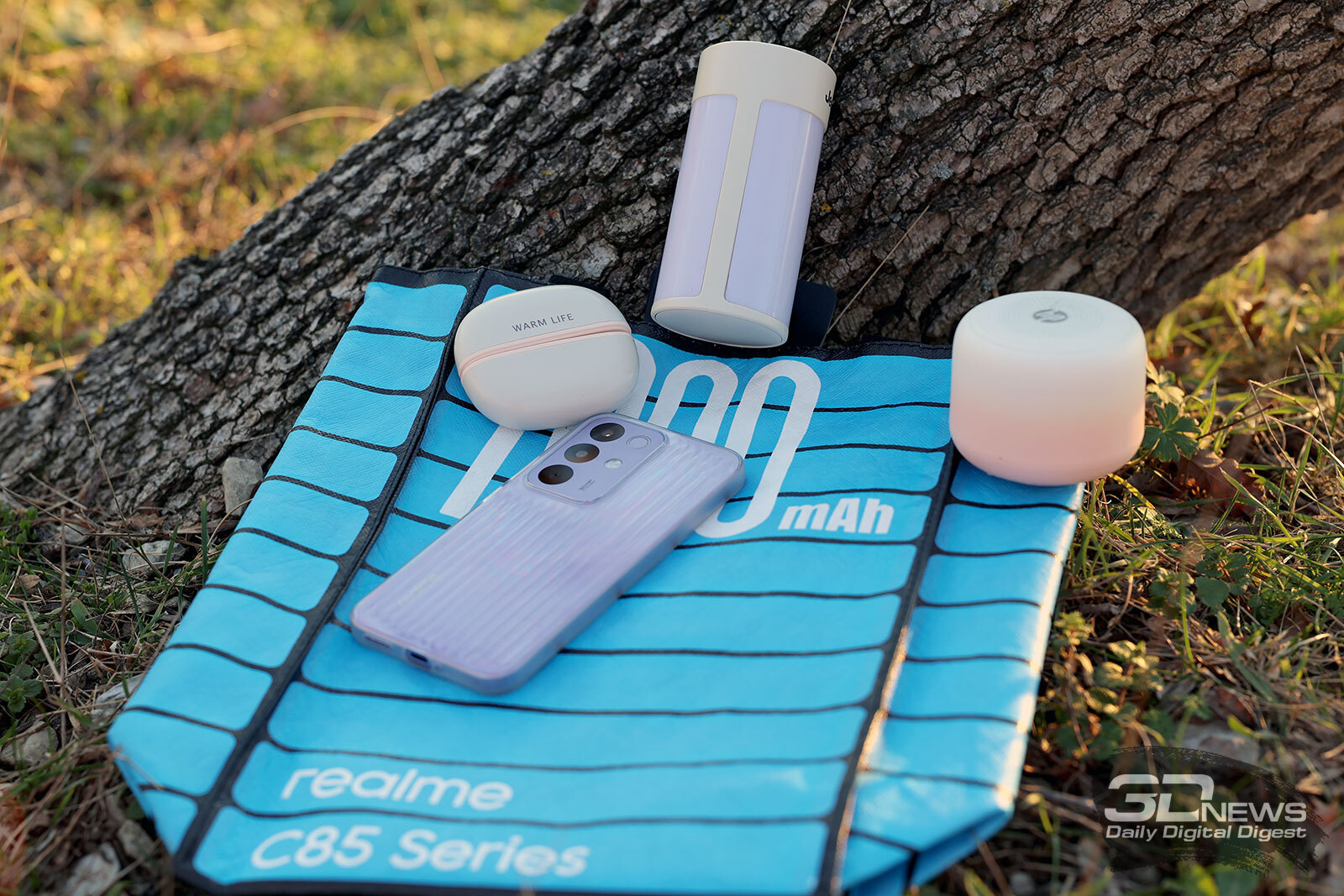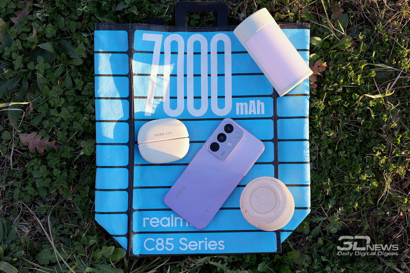 Смотреть все изображения (17) realme С85 Pro снимает видео в разрешении вплоть до Full HD, частота — максимум 30 кадров в секунду. Есть программный зум – как при помощи традиционного ползунка, так и при выборе значка (только двукратный). Есть фильтры, возможность снимать видео с ретушью, но без искусственного боке. Есть цифровая стабилизация, но она не оказывает очень уж значимого эффекта. Да и в целом качество съемки видео невысокое. Фронтальная камера оснащена 8-мегапиксельным сенсором и объективом светосилой ƒ/2,0. Вспышки нет, фокус фиксирован. Качество съемки среднее – даже при хорошем освещении виден недостаток детализации, при слабом же освещении он становится совсем критическим. Опции ожидаемые: искусственное боке, настраиваемая (и способная изменить лицо до неузнаваемости — есть пример выше) ретушь, фильтры. ⇡#Автономная работаrealme C85 Pro получил кремний-углеродную батарею емкостью 26,6 Вт·ч (7000 мА·ч, 3,8 В). С учетом простенькой и не требовательной к ресурсам аппаратной платформы, а также экрана на органических светодиодах можно рассчитывать на очень серьезную автономность. И не только рассчитывать, но и получать ее — не зря гаджет позиционируется авторами как в том числе походное решение. Об этом намекают и фото в обзоре — вместе со смартфоном прислали также походную лампу, грелку для рук и колонку, все от noname-производителей, правда, в том числе откровенно фейковых: к примеру, колонка от «HP», а лампа от «Jeep». Что касается автономности, то смартфон я заряжал примерно раз в два дня. Это с распределенной стандартной нагрузкой. Задачи высокой интенсивности утомляют смартфон быстрее. К примеру, в тесте с воспроизведением Full HD-видео на максимальной яркости, с включенным Wi-Fi realme C85 Pro продержался более 21 часа. Очень хорошо, но у нас в анамнезе уже много смартфонов, способных играть видео больше суток. В комплекте со смартфоном поставляется адаптер на 45 Вт, благодаря которому полностью восполнить заряд можно примерно за час сорок пять минут. Есть обходная зарядка (то есть подача питания в обход батареи — может быть полезно в играх) и обратная зарядка по кабелю. ⇡#ЗаключениеУ realme получился аппарат с узкой специализацией — смартфон-выживальщик, смартфон-походник. Скромная (уже слишком скромная) аппаратная начинка, одинарная и не слишком выдающаяся камера, серьезные габариты (но дизайн не лишен определенного изящества). И при этом совершенно неубиваемый корпус, который выживет при погружении в жидкости 36 (!) типов и выдержит падения с довольно серьезной высоты. Ну и очень емкая батарея. При этом есть у realme C85 Pro и кое-какие необычные для гаджета со столь брутальным образом козыри в рукаве — к примеру, яркий AMOLED-экран с Full HD-разрешением и поддержкой (пусть и сугубо формальной) очень высокой частоты обновления или хорошо работающий портретный режим. Достоинства: