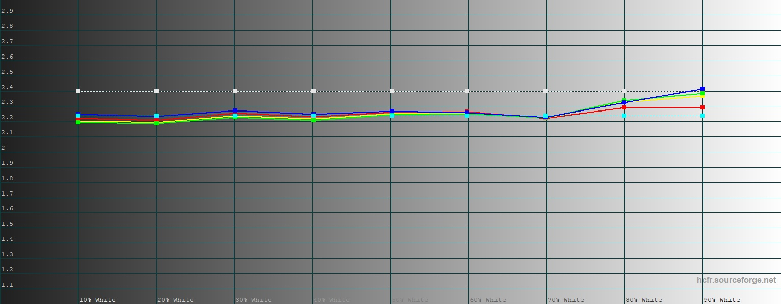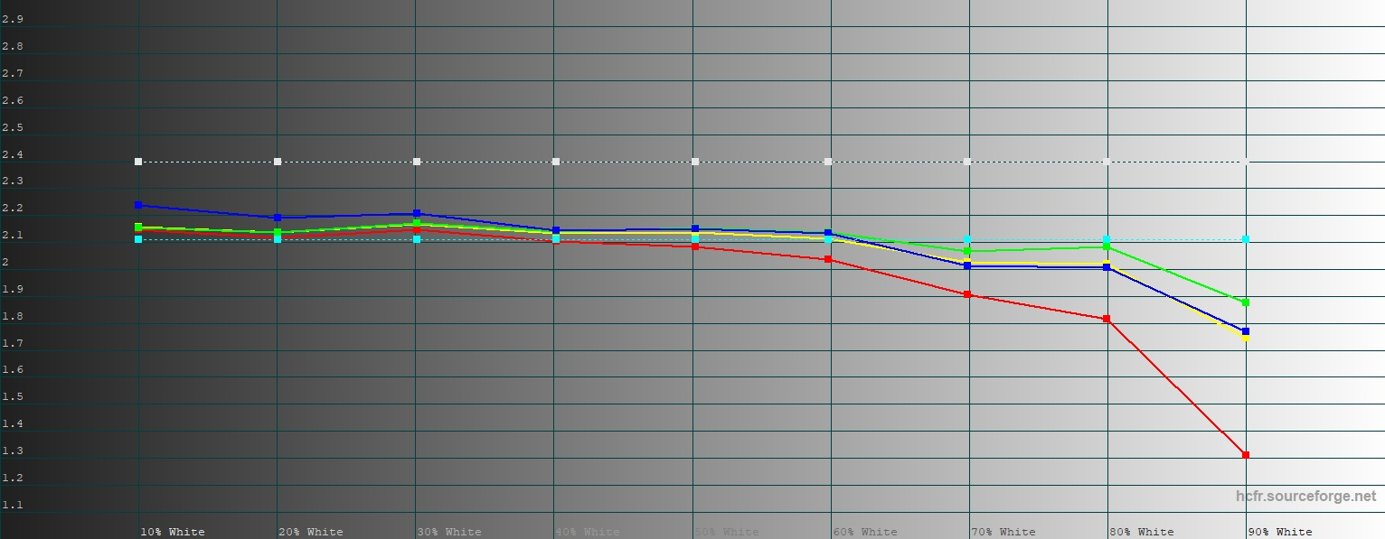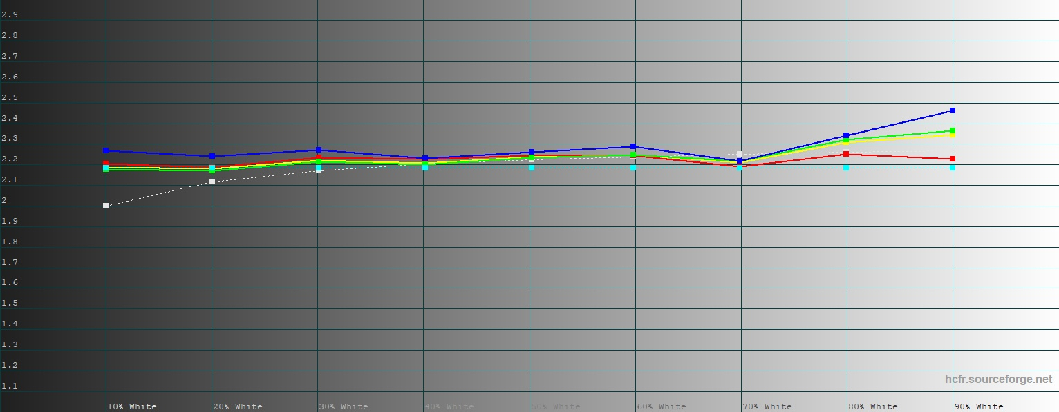 realme С85 Pro, цветовой охват в режиме цветопередачи «Яркий». Серый треугольник – охват DCI-P3, белый треугольник – охват realme С85 Pro В режиме «Яркий» цветовое пространство приближено к охвату DCI-P3, но несколько смещено и даже расширено относительно и так немаленького цветового охвата. Средняя гамма оттенков серого близка к норме — 2,24, кривые стабильны. Цветовая температура незначительно повышена — 7 100-7 400 К. Среднее отклонение DeltaE по расширенной палитре Color Checker (оттенки серого + широкий набор цветовых оттенков) составляет 3,16 (при норме 3 и эталонном значении 2).
