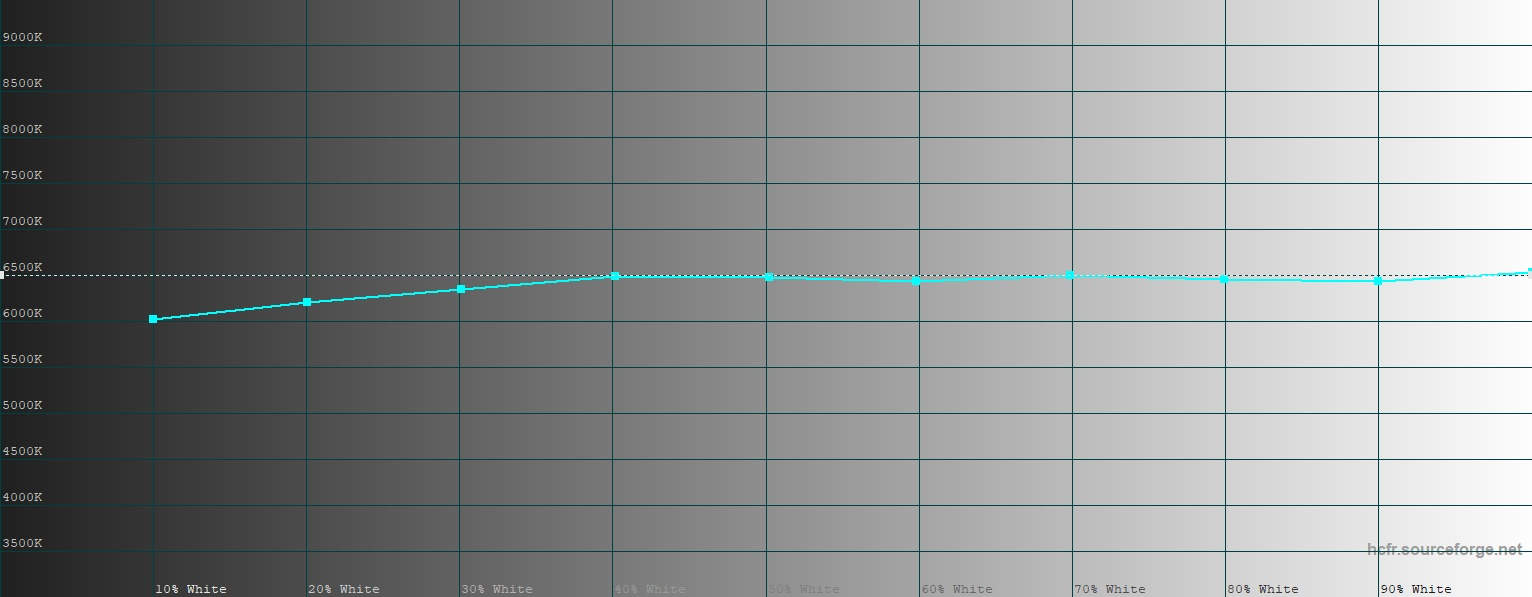 realme С85 Pro, цветовая температура в режиме цветопередачи «Кинематографический». Голубая линия – показатели realme С85 Pro, пунктирная – эталонная температура
